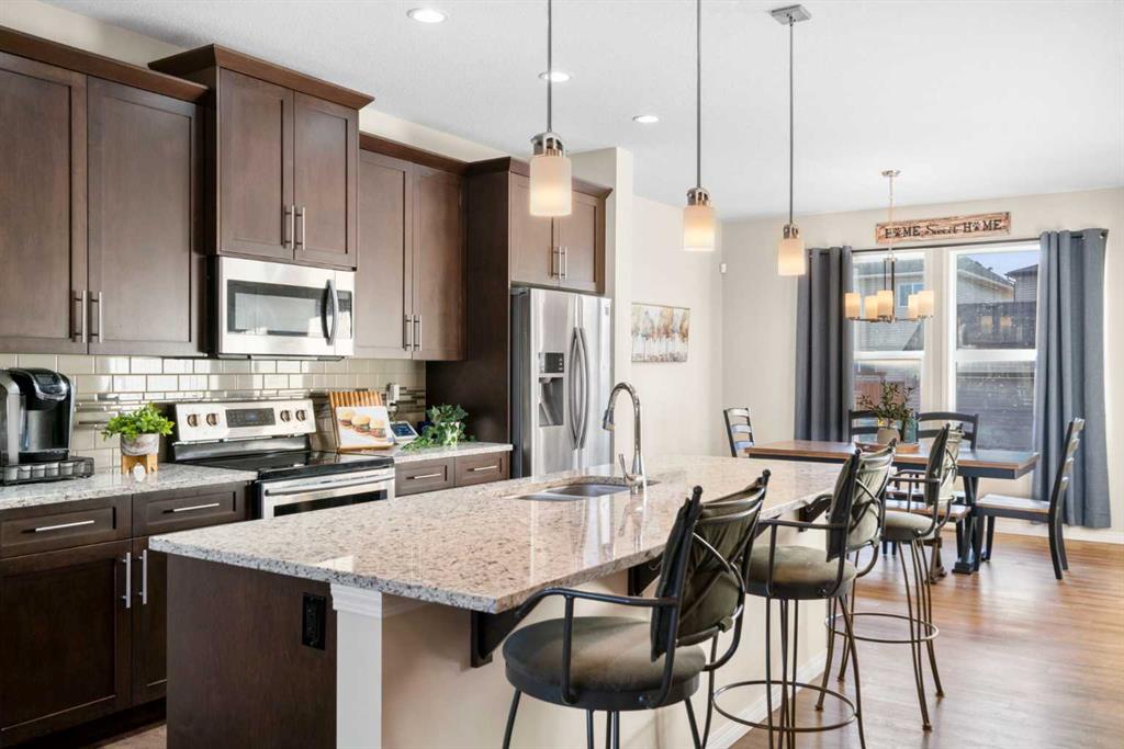 The east-facing front porch is the perfect place to enjoy your morning coffee while taking in views of the park and green space across the street. Inside, the main floor features an open-concept layout with vinyl plank flooring and large front-facing windows that provide abundant natural light. The kitchen is thoughtfully designed with granite countertops, a central island with seating, tile backsplash, stainless steel appliances, and ample storage. The adjoining dining area overlooks the backyard, while a convenient 2-piece bath, rear mudroom entry, and main-level laundry add everyday functionality.