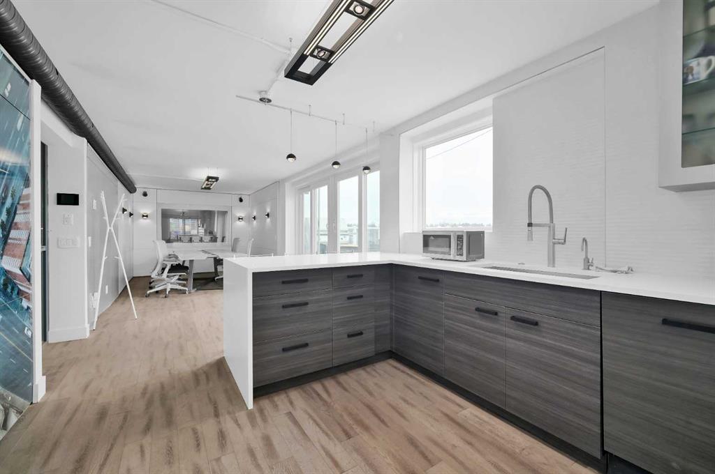 The opposite wing is currently configured for business use with multiple office/flex rooms, 3 piece bathroom , second kitchen, dining area with with walkout access to an additional outdoor patio, and a living/lounge space, with walkout access to a balcony with more city views. The office spaces offer excellent versatility and can easily be converted into bedrooms to suit your needs.
