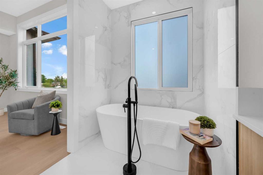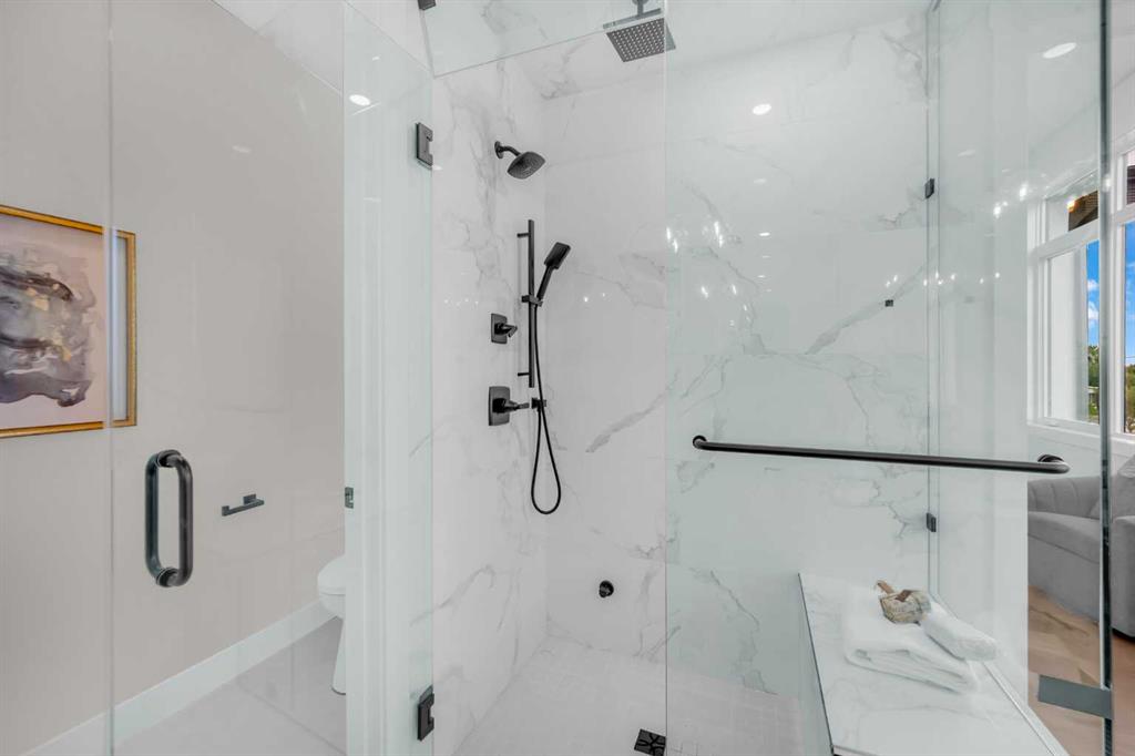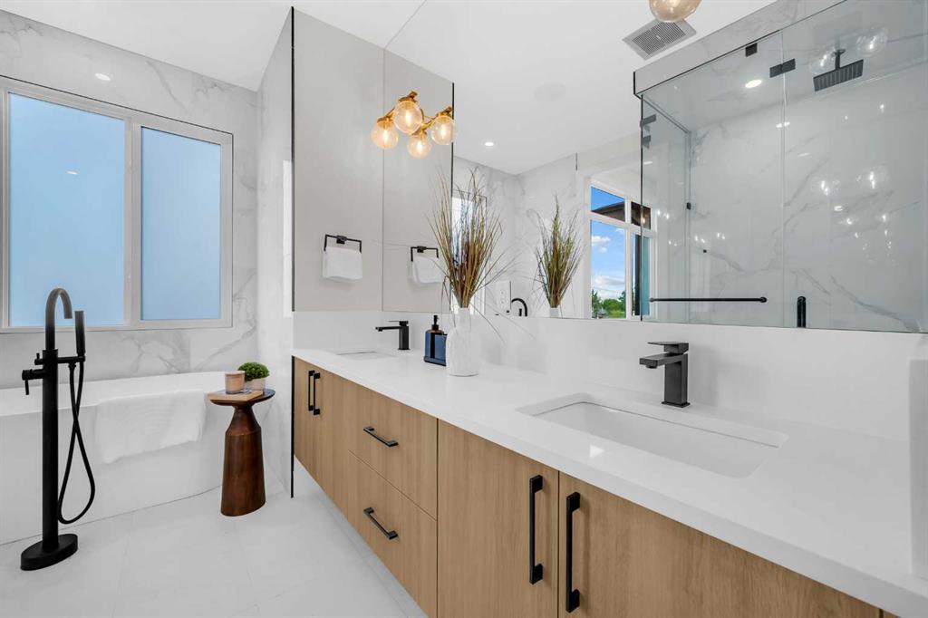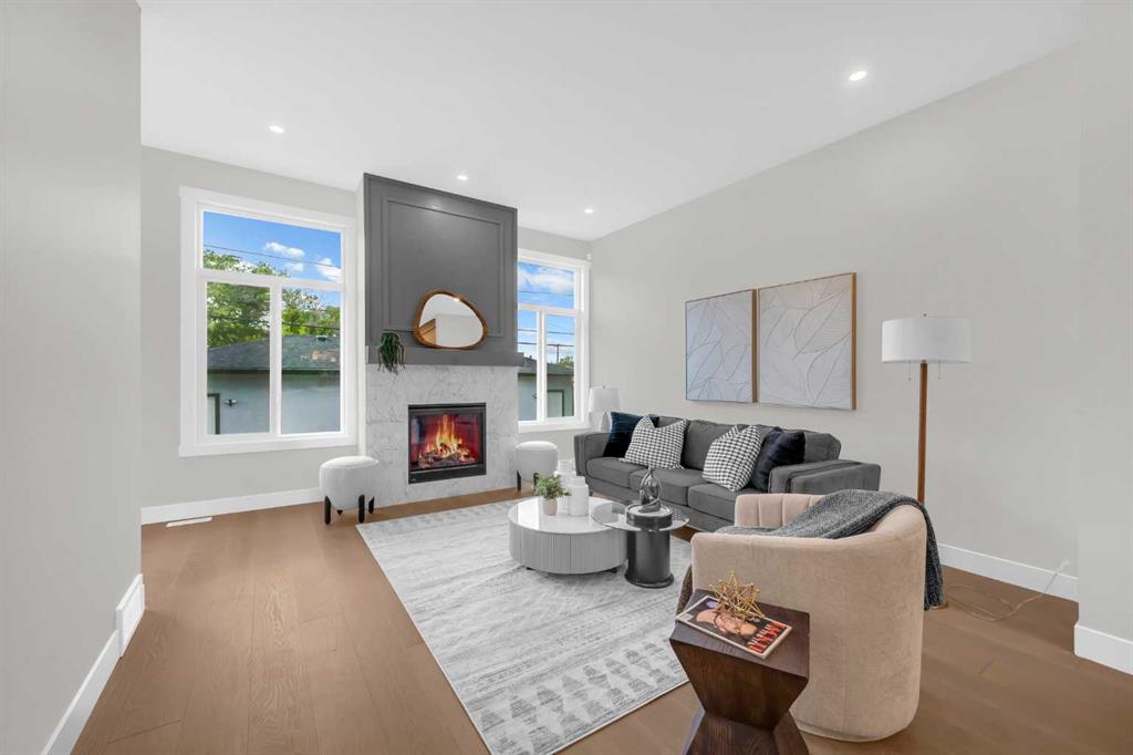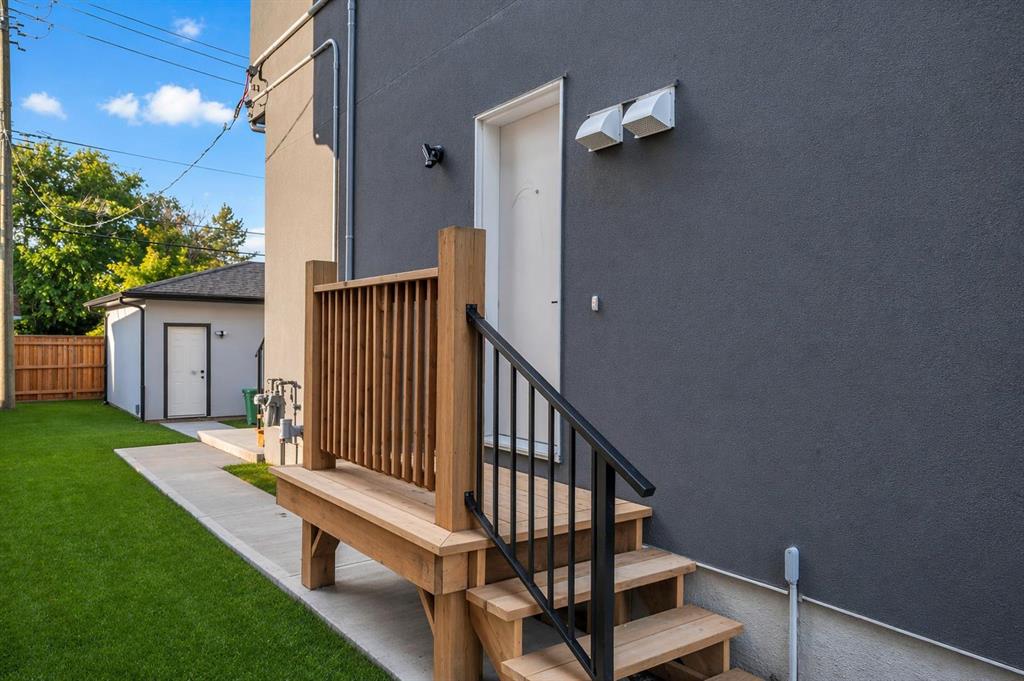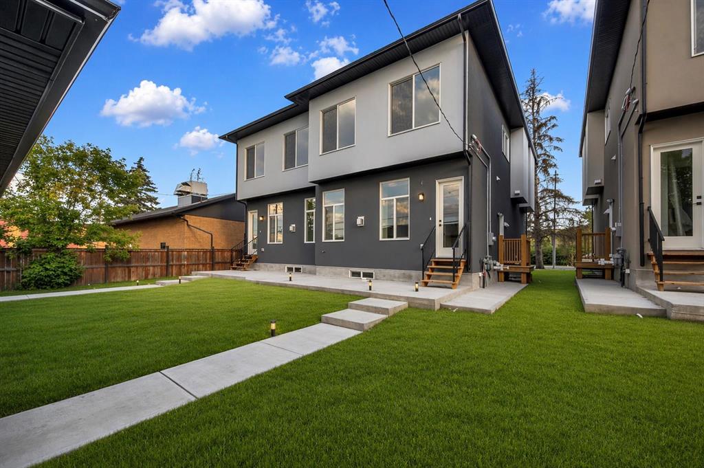 Calling all Investors! Looking for a brand new SXS Duplex with legal basement suites? This 8114 unit can be sold together with attached 8112 to provide an excellent cash flowing opportunity with the convenience of having all construction materials and components still under New Home Warranty. Both 8114 and 8112 are rented on long term leases with tenants who would prefer to stay. This unit rents monthly at $3100 for the upper suite + 70% utlitles and $1250 + 30% utilities for the lower suite. Amazing home boasting elevated design and incredible functionality, featuring a legal 2-bedroom basement suite and a sunny south exposed front with expansive valley views from the upper floor. Every detail was thoughtfully selected, from the wide-plank modern floors to the curated lighting and premium finishes throughout. Step inside to a bright, open-concept main floor with 10′ ceilings, oversized windows and neutral tones that create an airy, inviting vibe. The large, well-lit dining room is perfect for bigger families and/or hosting guests and shows off a vibrant and colourful feature wall, which flows seamlessly into a designer kitchen featuring modern warm toned cabinetry, paired with beautifully coloured glass backsplash, quartz countertops, matte black hardware, a huge walk-in pantry with built-in shelving, and a perfect-sized center island with bar seating with more natural wood tones, bringing everything together beautifully. The upgraded stainless steel appliance package includes an oversized sub zero fridge with french doors, a gas cooktop with stylish hood fan, and a thoughtfully placed wall oven and microwave. The rear living room is wide and spacious featuring additional large windows plus a cozy gas fireplace with stone surround and custom mantle, and which leads you out to the large backyard, which features an oversized concrete pad, perfect for end of the day BBQ’s and lounging. An enclosed mudroom with a large closet area and a sleek powder room that comes with a raised matte black sink complete the mainfloor. Upstairs contains the three large bedrooms, all with trayed ceilings, including the primary bedroom which is a true retreat that features a large walk-in closet with several custom built-ins plus a hotel like ensuite. Enjoy heated tile flooring, dual sinks, quartz countertops, matching tile surrounds, plus a free standing soaker tub and an oversized glass shower with rain shower head and roughed-in for steam. The upper laundry room comes with a sink, quartz countertops, additional wood toned cabinetry, and is situated beside the stylish full bathroom which features a tiled tub/shower combo. Downstairs features the thoughtfully designed legal 2 bedroom suite and features 9′ ceilings, luxury vinyl plank flooring, wonderfully warm toned cabinetry, stainless steel appliances and lots of pot lighting. A full bathroom with elegant tile is also featured plus a dedicated laundry room, separate side entrance and storage, making this perfect for rental income.
