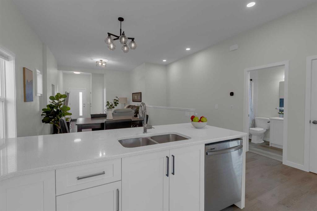 Modern BUNGALOW living with soaring 10’ ceilings, a heated DOUBLE DETACHED 19’x21′ GARAGE, and an unbeatable location across from a children’s park in Coopers Crossing! Built in 2022 and offering 1,119 sq ft of thoughtfully designed space, this 2 Bedroom, 2 Full Bathroom home delivers stylish single level living with an open concept layout and clean contemporary finishes throughout. Step inside and immediately appreciate the airy feel created by the tall ceilings and expansive main living area finished in durable VINYL PLANK flooring. The bright white Kitchen is both timeless and functional, featuring quartz countertops, crisp white cabinetry, stainless steel appliances, and a long peninsula that offers generous prep space and a comfortable eating area, perfect for casual meals or entertaining guests. The Kitchen flows seamlessly into the Dining and Living areas, creating an inviting space ideal for everyday living. The spacious Primary Suite is designed as a comfortable retreat, complete with a large WALK IN CLOSET and a beautifully finished tiled Ensuite featuring a glass shower for a clean, modern look. A second Bedroom and full Bathroom provide flexibility for guests, a home office, or small family living. The unfinished Basement offers excellent future potential, ready for your vision with room to expand your living space exactly how you need it with 3 large windows and rough in plumbing for a bathroom. Outside, you’ll appreciate the fenced yard, heated and insulated DOUBLE DETACHED GARAGE, offering year round comfort and valuable storage. Conveniently close to 40th Avenue for quick access into Calgary, this home combines convenience, modern design, and low maintenance living in one of Airdrie’s most desirable communities. Welcome home!