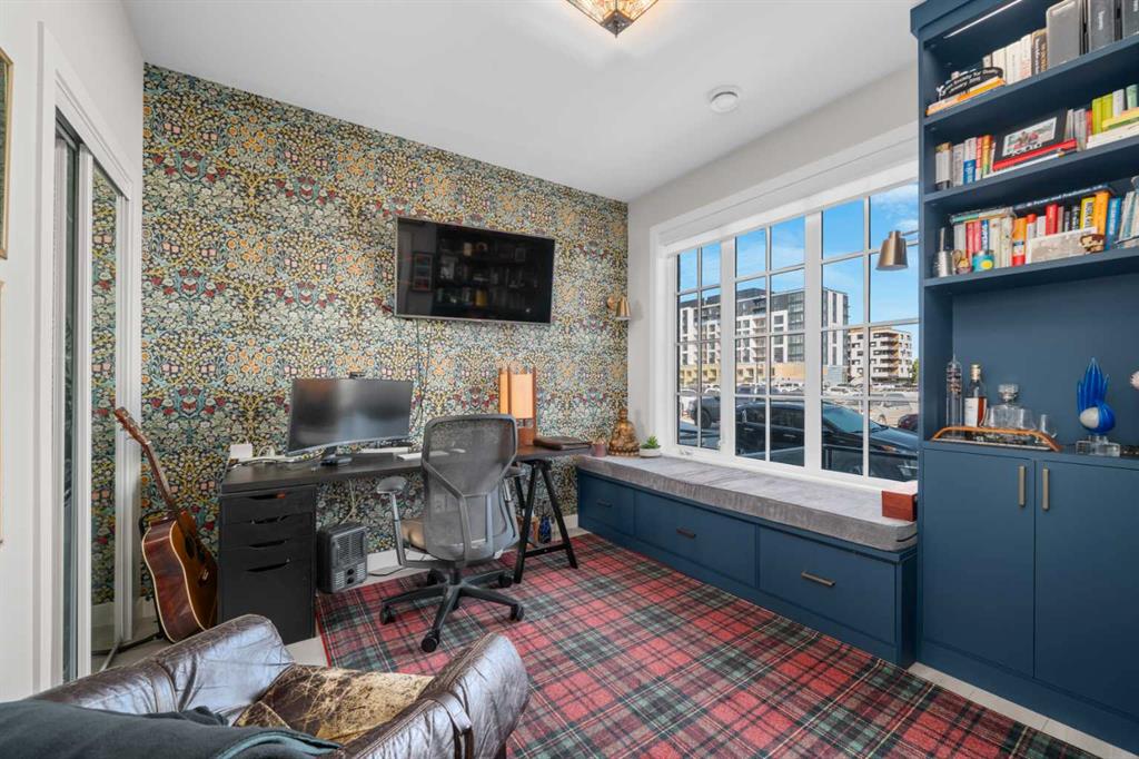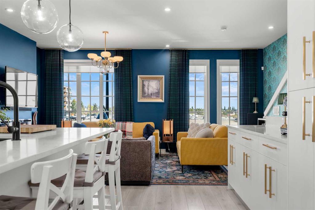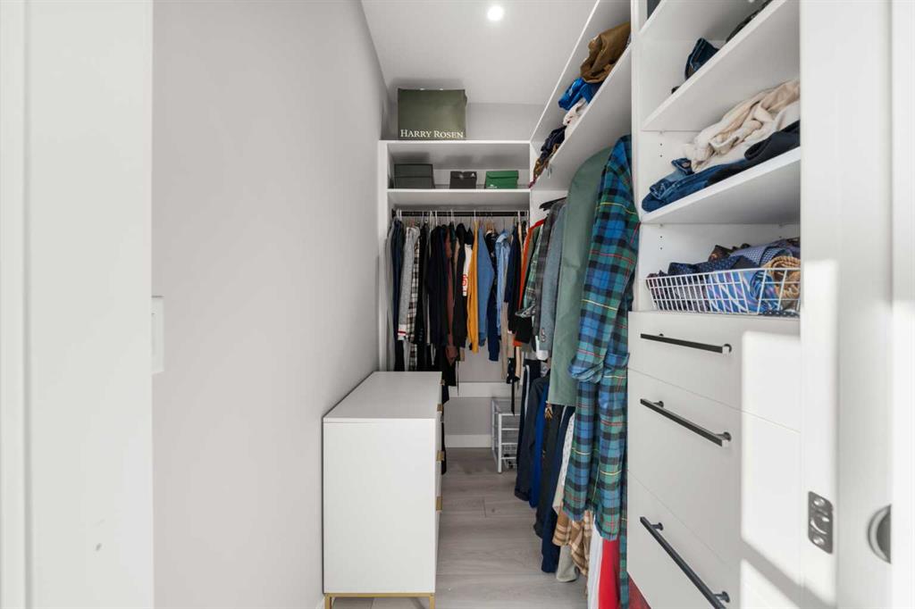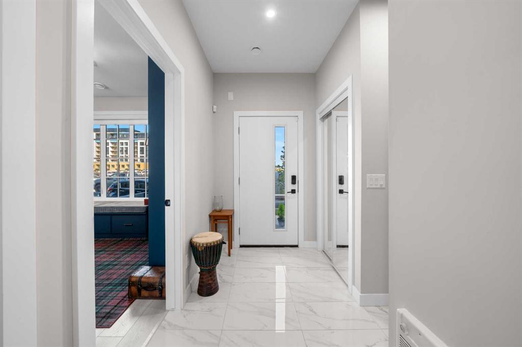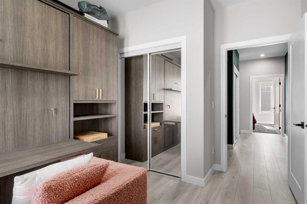 Welcome to 8161 8 Avenue SW in the community of West Springs. This 4 bedroom, 3 bathroom townhome is tastefully designed with modern finishes, functional upgrades, and a layout that balances style and comfort. Step inside to discover 9 ft ceilings, wide plank laminate flooring, and integrated LED lighting throughout. The chef’s kitchen is equipped with quartz countertops, a paneled fridge, gas range stove, and soft-close cabinetry with smart storage solutions. The living area features a 50-inch electric fireplace and opens onto a private balcony, creating the perfect space for both entertaining and relaxing. Custom details enhance the home, including a Murphy bed, custom drapes, premium Delta plumbing fixtures, and an A/C unit for year-round comfort. Environmentally friendly touches include WaterSense-certified fixtures and toilets. Over $50,000 has been invested in California Closets, bringing exceptional storage and organization to every corner of the home. With its large hallways and thoughtfully planned design, this home feels bright, open, and inviting. The location adds to its appeal—with views of the new park in west district, schools are just 5 minutes away, trendy coffee shops and cafes only 2 minutes from your door, and parks and walking paths are just steps away.