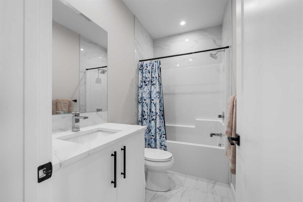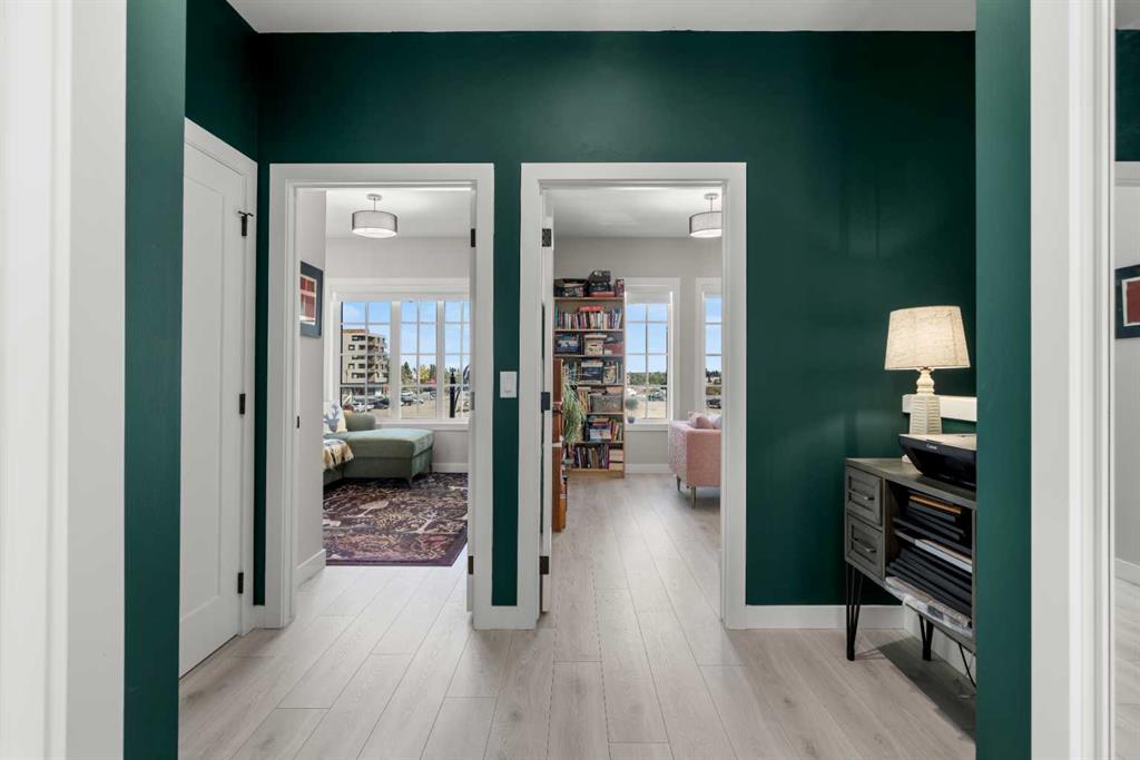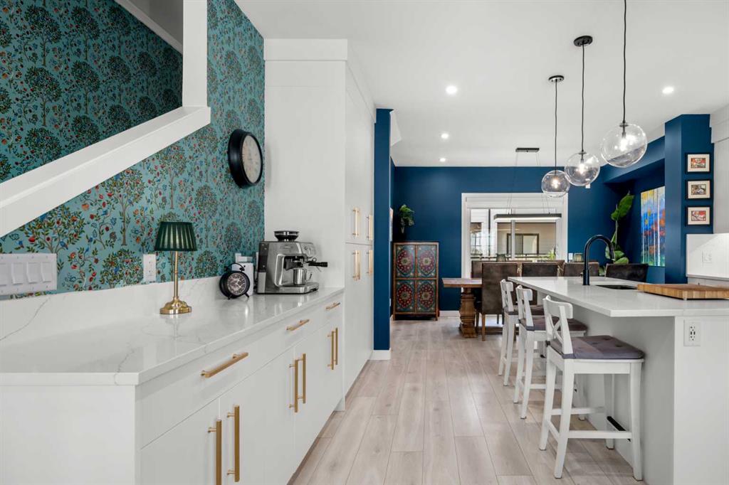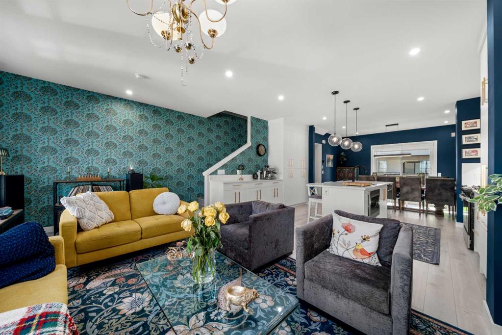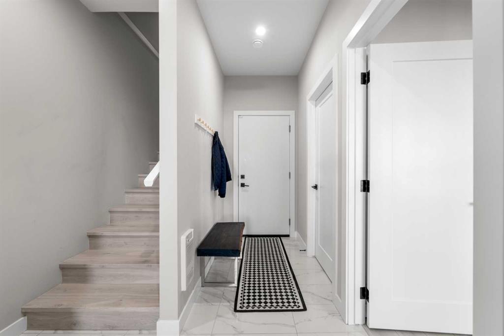 Welcome to 8161 8 Avenue SW in the community of West Springs. This 4 bedroom, 3 bathroom townhome is tastefully designed with modern finishes, functional upgrades, and a layout that balances style and comfort. Step inside to discover 9 ft ceilings, wide plank laminate flooring, and integrated LED lighting throughout. The chef’s kitchen is equipped with quartz countertops, a paneled fridge, gas range stove, and soft-close cabinetry with smart storage solutions. The living area features a 50-inch electric fireplace and opens onto a private balcony, creating the perfect space for both entertaining and relaxing. Custom details enhance the home, including a Murphy bed, custom drapes, premium Delta plumbing fixtures, and an A/C unit for year-round comfort. Environmentally friendly touches include WaterSense-certified fixtures and toilets. Over $50,000 has been invested in California Closets, bringing exceptional storage and organization to every corner of the home. With its large hallways and thoughtfully planned design, this home feels bright, open, and inviting. The location adds to its appeal—with views of the new park in west district, schools are just 5 minutes away, trendy coffee shops and cafes only 2 minutes from your door, and parks and walking paths are just steps away.