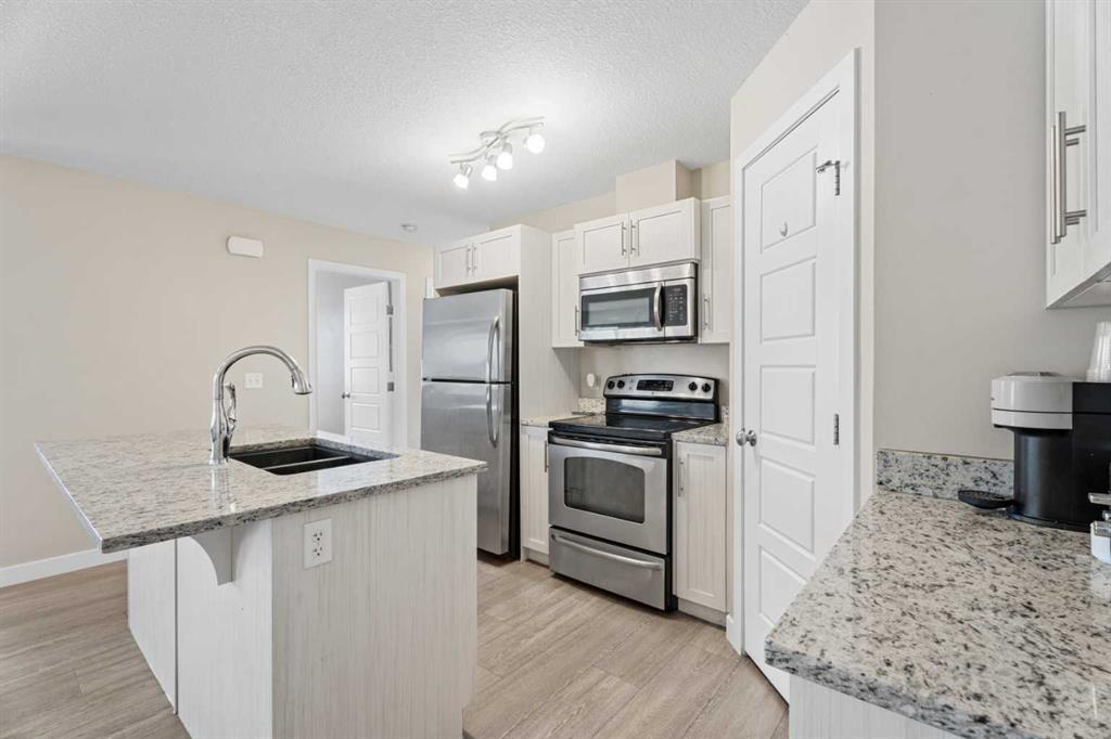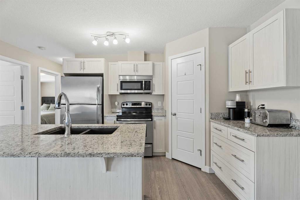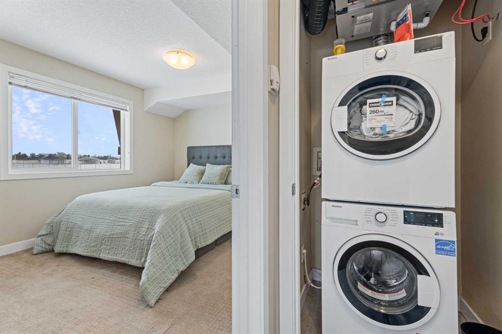 **OPEN HOUSE SUNDAY JAN 24, 2-3pm** Located in the Chinook Crossing complex in Prairie Springs, this 2 bedroom, 2 bathroom stacked townhouse offers low-maintenance living with an upscale feel perfectly positioned beside Chinook Winds Regional Park. A private entry leads up to a bright, open-concept main level with a comfortable living area and a stylish kitchen featuring white cabinetry, stainless steel appliances, a corner pantry, and a centre island with breakfast bar, as well as plenty of space to style a dining area to suit your lifestyle. The full 4-piece bathroom serves the main living space and has direct access to the second bedroom, while the primary bedroom is tucked at the back with its own 3-piece ensuite and generous walk-in closet. In-suite laundry and extra storage keep daily living streamlined. Outside, you’re within walking distance of Chinook Winds Regional Park—with its spray park, playgrounds, sports fields, skate park, and pathways—and just a short drive to tennis courts, schools, shopping, restaurants, and major routes like Yankee Valley Boulevard and the QEII, creating a refined yet functional home base in SW Airdrie.