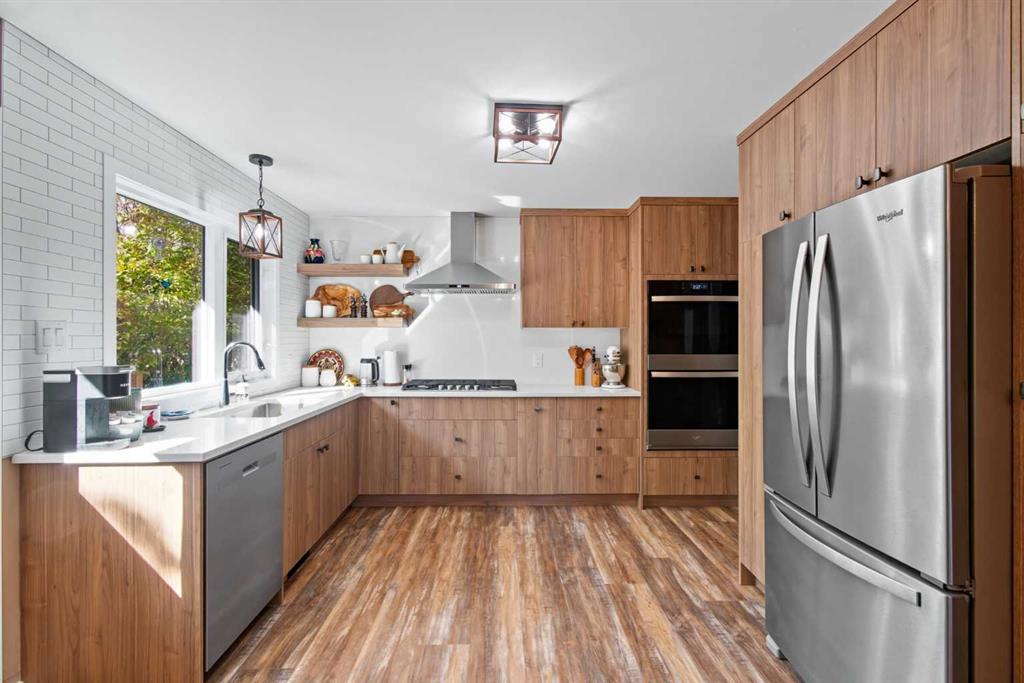 Tastefully updated, this home features an open-concept main floor with brand-new cabinets, quartz countertops, a built-in gas range, dual ovens, luxury vinyl plank flooring, and modern lighting. Down the hall, you’ll find a sleek, updated bathroom with a barn door leading directly to the primary bedroom for added convenience, as well as a second bedroom. A third bedroom completes the main floor and is ideal as an office or nursery. On the lower level, a spacious recreation area is filled with natural light thanks to the south exposure and mid-level bi-level windows. A wet bar makes entertaining easy, while a fourth bedroom offers flexibility for guests or hobbies. A renovated bathroom and generous storage space complete this level. From the kitchen, take in views through brand-new windows of the freshly built deck and fence. The expansive backyard is a true retreat, featuring apple and birch willow trees, a fire pit, and landscaped outdoor space perfect for stargazing on warm nights.