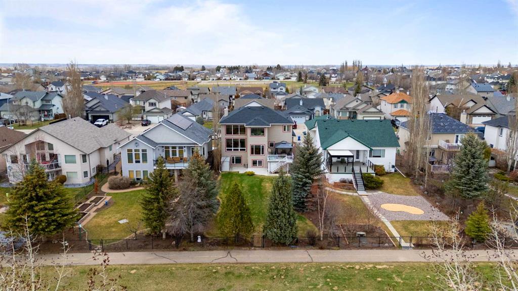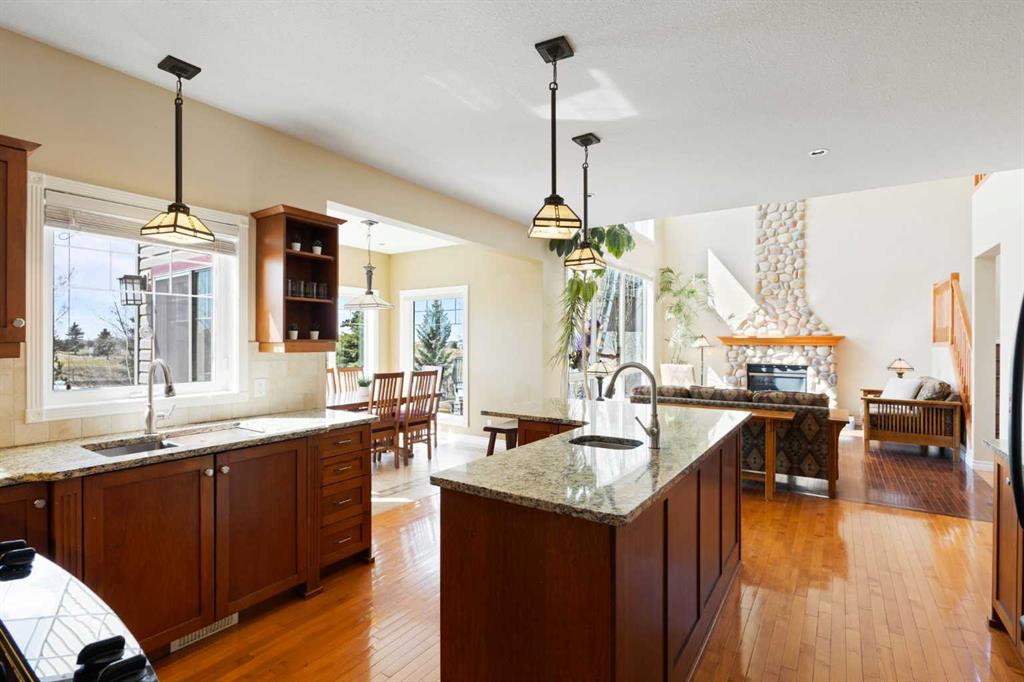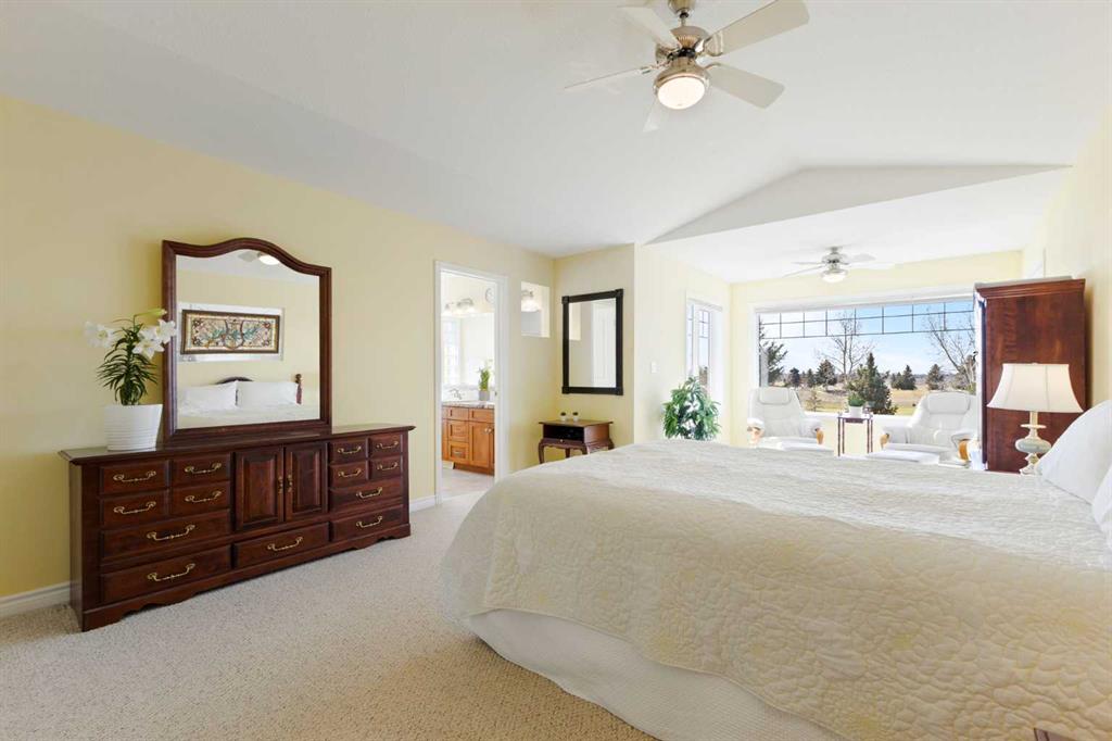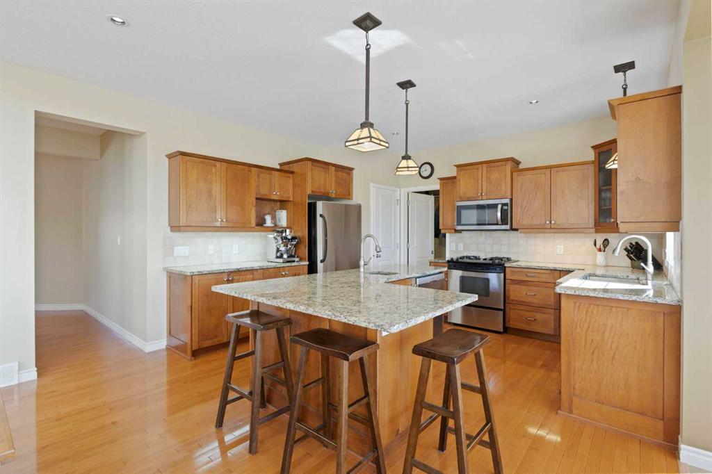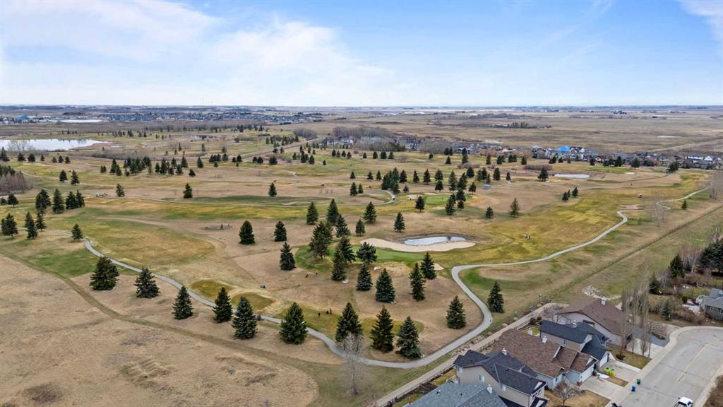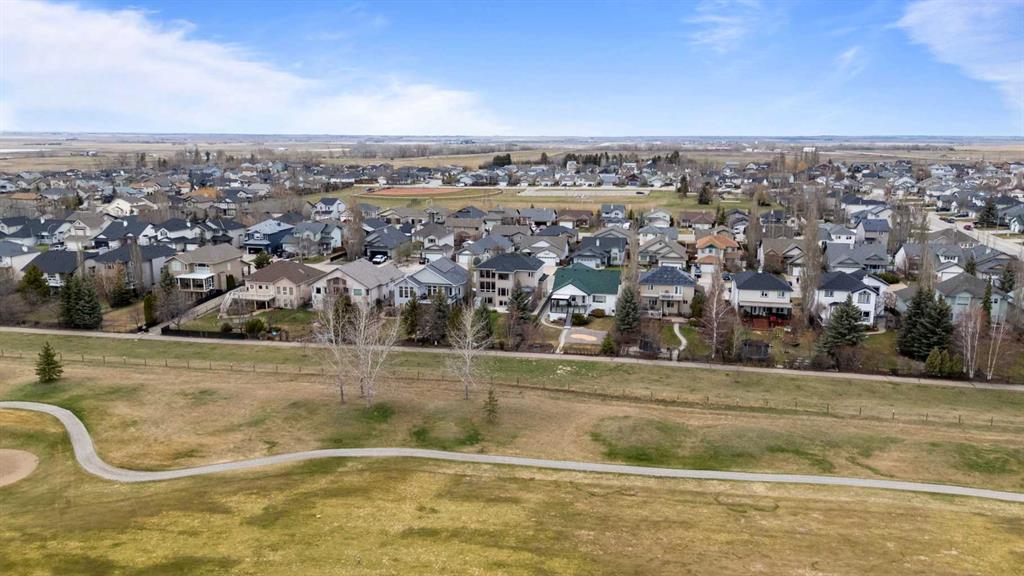 Discover refined living in this exceptional custom-built home, perfectly positioned on a sprawling lot with panoramic views of the Strathmore Golf Course. Thoughtfully designed with over 2,500 sq ft above grade and a fully developed walk-out basement, this home seamlessly blends sophistication, comfort, and practicality—ideal for both everyday living and elegant entertaining. Step inside to a breathtaking main floor where full-height vaulted ceilings and expansive windows draw in natural light and showcase the serene outdoor views. The open-concept living space is anchored by a striking rock-faced gas fireplace, while rich maple hardwood flooring and 9-foot ceilings add a touch of timeless elegance. The chef-inspired kitchen is both functional and beautiful, featuring custom maple cabinetry, a large center island with a prep sink, premium gas stove, a brand new Bosch dishwasher, and a spacious walk-in pantry. Adjacent to the kitchen, a bright breakfast nook leads to a large deck complete with a charming gazebo—an inviting space to unwind or entertain, all while overlooking the lush backyard and fairway beyond. Smart design continues throughout with main floor laundry, including a convenient laundry chute from the second floor, and abundant storage to keep your home organized with ease. Upstairs, retreat to a private primary suite boasting vaulted ceilings, a cozy sitting area with golf course views, a luxurious 5-piece ensuite, and a generous walk-in closet. Two additional bedrooms provide ample space for family or guests. The fully finished walk-out basement adds versatility with a spacious fourth bedroom, large recreation and media areas, and even more storage. Outside, the landscaped yard offers underground sprinklers, mature plantings, and plenty of space for kids, pets, or a garden oasis. To top it all off, this home is located within walking distance to the local public junior and senior high school—an unbeatable location for growing families. With brand new roof shingles and every detail meticulously maintained, this home is the total package: custom craftsmanship, an enviable setting, and thoughtful features throughout. Come experience it for yourself. Call your AWESOME REALTOR today!