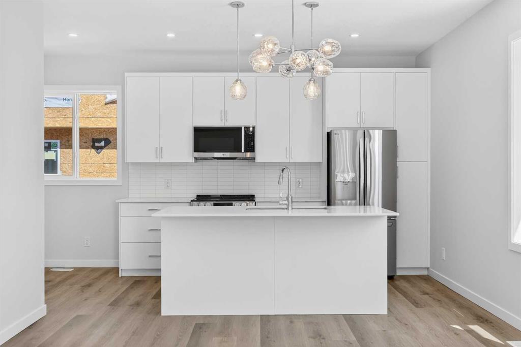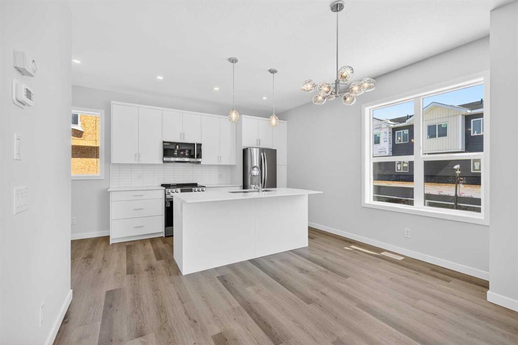 OPEN HOUSE on Saturday AND Sunday from 12-5pm. Please go to the Show Home located at 613-132 Red Embers Link NE for access. StreetSide proudly presents this exceptionally popular end-unit townhome, where expansive living areas meet modern comforts and sophisticated finishes. The thoughtfully designed floorplan features three spacious upper-level bedrooms and two and a half well appointed bathrooms, complemented by a versatile tech station on the main floor that is perfect for a workspace. The heart of the home is an inviting open-concept main floor, anchored by a large gourmet kitchen featuring a functional breakfast bar for casual dining. This bright living space transitions seamlessly to a private balcony, offering a perfect setting for outdoor relaxation. The interior showcases high end craftsmanship, including modern white slab-style cabinetry with a full bank of drawers for maximum storage. The kitchen is further elevated by polished white quartz countertops and a full suite of premium stainless steel appliances. Durable luxury vinyl flooring runs throughout the primary living areas, while the stairs and upper level are finished with plush carpet over an 8lb underlay for superior comfort. Additional conveniences include an attached double car garage, professionally maintained landscaping, and a lifestyle defined by maintenance free living. Located within Red Embers Point East, this home places you at the heart of the dynamic Redstone neighborhood. Enjoy the ease of a convenient location with quick access to major routes, including Stoney Trail, ensuring you are never far from the city’s best. The community is strategically positioned near future commercial developments, promising shops, services, dining, and entertainment options just moments from your doorstep.