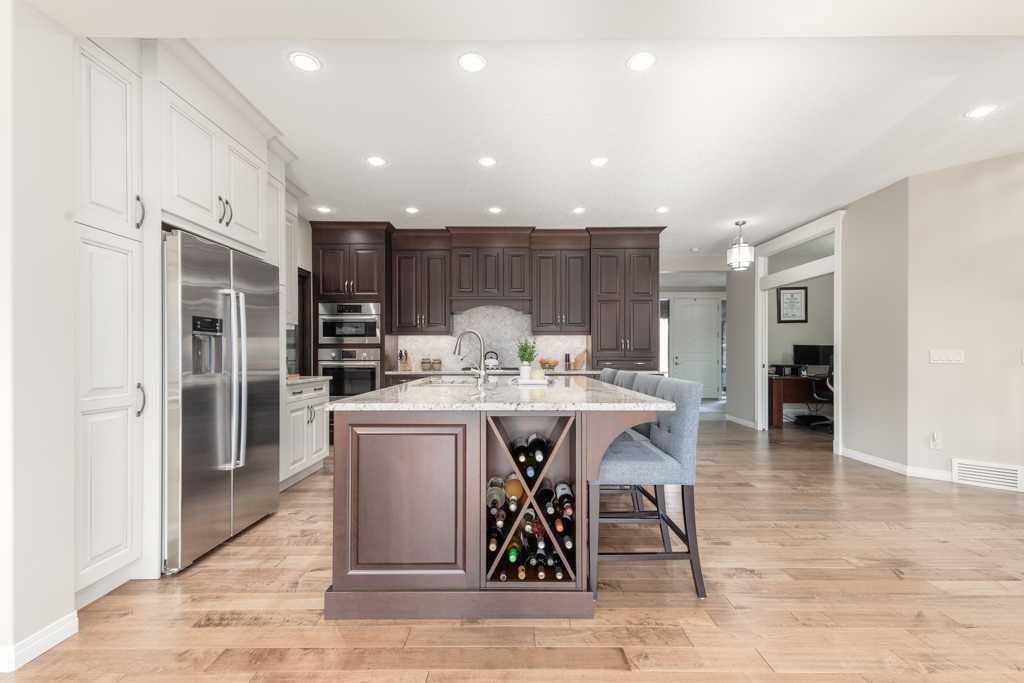 Exceptional custom-built estate by Albi Homes offering 5 bedrooms, 4.5 bathrooms, and over 4,400 sq. ft. of beautifully developed living space, ideally located on a quiet street in Aspen Rose within prestigious Aspen Woods. With 3,055 sq. ft. above grade plus a professionally finished 1,392 sq. ft. basement, this stunning home blends timeless design with everyday functionality and includes A/C for year-round comfort. The main level showcases a sophisticated formal dining room, private home office, functional mudroom, and an inviting living room anchored by a striking travertine stone fireplace. At the heart of the home is a chef-inspired kitchen featuring granite countertops, Legacy cabinetry, premium Bosch appliances, a gas cooktop, built-in wall oven and microwave, a spacious walk-in pantry, and an elegant Carrara herringbone backsplash. Engineered hardwood flooring and rounded wall corners add warmth and architectural character throughout.