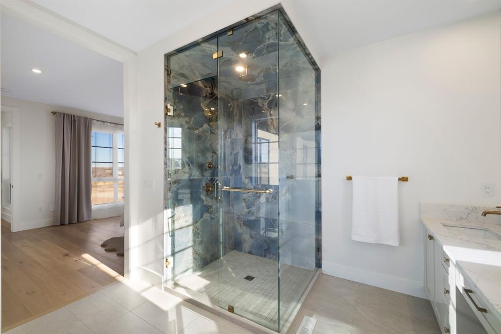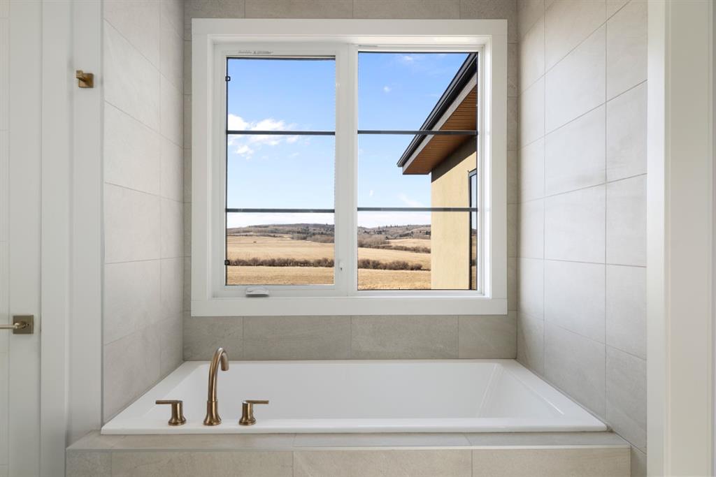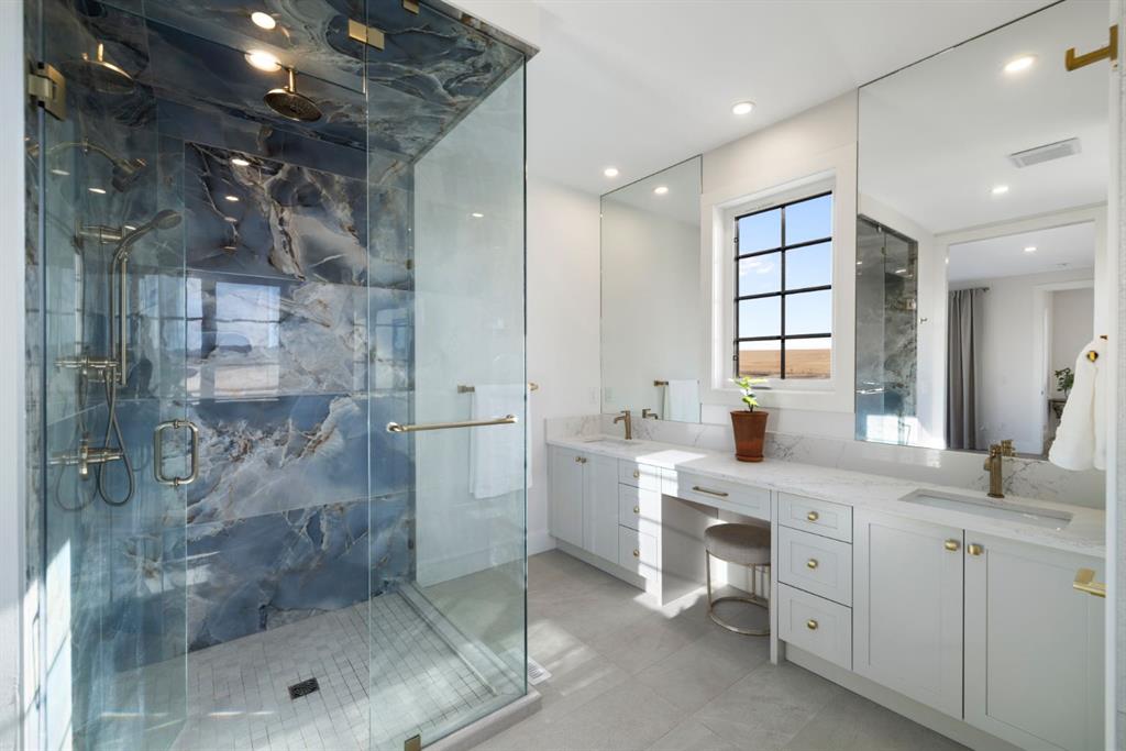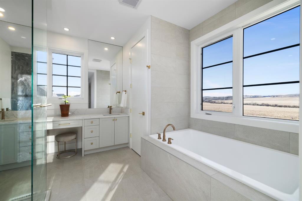 Upstairs, an open-to-below walkway enhances the sense of space while showcasing the home’s architectural design and scenery. This level includes three well-sized bedrooms, including a luxurious primary retreat with stunning mountain views, a walk-in closet, and a spa-inspired ensuite featuring a stand-up shower with blue tile and gold fixtures, double vanities, and a soaker tub. Additional bedrooms are complemented by a versatile flex space overlooking a serene patio, offering the perfect vantage point to take in Foothills sunsets.