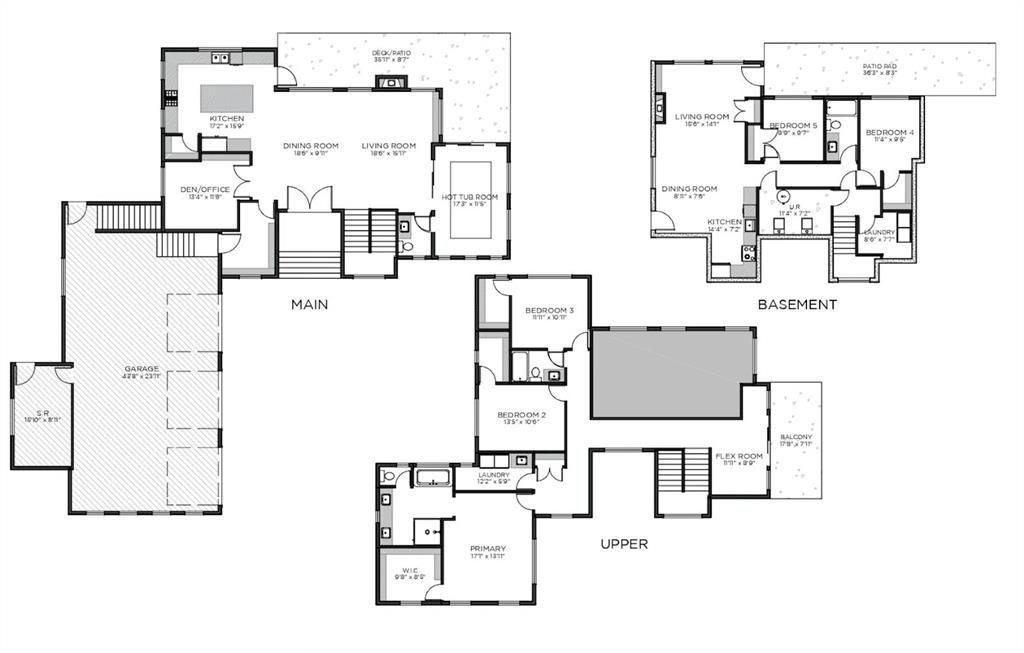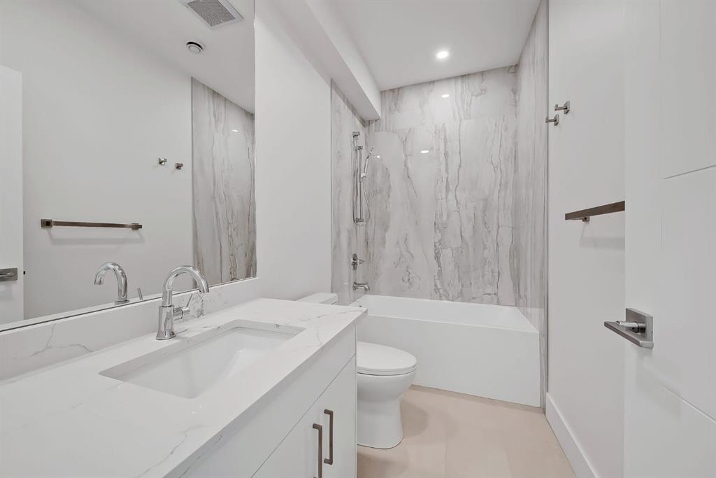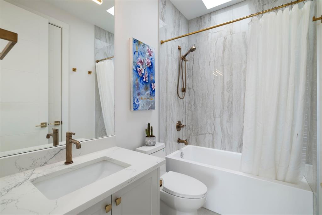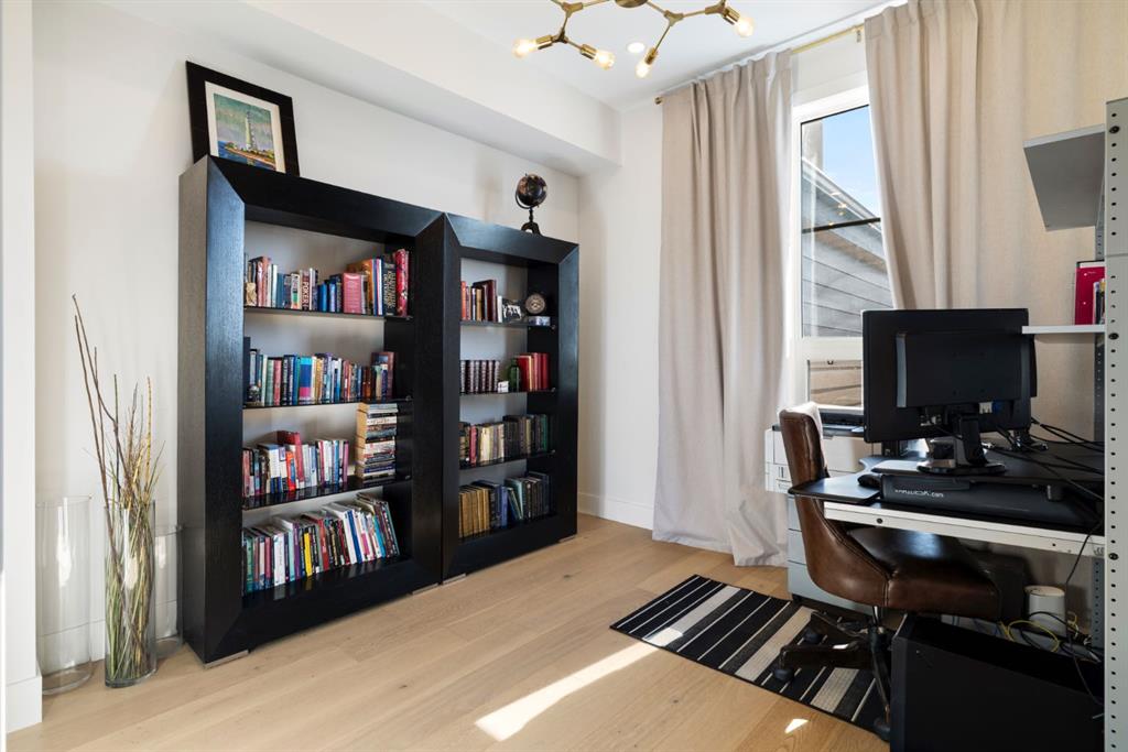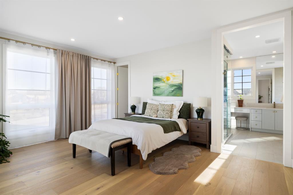Upstairs, an open-to-below walkway enhances the sense of space while showcasing the home’s architectural design and scenery. This level includes three well-sized bedrooms, including a luxurious primary retreat with stunning mountain views, a walk-in closet, and a spa-inspired ensuite featuring a stand-up shower with blue tile and gold fixtures, double vanities, and a soaker tub. Additional bedrooms are complemented by a versatile flex space overlooking a serene patio, offering the perfect vantage point to take in Foothills sunsets.