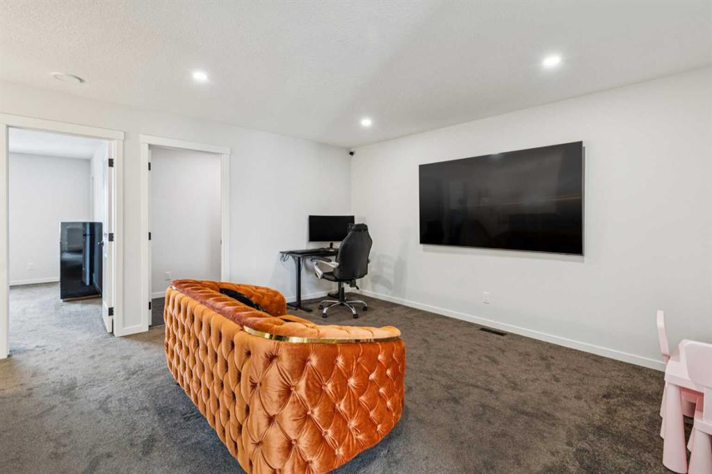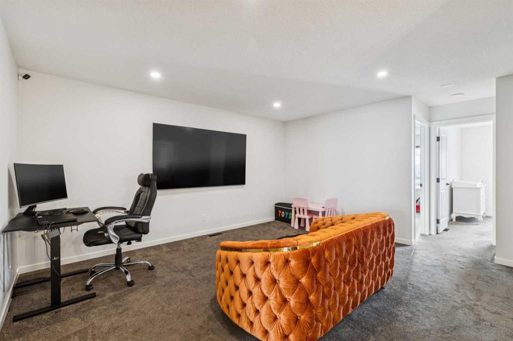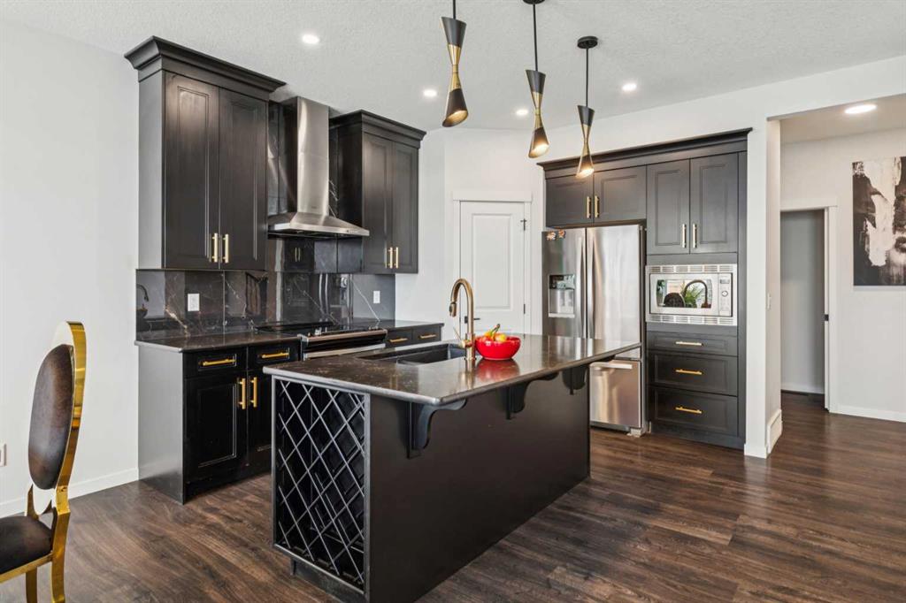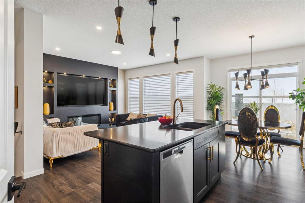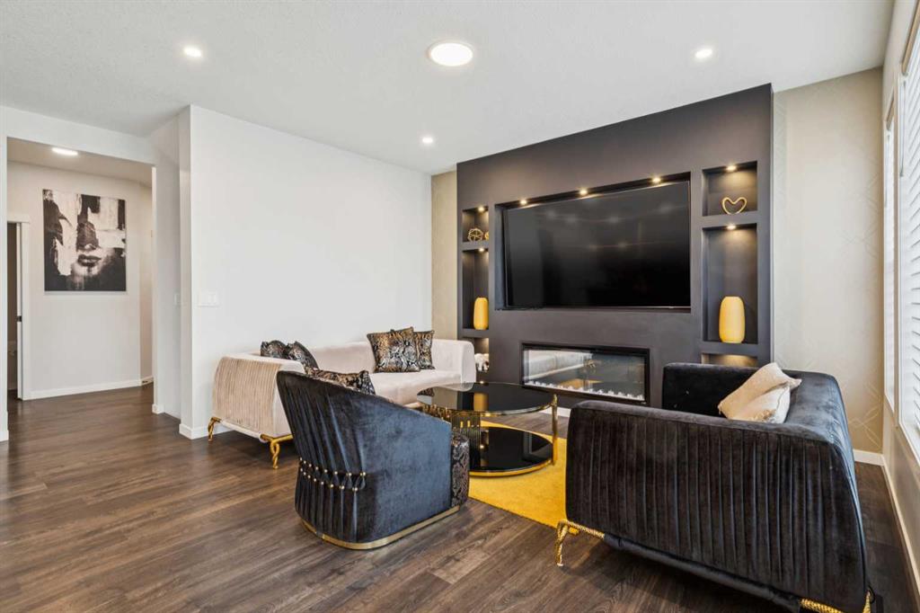 This beautifully curated residence offers refined luxury, thoughtful design, and exceptional upgrades in one of Calgary’s most desirable southwest communities. From the moment you enter the inviting open foyer, elegance and functionality are immediately apparent. A generous mudroom with direct garage access and a stylish 2-piece powder room provide everyday convenience right off the entry. The heart of the home is the gourmet kitchen, showcasing the Gourmet Advantage Package with 3 cm GG quartz countertops, full-height backsplash and cabinetry, deep undermount sink, built-in wine rack, walk-through pantry, breakfast bar, and upgraded stainless steel appliances. A 600 CFM Faber chimney hood fan completes the space, while a gas line with shut-off valve is installed for a gas range, offering flexibility to convert from the current electric stove if desired. Recessed lighting and an open-concept layout enhance the home’s bright, upscale ambiance. The sun-filled dining area features elegant glass sliding patio doors that open directly to the backyard, creating seamless indoor-outdoor living. The formal living room is anchored by a striking feature fireplace with custom built-ins, providing a refined focal point for both entertaining and relaxing. Upstairs, a large bonus room offers a versatile family space, while the primary suite serves as a private retreat with oversized windows, a massive walk-in closet, and a spa-inspired 4-piece ensuite. Two additional generously sized bedrooms share a beautifully appointed 4-piece bathroom with custom shelving. A convenient upper-level laundry room with sink and storage adds to the home’s thoughtful design. The fully developed basement expands your living space with a spacious family/recreation room, a large bedroom, and a 4-piece bathroom—ideal for guests, teens, or a home office. Outside, enjoy a fully fenced and landscaped backyard complete with a private patio and gas BBQ line, perfect for summer entertaining or quiet evenings at home. Additional premium upgrades include heated floors in all bathrooms, central air conditioning, Kinetico water softener and dechlorinator, Blanco Liven Silgranit laundry sink, upgraded stair railings to the basement, oak wood-capped stub wall detailing, and recessed lighting throughout.Ideally located near parks, pathways, schools, shopping, and major routes, this exceptional home delivers a lifestyle where luxury meets everyday comfort—a must-see to truly appreciate.