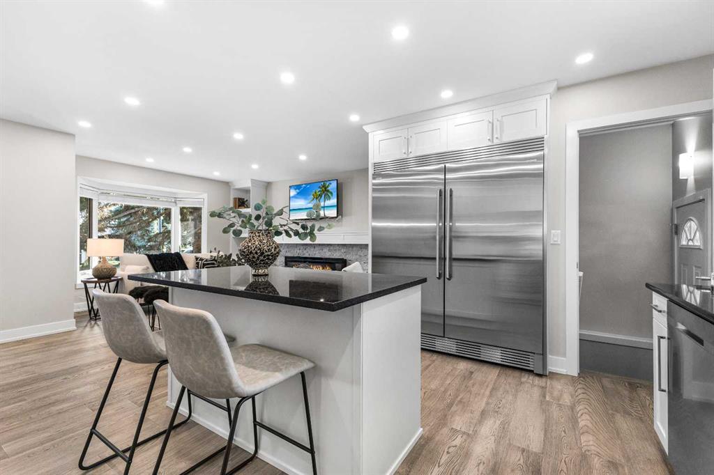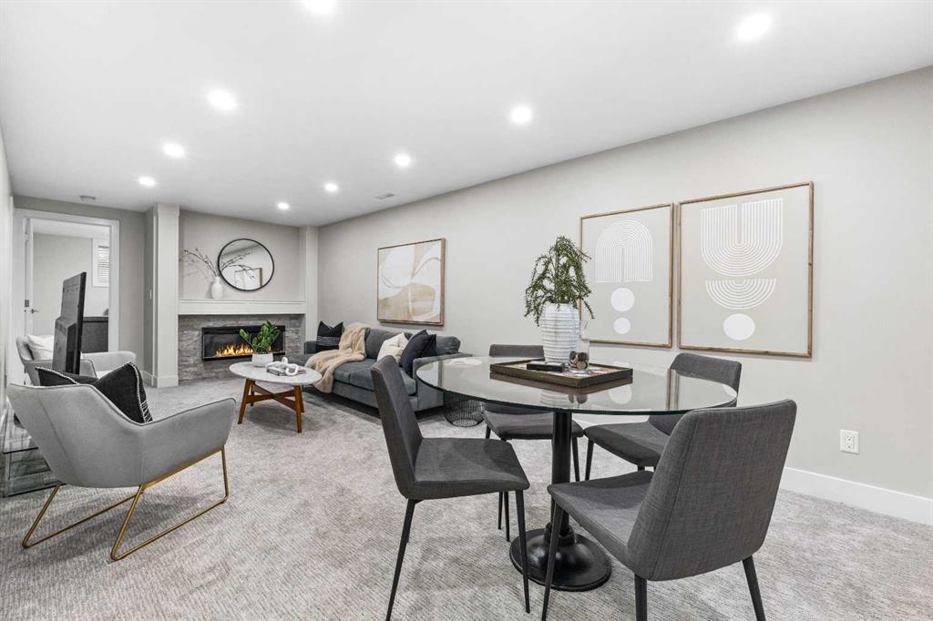 The bright, open-concept main floor features rich hardwood floors, a welcoming living room with a custom feature wall, electric fireplace, and built-ins, plus a stylish kitchen with granite countertops, an island with seating, crisp white cabinetry, and stainless steel appliances — including an Electrolux fridge/freezer. The dining area comfortably hosts family gatherings or dinner with friends. Two generous bedrooms and a refreshed 4-piece bathroom complete this level.