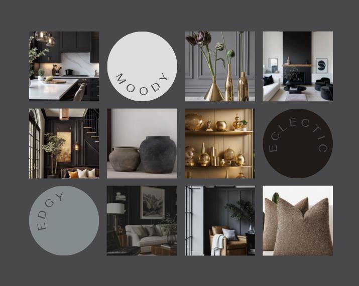 This home defines dark, modern elegance. The Ebony Collection blends rich, moody tones with warm brass accents, layered textures, and refined finishes that create a sense of depth and sophistication. Featuring dramatic paint contrasts, bold lighting selections, and a mix of natural materials, the design delivers both edge and comfort in equal measure.
