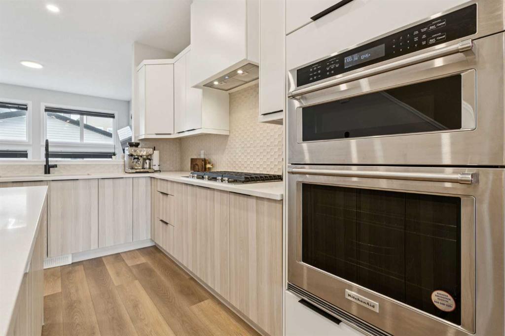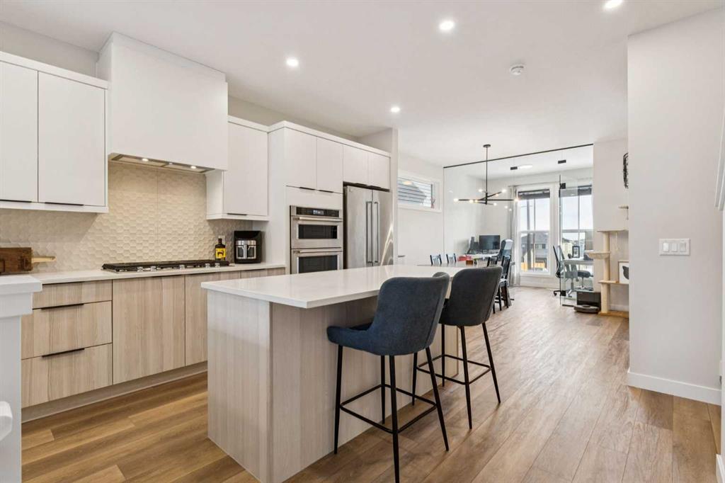Beautiful and inviting, this stunning Jayman-built home is located in the sought-after Northwest community of Glacier Ridge. Surrounded by parks, playgrounds, and scenic walking paths, this new neighborhood offers the perfect blend of community and convenience. From the moment you step inside, you’ll appreciate the thoughtful layout, quality craftsmanship, and modern design. The open-concept main floor is perfect for both everyday living and entertaining. At the heart of the home is a gorgeous gourmet kitchen featuring a central island with a flush eating bar, sleek stainless steel appliances, and high-end finishes. You’ll love the KitchenAid French door refrigerator, gas cooktop, built-in wall oven and microwave combo, and the stylish cabinet hood fan. The spacious dining area flows seamlessly from the kitchen, making it ideal for hosting family dinners or casual get-togethers. The home’s layout is both stylish and functional, with the elevated kitchen overlooking the spacious lower living room. Here, soaring 11 ft ceilings and a beautiful feature fireplace create a warm, open atmosphere perfect for relaxing or entertaining. At the front of the home, a bright and versatile flex/den space with sleek glass wall and a door welcomes in an abundance of natural light through an oversized picture window—ideal for a home office, reading nook, or kid’s play area. Adding to the home’s modern appeal, the staircase and entire second floor have been upgraded with durable and stylish vinyl plank flooring, offering a cohesive, low-maintenance finish throughout the upper levels. Upstairs, you’ll find three generously sized bedrooms, including a stunning Primary Suite complete with a large walk-in closet and a spa-inspired 4-piece ensuite featuring dual vanities and an oversized shower. For added convenience, the second-floor laundry is thoughtfully tucked just steps away. This Jayman-built home includes impressive standard features focused on comfort and energy efficiency—like six solar panels, BuiltGreen Canada certification, and a high EnerGuide rating. Enjoy clean air with a UV-C purification system, consistent airflow from a high-efficiency furnace with HRV, and endless hot water with a Navien tankless heater. Triple-pane windows provide excellent insulation, and smart home technology with Alexa adds modern convenience. With a detached double car garage, a professionally finished rear deck with a gas BBQ line, and fully landscaped yard, this low-maintenance home is move-in ready for you and your family. Don’t miss the opportunity to live in this vibrant and welcoming community—your dream home is waiting!