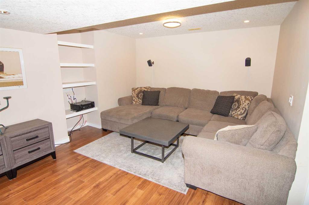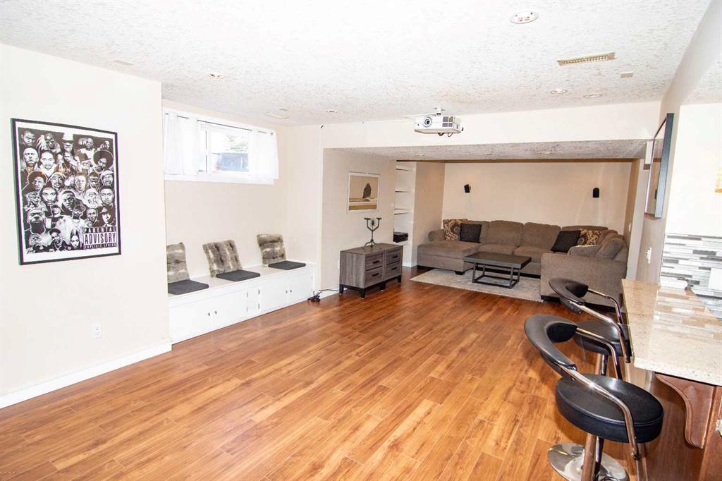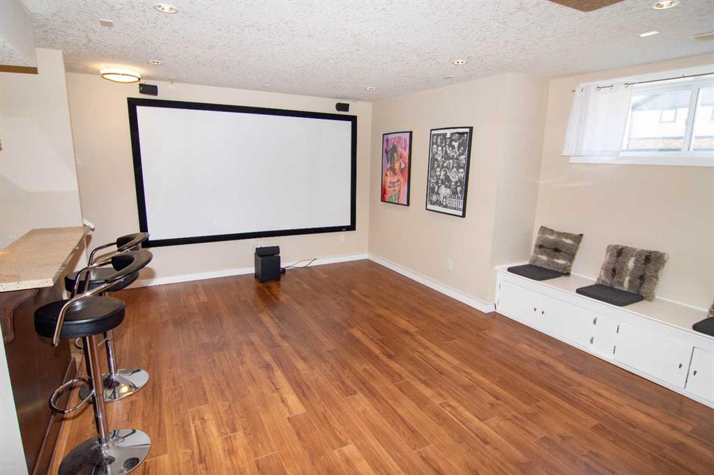The FULLY DEVELOPED BASEMENT is built for entertainment — featuring a stylish wet bar with granite counters, a dedicated home theatre with 112” screen, 4K HD projector, and 5.1 surround sound, a large family room, an additional bedroom, and a spa-inspired bathroom with a multi-jet body spray shower.