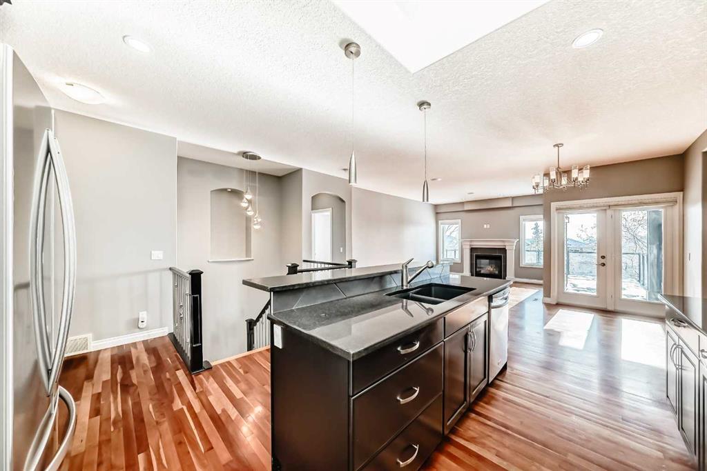 charming front porch, you’ll step into a bright, open-concept layout featuring pot lights, upgraded fixtures, and rich hardwood flooring. The heart of the home is the stunning kitchen, complete with a skylight, granite countertops, abundant cabinetry, and a walk-thru pantry leading to the oversized attached double garage. The main floor also includes a versatile den or second bedroom — ideal for guests or a home office. At the rear, enjoy a spacious deck with sleek glass railing and a gas line for your BBQ, all while taking in peaceful park and mountain views. The primary suite overlooks the green space and offers a walk-in closet and luxurious ensuite with in-floor heating, air tub, make-up counter, and an impressive tiled shower with bench and multi-head 6-piece configuration. The fully finished walk-out basement is built for entertaining, featuring two additional bedrooms, a full bath, large family room with in-ceiling speakers, wet bar, in-floor heating, and generous storage. Step out to the exposed aggregate patio and beautifully upgraded outdoor space. Additional highlights include a drywalled garage and numerous thoughtful upgrades throughout. A rare combination of space, style, and an unbeatable