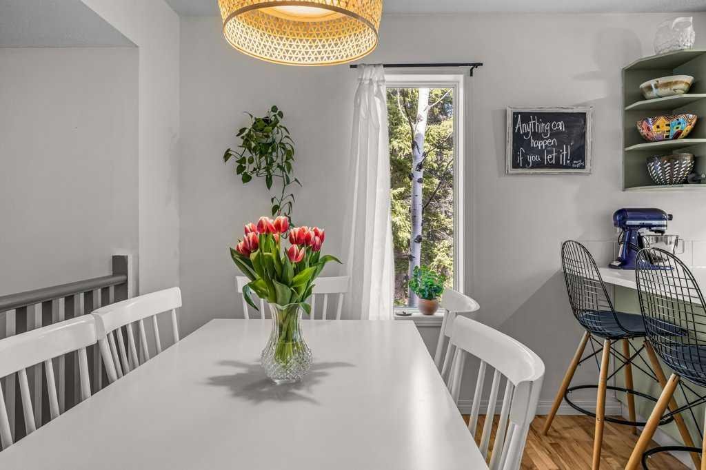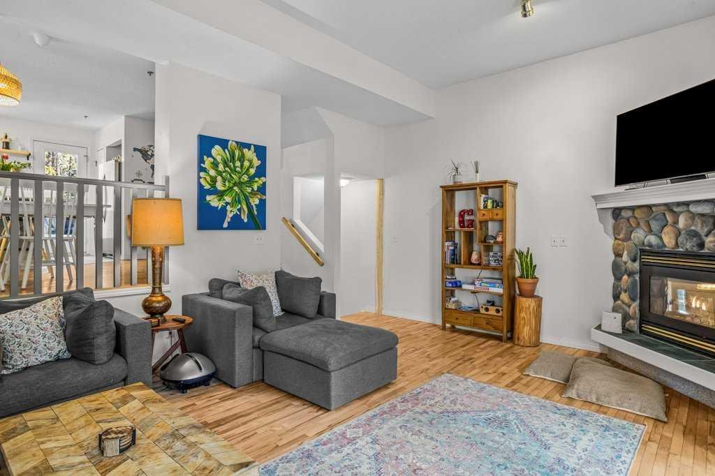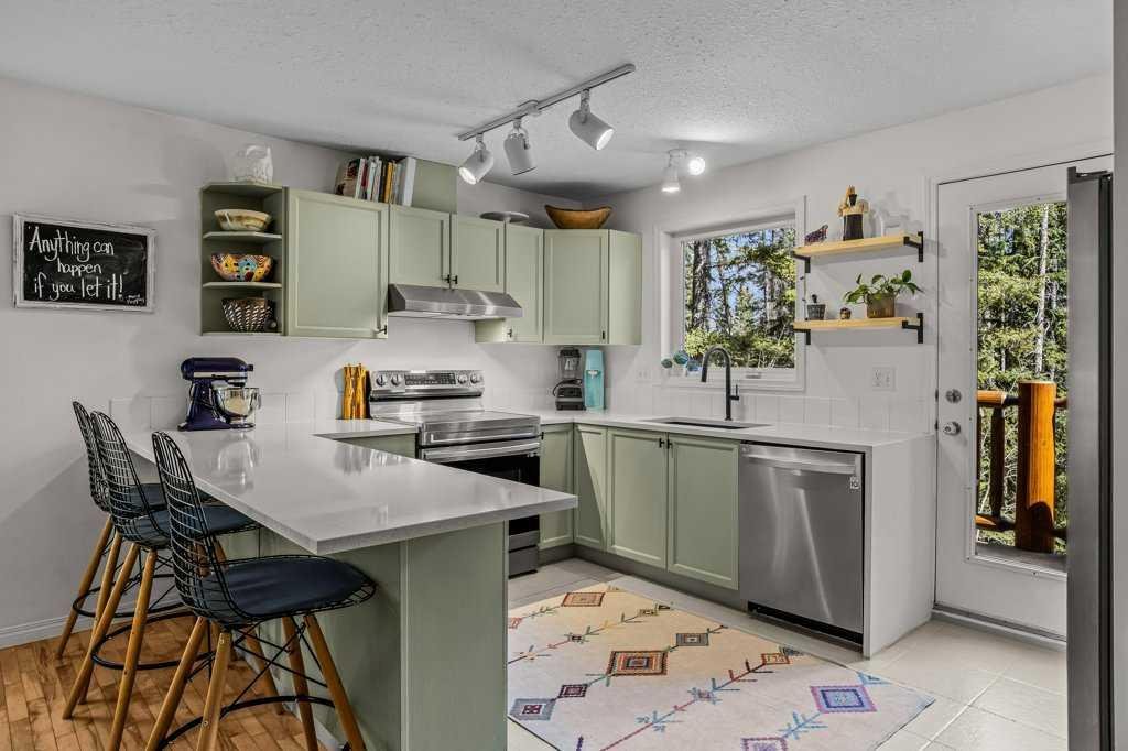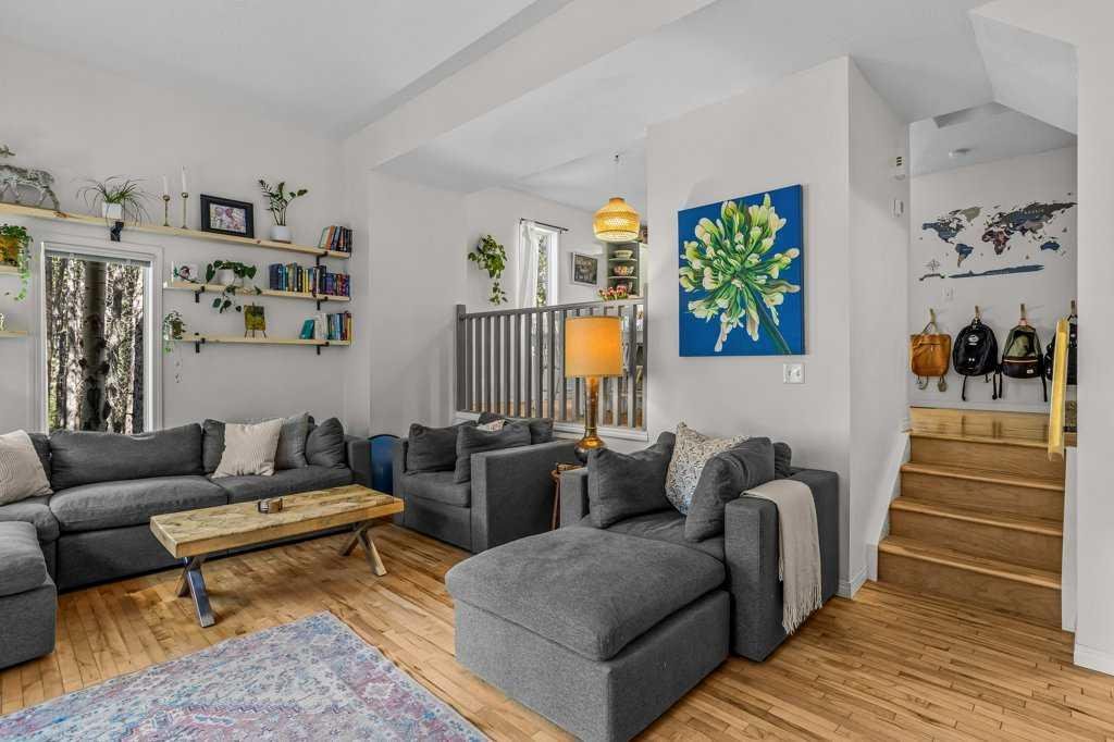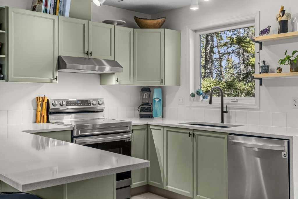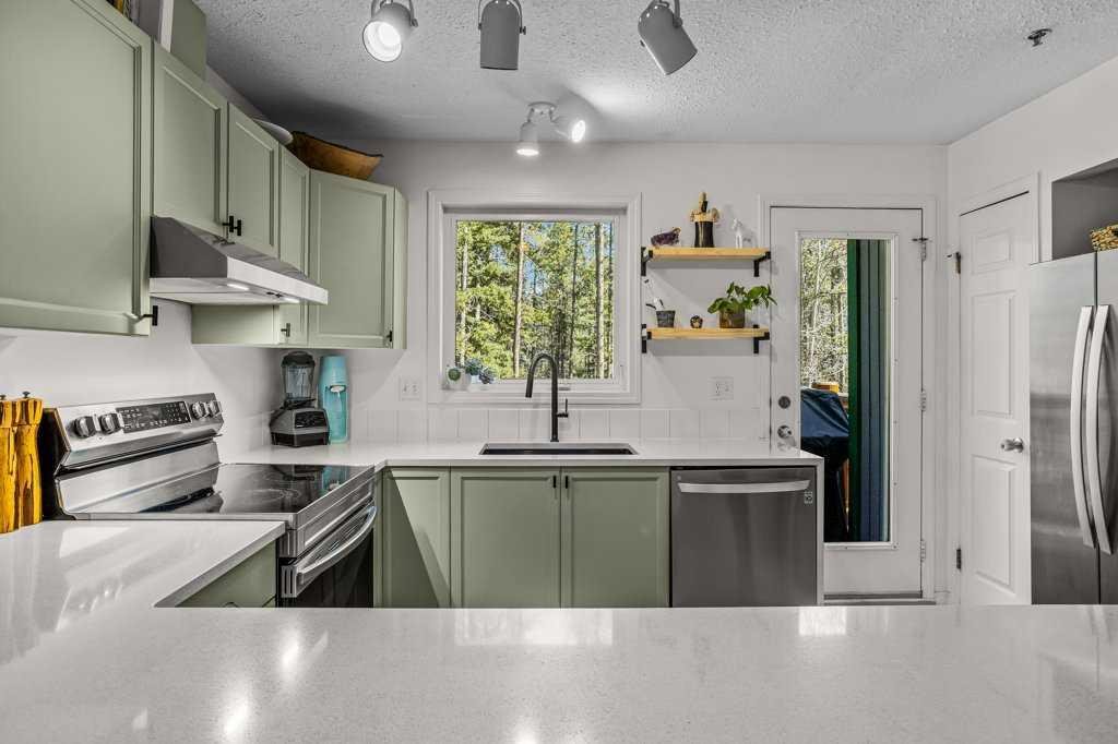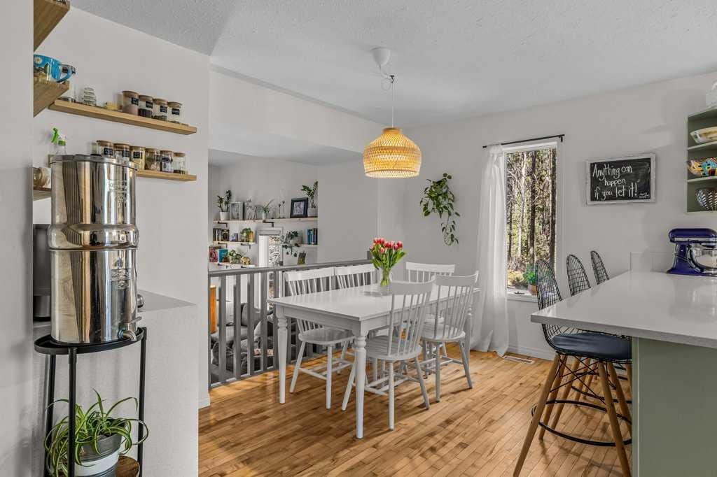 Situated in Rundle Mountain Estates, this well-maintained end-unit townhouse offers a serene forest setting and a quiet, private mountain retreat. With three bedrooms on the upper level and multiple living areas across three levels, the layout is ideal for families or a weekend escape. The bright, open-concept main floor features a functional kitchen, spacious dining area, and inviting living room with a cozy gas fireplace, while large windows bring in natural light and views of the surrounding trees. A two-piece bathroom completes this level. Upstairs, the primary suite includes a walk-in closet, ensuite, and private balcony, alongside two additional bedrooms and a full bath. The lower level provides flexible space for a family room, media area, or extra bedroom, plus laundry and storage. Complete with multiple outdoor spaces, an oversized single garage, and close proximity to Quarry Lake, the Nordic Centre, and downtown amenities.