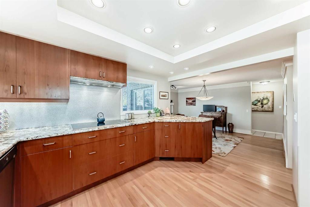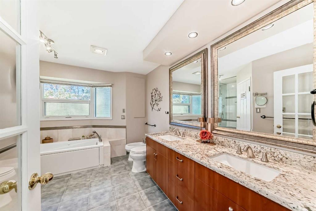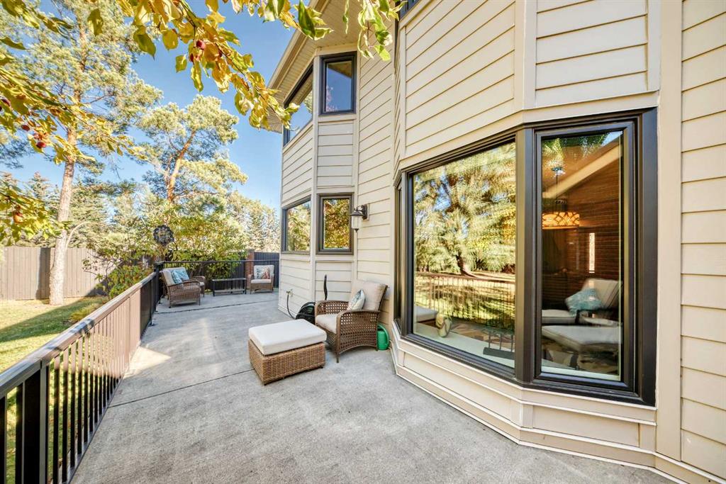 Welcome to this exceptional & spacious 3 bed/3.5 bath fully renovated semi detached home, with 4 separate outdoor spaces, situated in a gated 18+ complex, a stroll across the street from South Glenmore Park, the Weaselhead natural area & off leash park, in the highly sought after community of Oakridge!! This is one of the largest units in this small complex with over 3000 sq ft of living space, perfect for any walk of life. You’ll be welcomed outside by the completely redone front courtyard, a relaxing space to enjoy a glass of wine at the end of the day. Upon entering the home, you’ll appreciate the gorgeous matte hardwood flooring w/custom inlaid trim, elegant crown mouldings & large Lux triple paned windows throughout the home, filling the space with an abundance of light. Overlooking the courtyard is your intimate sunken conversation area with a stunning crystal light feature & gas fireplace for ambience. The spacious formal living & elegant dining areas flow seamlessly, perfect for entertaining. Through the sliders off the living/dining area is a outdoor dining space for al fresco meals on warm summer evenings. The renovated kitchen features granite counters, large window overlooking the peaceful park-like backyard, custom built cherrywood cabinetry, Wolf electric cooktop, Dacor wall oven, Panasonic wall microwave, LG fridge, built in wine cubby & bar area. The generous family/kitchen dine-in area features a new gas Valor Legend fireplace insert (2024) & sliding doors out to the large deck running the width of the home. The powder room with Italian marble vanity counter and main floor laundry complete the level. Upstairs you’ll appreciate the hardwood continuing throughout. The serene primary suite features a generous sleeping area, a separate conversation/TV area with gas fireplace, large windows, a private upper balcony, & walk in closet. The sumptuous spa like 6pc ensuite features a large double vanity with Italian marble counter, glass walk shower with Italian marble, jetted tub, bidet & built in sauna for those chilly winter mornings. The upper office features French doors, built in bookshelves & a balcony. The bonus room features large windows & small wet bar area, perfect for movie nights. Two large additional bedrooms and huge upper 5 pc bath (with Italian marble!) complete the upper level. The fully developed lower level features a large recreation room with pool table, a flex/gym space with built in desk & bookcase and 3 pc bath. Additionally is a large storage/wine room (plus more under the stairs). The double oversized heated & insulated garage features an eco friendly garage floor wash bay drain, plus side door and plenty of storage. Ideally located across from South Glenmore Park & the Weaselhead natural area, walking distance to Oakbay Plaza, a quick drive to Glenmore Landing & Oakridge Co Op, and a short commute to downtown via Stoney Trail, this home features the best of both worlds, balancing nature & city life! Book your showing today!