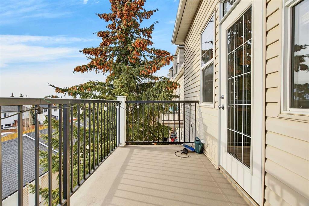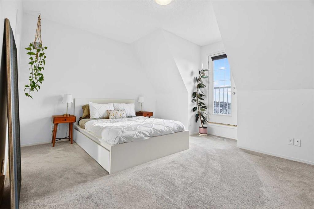 Beautifully UPDATED, immaculately maintained and truly MOVE-IN READY, this top-floor townhome shows 10/10 and offers an exceptional location with easy access to Aspen Landing, the 69 Street LRT, Westside Recreation Centre, downtown Calgary, and a QUICK ESCAPE WEST TO BANFF AND CANMORE. The main living level features a BRIGHT, open-concept layout with 9’ ceilings, updated laminate flooring, new trim, and a beautifully renovated kitchen complete with stainless steel appliances, ceiling-height cabinetry with built-in lighting, soft-close doors, a pantry cabinet, a large granite island, and updated lighting throughout. Step out from the kitchen to the sunny south-facing balcony with gas BBQ hookup, perfect for morning coffee or evening meals. The spacious dining area easily accommodates a full-size table, while the inviting living room offers a bright, generous space and a west-facing nook ideal for a home office or reading corner. A convenient 2-piece bathroom and laundry room with newer washer and dryer and additional storage complete this level, with the hot water tank replaced in 2020. Upstairs, 9’ ceilings continue and you’ll find two generously sized bedrooms, including vaulted ceilings, a primary suite with double closets, a 3-piece ensuite, and a charming Juliet balcony, along with a second large bedroom and a full 4-piece bathroom. Carpets were replaced in 2019. This home also includes a titled single detached garage with attic storage. The well-managed, pet-friendly complex is ideally located close to countless amenities, with condo fees covering water, sewer, insurance, trash, HOA, and professional management, and average utility costs of approximately $140 per month.