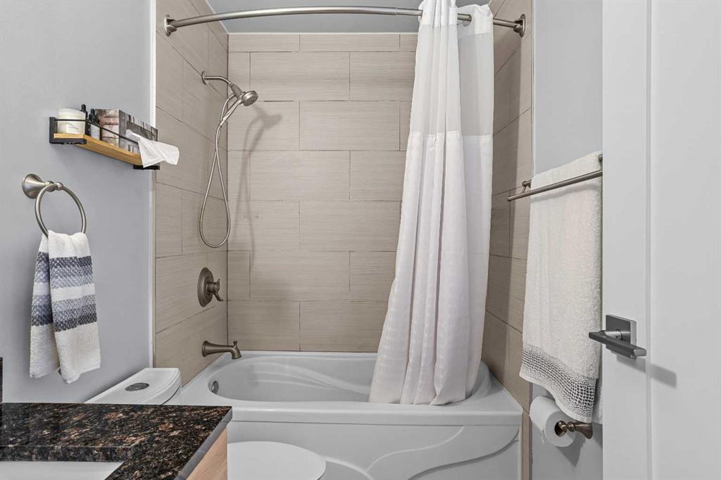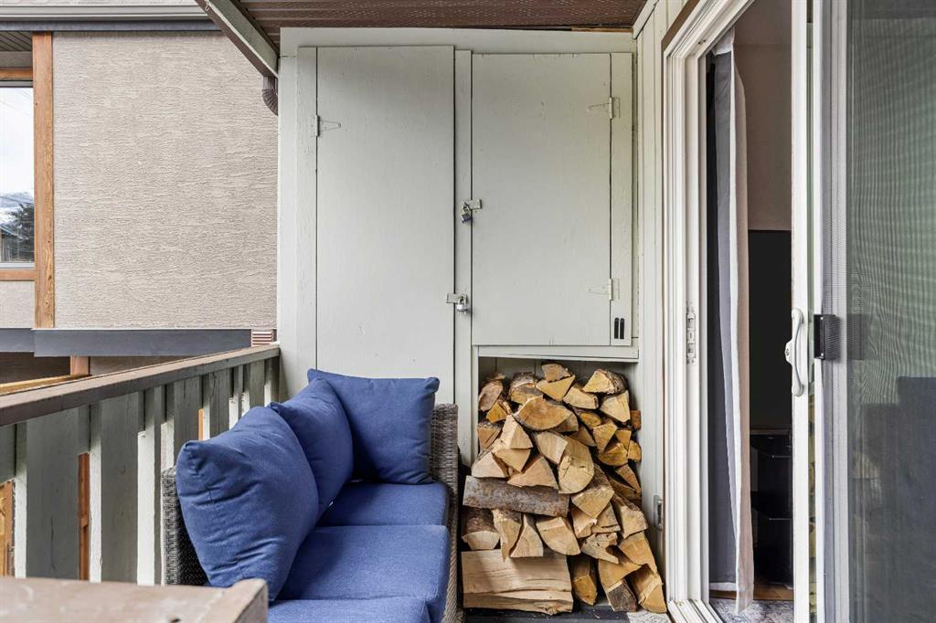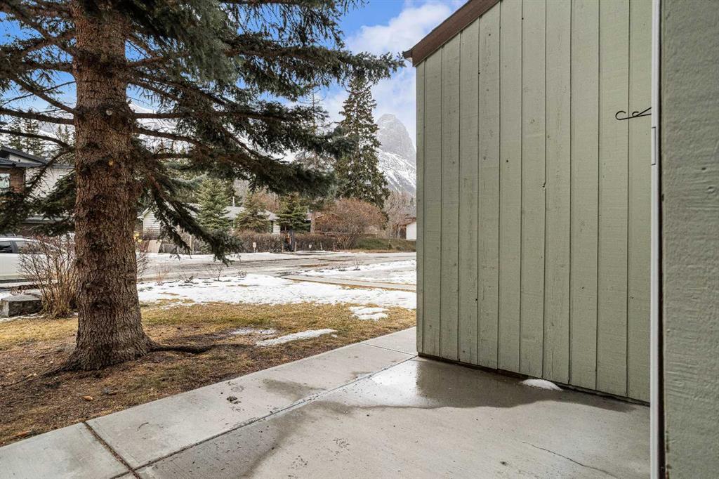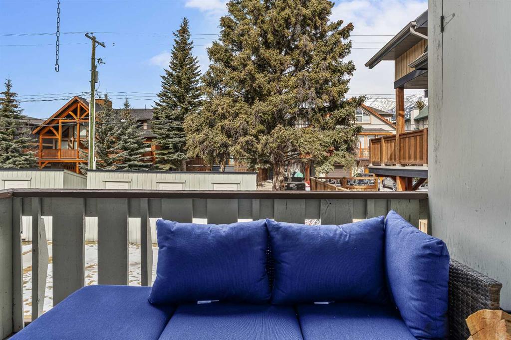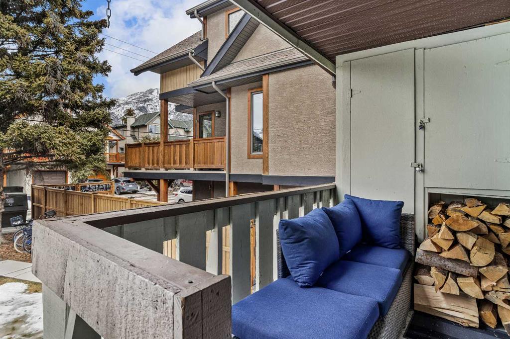 On a quiet street, only blocks from the Bow River as well as the enticing sights & sounds of Canmore’s vibrant Main St, this mechanically & cosmetically, fully renovated 2 bed top level end unit townhome is a “turnkey” stand-out. Entering from ground level, the landing leads up to a spacious & completely remodelled eat-in kitchen. Light & bright finishes gleam as sun pours in through recently replaced south-facing windows. New flooring & smooth, “paint grade” ceilings transition to the living room in a seamless fashion. Here, an airtight wood-burning stove is a major upgrade from the original fireplace & is a wonderful focal point in this restful space. Through new sliding doors, a covered deck adds outdoor living space where convenient stairs take you to the rear yard of the complex. Up stairs flanked in new handrails, you arrive at a broad landing complete with side-by-side laundry, storage & a convenient laundry folding area. The mechanical room contains a new furnace & hot water tank. The bedrooms are a hallmark of a time when developers built more generous floor plans, where the primary bedroom size rivals those in far more costly homes. The second bedroom is also comfortably proportioned. Both share a 4-pc bathroom with designer touches. One off street parking space, a sizable storage shed, all in a well-managed corporation offers value second to none.