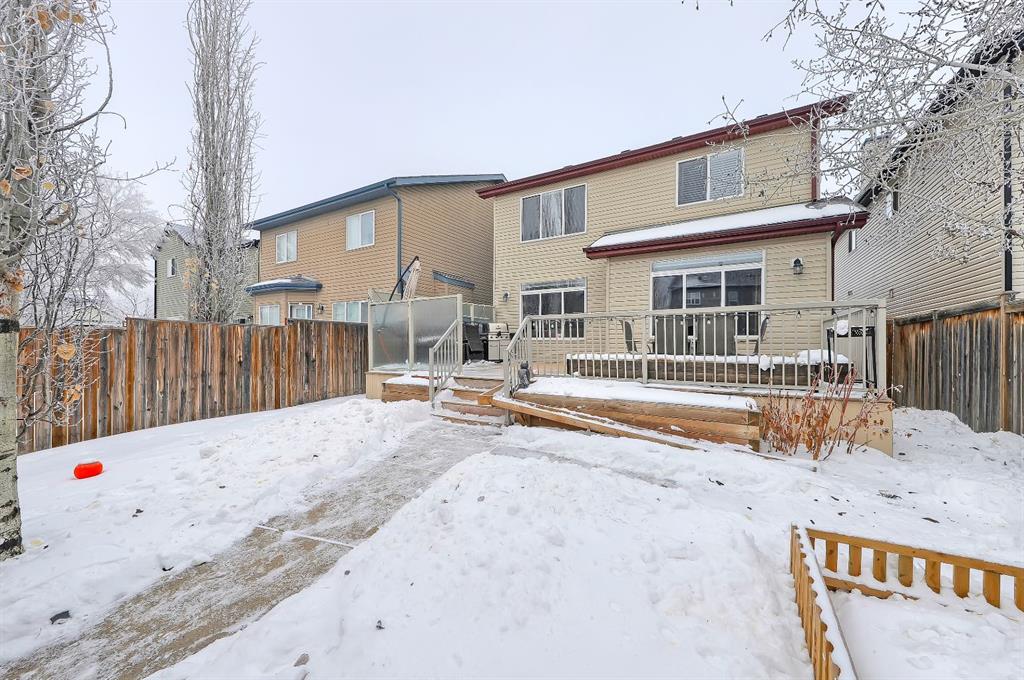 Located in the heart of Copperfield, this like-new and upgraded home offers over 2,600 sq. ft. of total developed living space (over 1,900 sq. ft. above grade), a fully finished basement, 3 bedrooms, 3.5 bathrooms, a sunny south-facing backyard, and a heated, oversized, double-attached garage. Thoughtfully designed with high ceilings and quality finishes throughout, this move-in-ready property is ideal for growing families or professionals seeking both comfort and functionality. The main floor features 9-ft ceilings, solid oak hardwood flooring, a bright, open layout, and oversized windows that fill the space with natural light. The kitchen includes stainless steel appliances, a gas range, a water filtration tap, an oversized island, and abundant cabinetry, pull out pantry shelving and abundant counter space. The dining and living areas connect seamlessly, highlighted by a gas fireplace with a tile surround and wood mantle, as well as direct access to the backyard. Across the yard is the back lane, great alley access for RV’s or Trailers! A powder room and laundry with built-ins complete the level. Upstairs, carpeted stairs lead to three bedrooms and a spacious bonus room. The primary suite offers custom closet organizers and a private 4-piece ensuite with a soaker tub and separate shower. The fully developed basement provides additional flexible living space with a large rec area and a full spa-like bathroom with heated tile floors, perfect for guests, a home gym, or media room and already has a built-in surface for the perfect pool table! Enjoy the south-facing backyard with a large composite deck, privacy glass, expansive patio, and garden shed. Exterior updates include updated siding, soffits, fascia, roof, all installed in 2021). Additional features include central AC, central vacuum, a water softener, fresh paint, heated + oversized garage with shelving. Copperfield is a fantastic community for buyers of all kinds, with a diverse and comprehensive range of nearby shops, services, and amenities, including grocery stores, coffee shops, professional services, restaurants, fitness options, and more. Schools, parks, playgrounds, and pathways are all within walking distance. This home also benefits from close proximity to Stoney Trail, Deerfoot, 52 Street, and the BRT, making transit to the city easy. Sorry, Time Machine in the garage not included!
