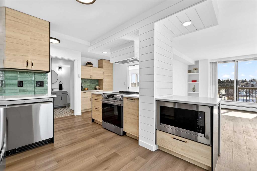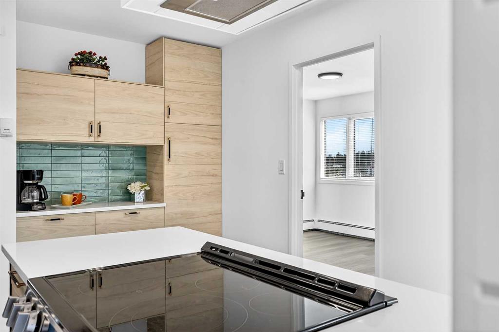 Beautiful fully updated 2 bedroom and 1 bath home. Open south facing floor plan. You will fall in love with the gorgeous kitchen with quartz countertops and designer backsplash, shiplap features along with a fantastic buffet with pantry for even more wow. All new appliances with manufacturer warranties for peace of mind. The large wrap around balcony provides even more city views and lots of room to entertain. New in-suite laundry adds another level of convenience. This unit also features beautiful waterproof luxury vinyl plank flooring throughout, a large 4-piece bathroom with designer tile and a 48” vanity. Underground secure parking is included. Additional parking in the gated secure ground level can be privately rented (based on availability). Don’t miss this opportunity to call this place home! Call your favorite realtor and book a showing!
