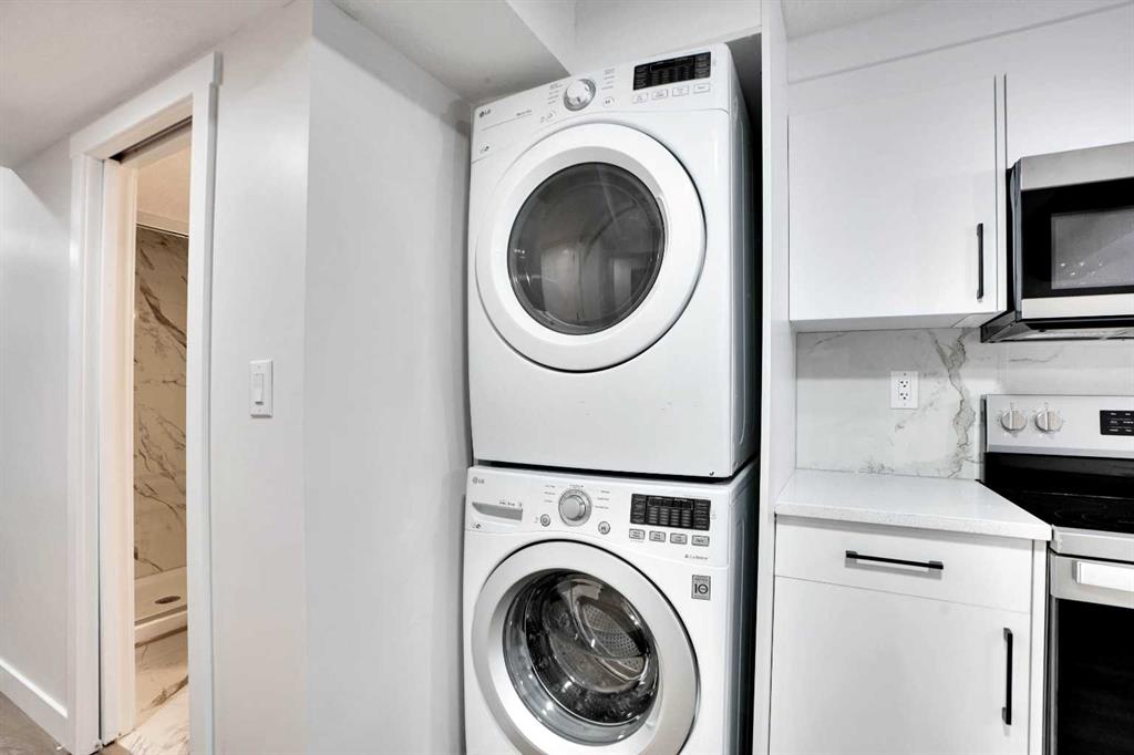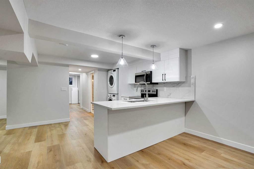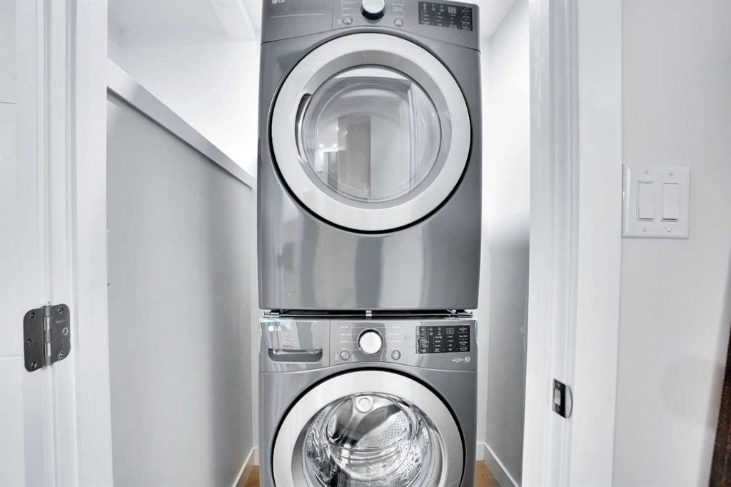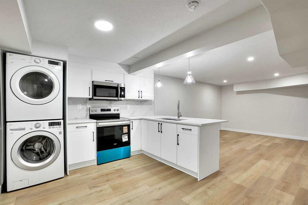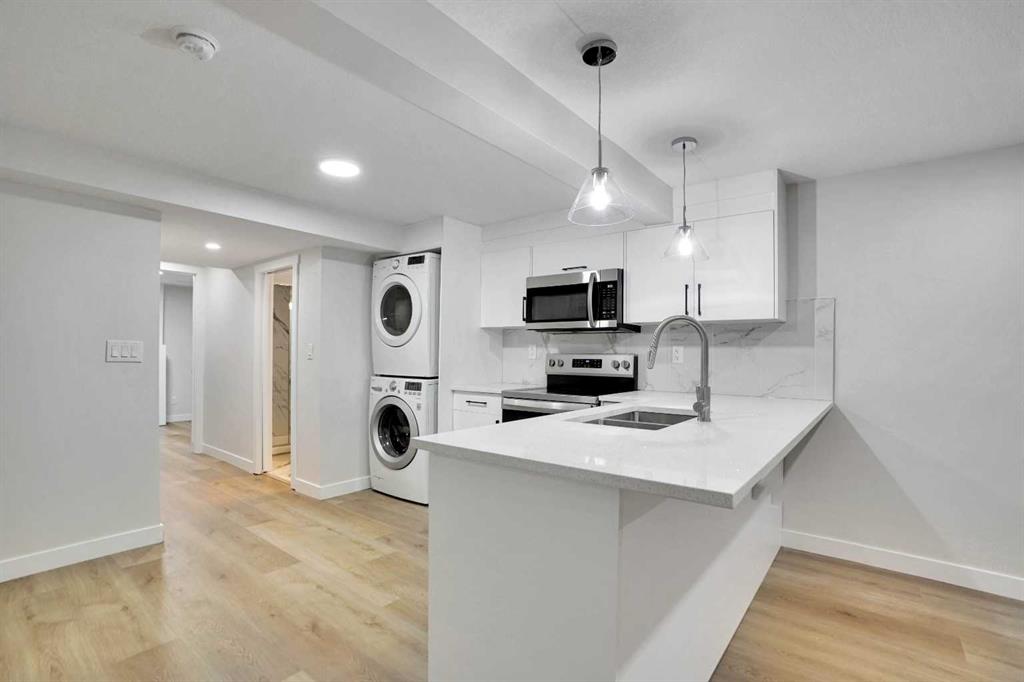 Step inside to a bright and spacious foyer with a convenient closet. The stunning modern kitchen boasts a central island, stainless steel appliances, and an open layout overlooking the dining and living areas. Large windows in the living room flood the space with natural light, creating a warm and inviting atmosphere. A stylish 4-piece bathroom, in-suite laundry with stacked washer/dryer, and three generously sized bedrooms complete the main level.