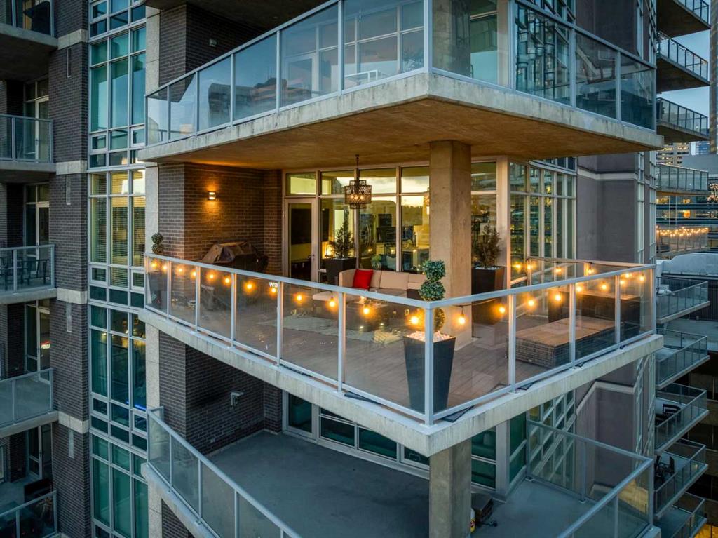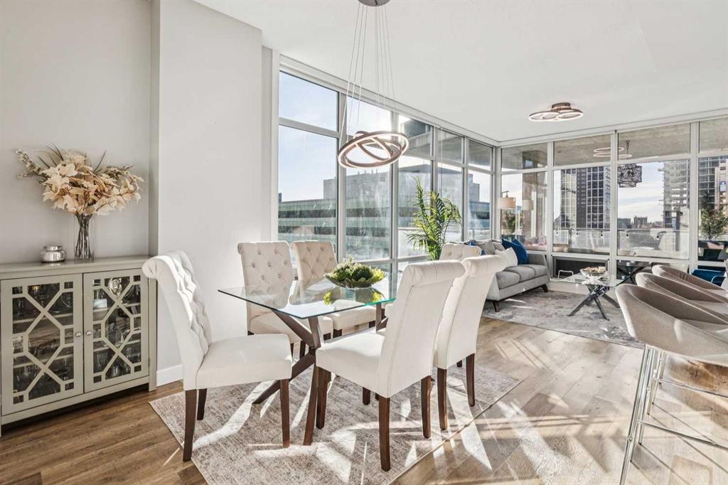 The spacious living room showcases floor-to-ceiling windows with brand new motorized zebra blinds and direct access to a massive covered wraparound patio (almost 300 square feet) perfectly extending your living space for entertaining or relaxing while enjoying stunning south facing Beltline views.