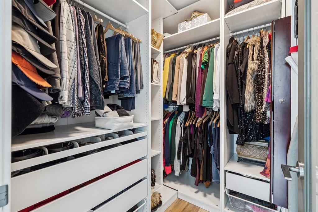 The generously sized master bedroom offers a luxurious 4-piece ensuite with all-new lighting, mirror, tile floors and backsplash, painted cabinetry with fresh hardware, and a beautifully tiled shower with updated fixtures. A large walk-in closet features smart organization systems for added convenience. The second bedroom is equally spacious, complete with new lighting and zebra blinds.