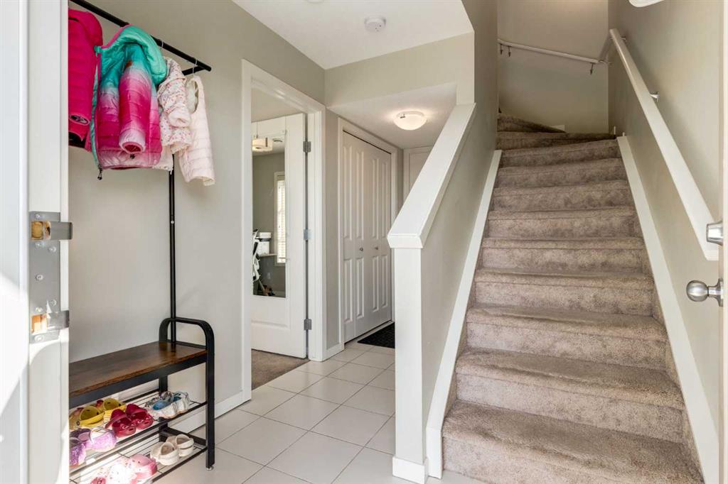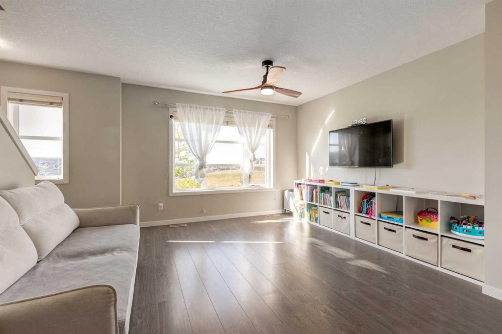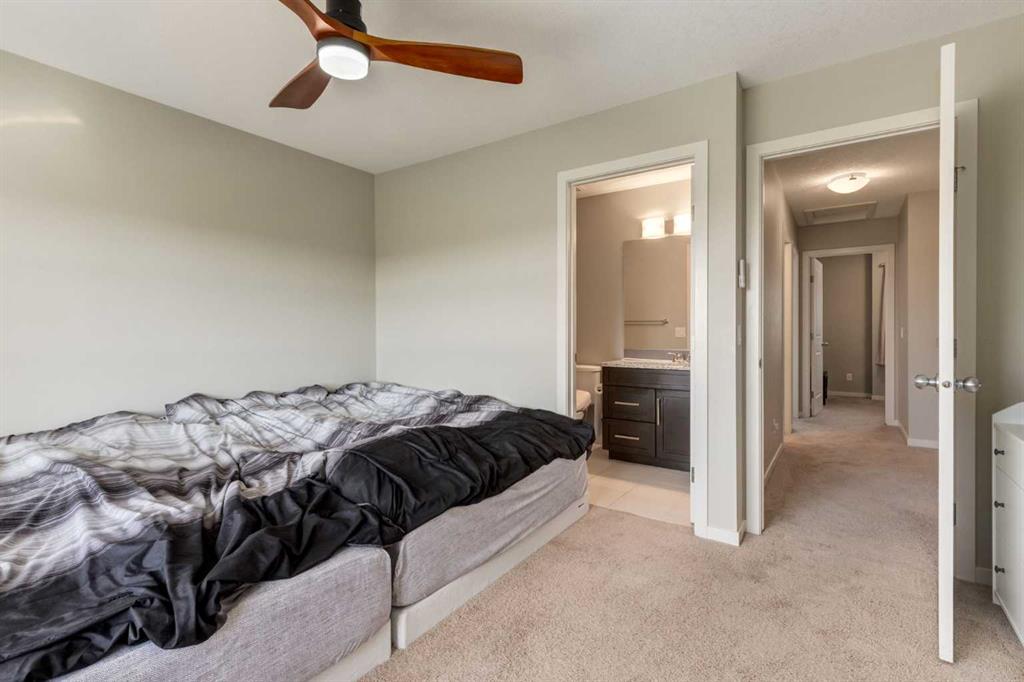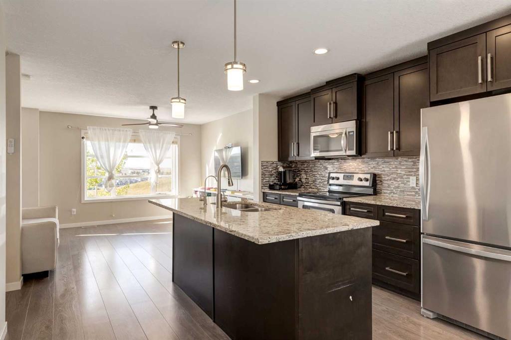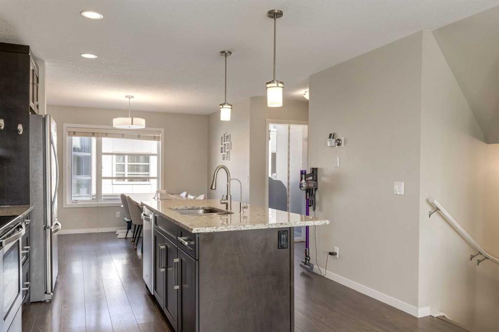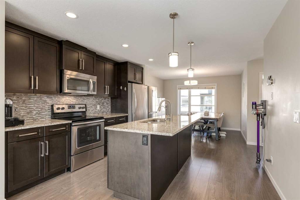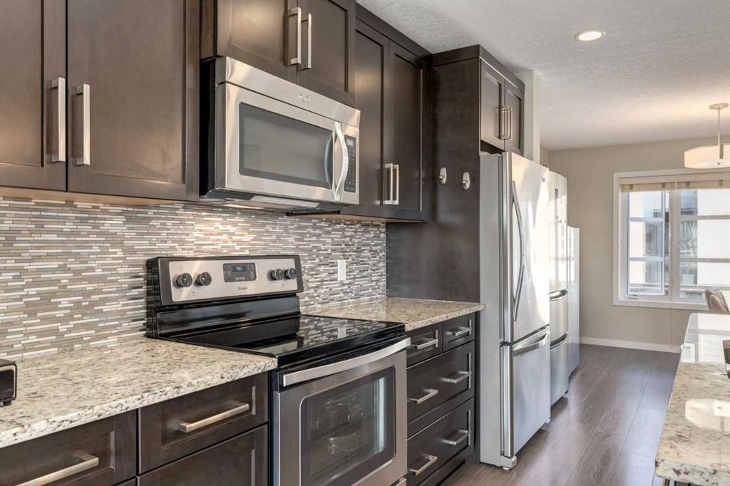 Enjoy breathtaking ravine and green space views from this beautifully maintained 3-bedroom, 2.5-bathroom townhome in Vantage on Evansridge. With nearly 1,541 sq. ft. of finished living space, a double attached garage, and low condo fees, this home offers outstanding value compared to nearby single-family houses. From the private front patio, step into the main floor featuring a versatile bedroom that can also serve as a home office or den, along with direct access to the garage. Upstairs, the open-concept second level is anchored by a stylish kitchen with a large granite island, stainless steel appliances, dark-stained maple cabinets, and a spacious pantry. The kitchen flows seamlessly into the dining area and bright living room, where expansive windows frame the stunning ravine views. A balcony with a gas line and a convenient half bath complete this level. The top floor offers three bedrooms, two full bathrooms, and laundry. The primary suite features a walk-in closet and a beautifully upgraded ensuite with a double shower. Additional highlights include Hunter Douglas window coverings, a water softener, and an insulated garage that easily fits two vehicles. This move-in ready home is surrounded by natural pathways, playgrounds, and green space, with Our Lady of Grace School, transit, and quick access to Stoney Trail and Deerfoot nearby. With incredible views, modern finishes, and a fantastic location, this is the perfect place to call home. Click the Virtual Tours for more detail!