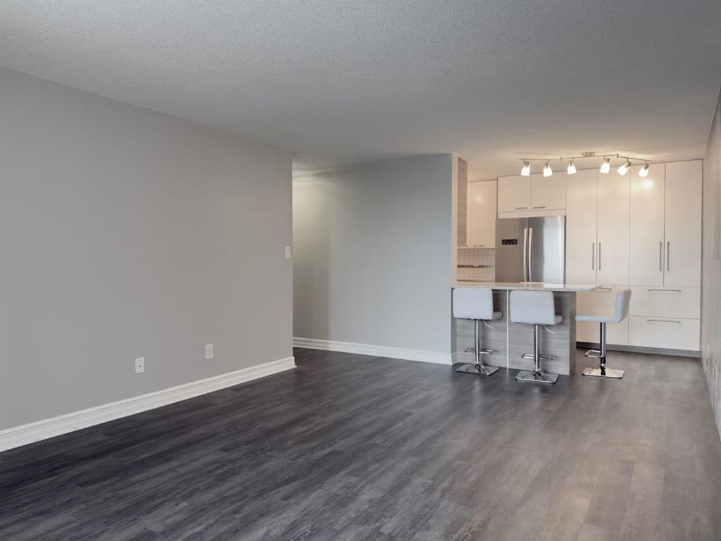 The redesigned kitchen & dining area features abundant storage with ceiling-height, clean-line white cabinetry accented by warm wood trim. Plenty of light to enjoy the stunning quartz countertops, stainless steel appliances, & built-in island that overlooks the spacious living room with a stylish feature wall —perfect for both entertaining & everyday living. From the living room, the sliding doors lead to an expansive 6 x 32 foot covered balcony to enjoy your coffee in the sun or an evening BBQ. Modern light fixtures, & updated lighting throughout add to the unit’s appeal, while charcoal grey vinyl flooring flows through most of the condo.
