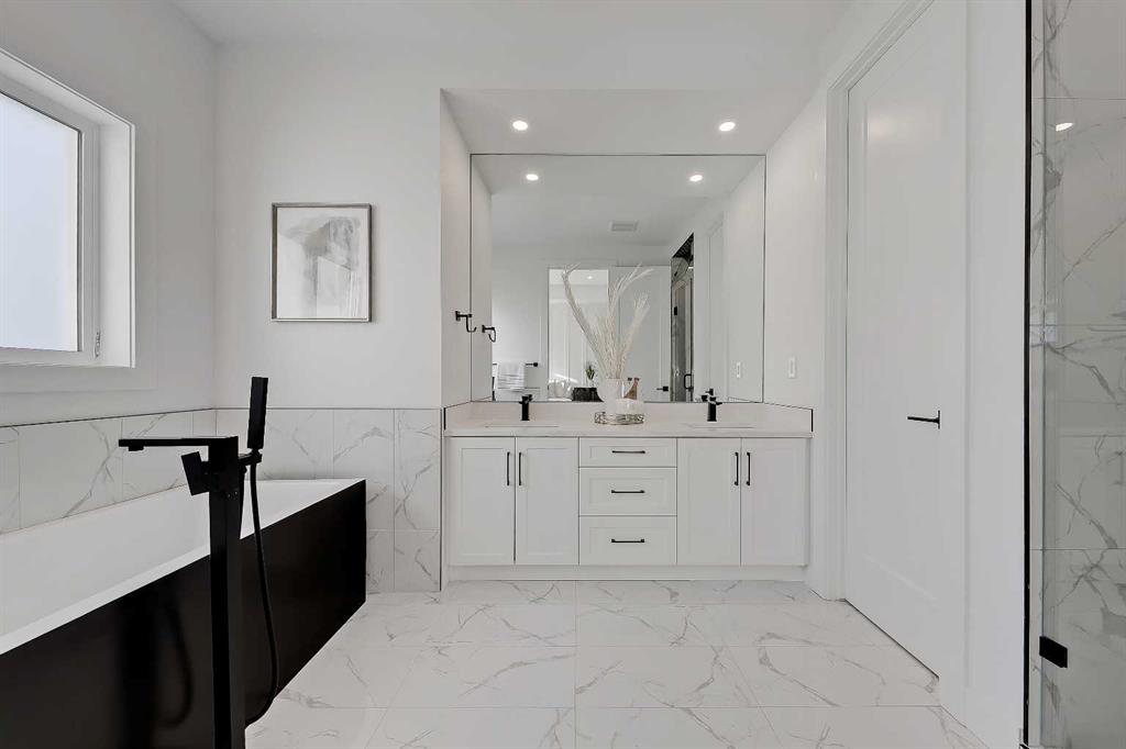 Upstairs, the primary bedroom feels like a true retreat. Calm, spacious, with a tall tray ceiling – the space is thoughtfully finished with a walk-in closet and a spa-inspired ensuite featuring heated floors, dual vanities, a deep soaker tub, and a glass-enclosed shower. Two additional bedrooms share a beautifully finished full bathroom, and upper-level laundry keeps life simple and organized.