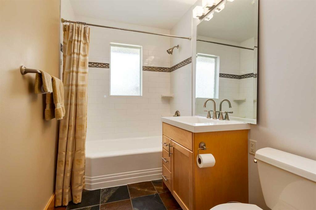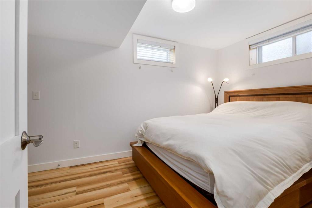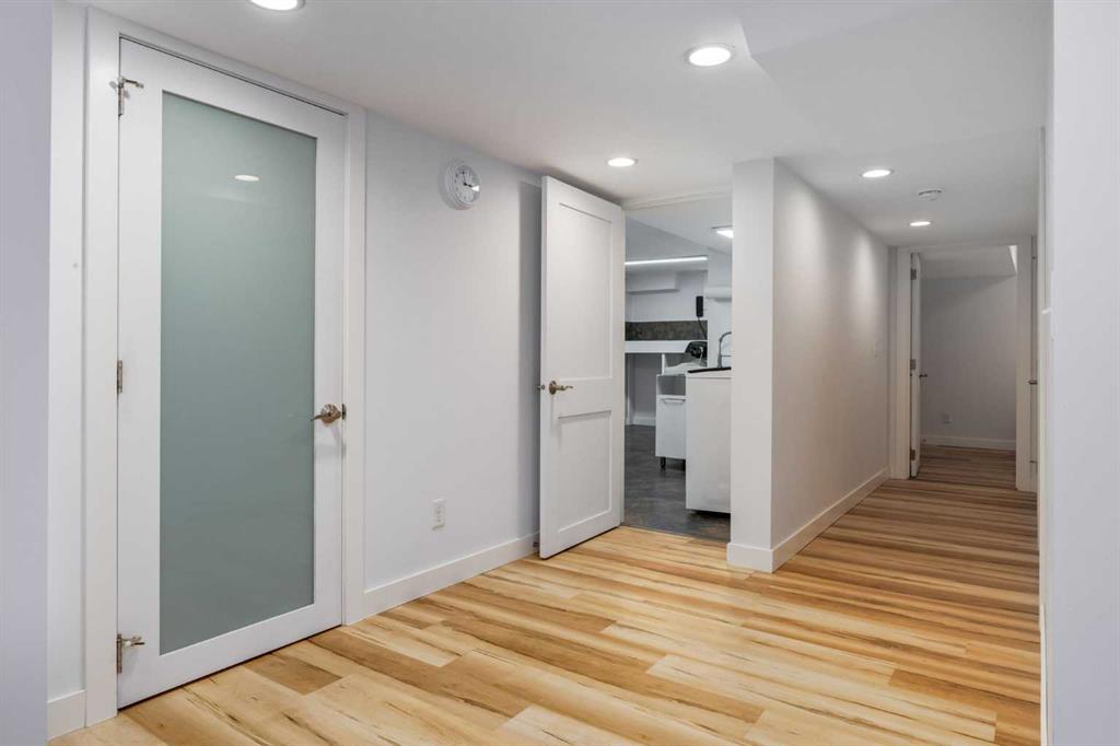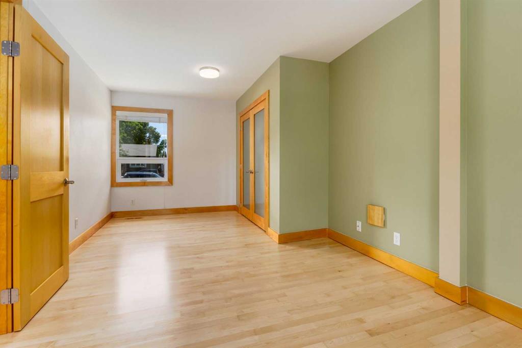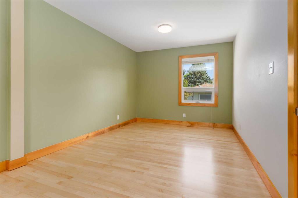 The large primary bedroom easily accommodates a king-size bed and offers flexibility, it can be converted back into two separate rooms, transforming the home into a four-bedroom layout. A full bathroom with custom maple cabinetry completes the main floor.