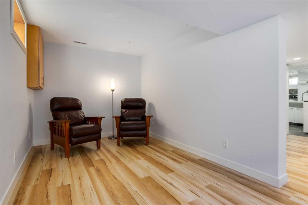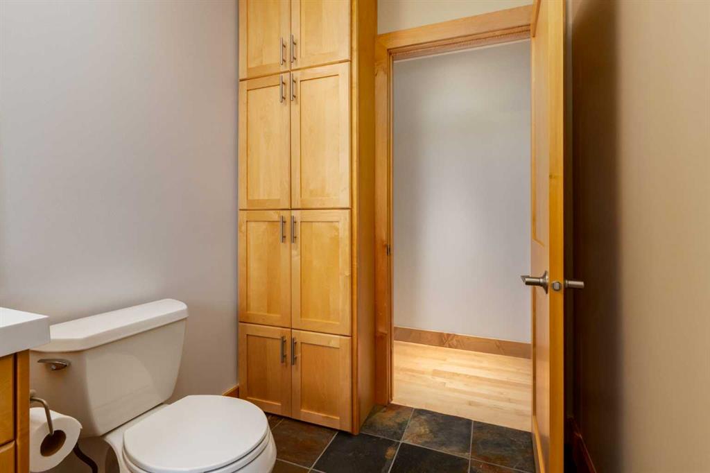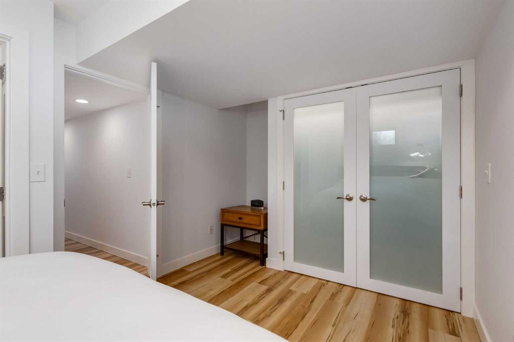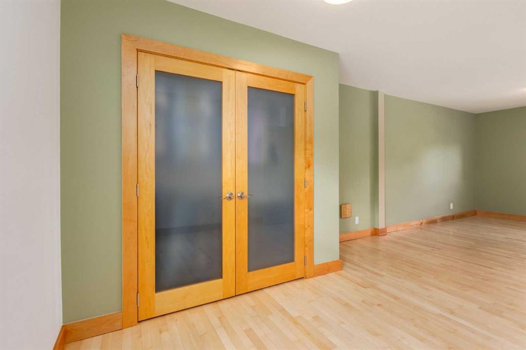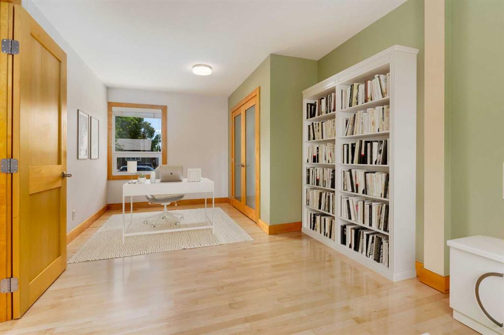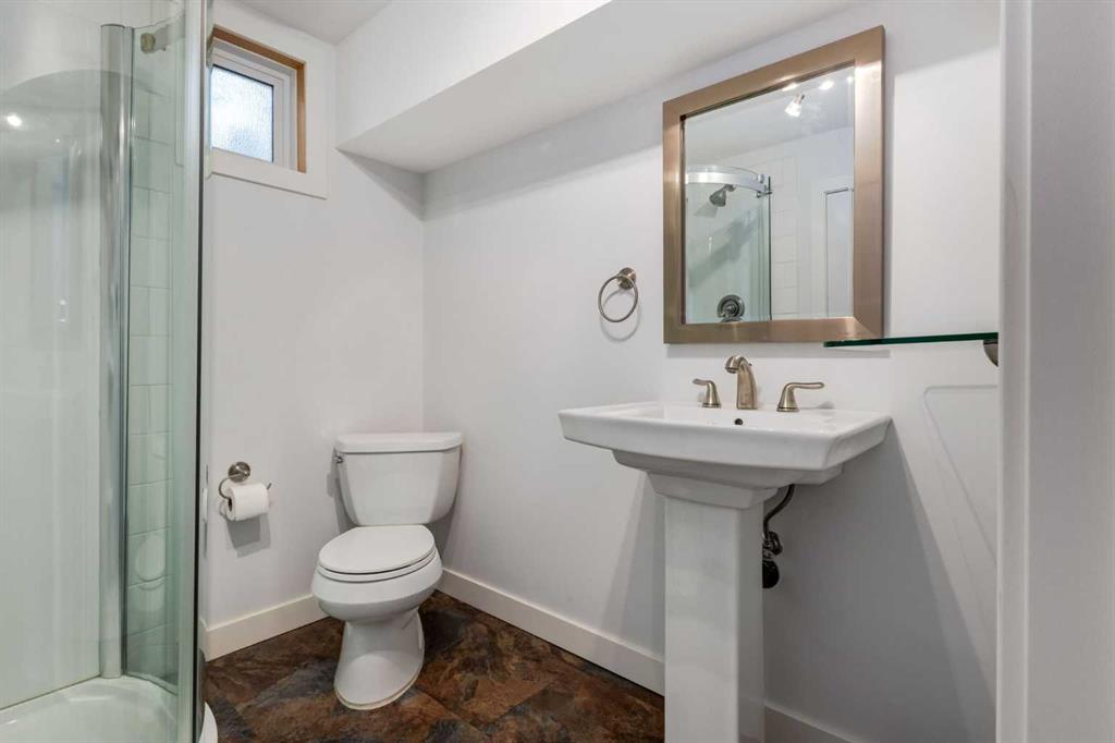 The large primary bedroom easily accommodates a king-size bed and offers flexibility, it can be converted back into two separate rooms, transforming the home into a four-bedroom layout. A full bathroom with custom maple cabinetry completes the main floor.
