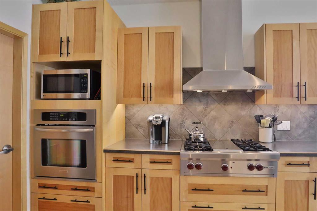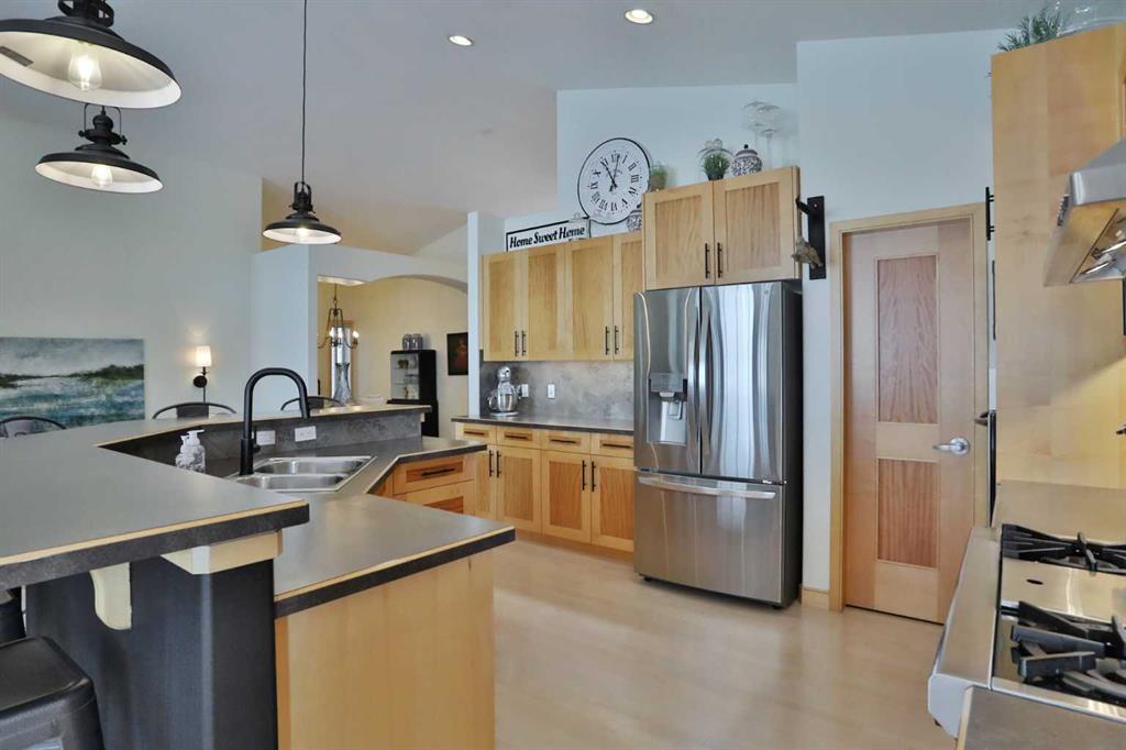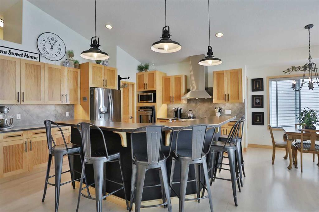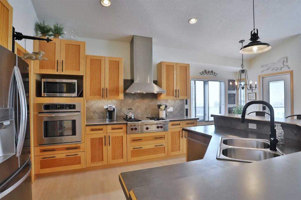 A rare opportunity you won’t want to miss here in this beautifully updated bungalow backing onto the escarpment in the popular Symons Valley community of Sherwood. Offering a total of 3 bedrooms + den & over 2900sqft of living space, this mint condition air-conditioned home enjoys refinished onsite maple hardwood floors, stunning kitchen with custom maple/mahogany cabinetry, sensational lower level with infloor heating & beautifully landscaped backyard with lush perennial gardens & stone patio..plus a host of improvements including storm-resistant roof, hot water tank & appliances. Truly incredible open concept main floor with soaring vaulted ceilings, showcasing the sun-drenched living room with fireplace & expanse of windows, elegant formal dining room with graceful archway & custom kitchen with large island & ceramic tile backsplash, oversized walkthru pantry & the upgraded stainless steel appliances include Wolf gas cooktop with built-in griddle & chimney hoodfan, built-in Frigidaire Pro convection oven, & new dishwasher (2025) & fridge (2024)…both from LG. The private owners’ retreat is an airy & inviting space with a big bay window, great-sized walk-in closet & jetted tub ensuite with double vanities, tile floors & separate shower. Renovated in 2022 (with permits), the lower level – with 9ft ceilings & infloor heating, is beautifully finished with 2 bedrooms, large full bath with linen closet, office/craft room with barn door closet & terrific games/rec room…the perfect spot to hang out with the family. Main floor also has a dedicated home office with French doors & laundry room with built-in cabinets/sink & new LG washer & dryer (2025). Both the front & back yards are exquisitely & professionally landscaped…with stone walkways & patio, new permanent outdoor Gemstone X-mas lights (2025), 3-tiered concrete fountain (backyard) & deck complete with natural gas line for your BBQ, under-deck storage & Duradek weather-protection deck. Extensive features including plantation shutters (lower level) & 2” Levolor blinds (main level), finished garage with new heater (2024) & sealed floors, solid maple doors & cabinets with mahogany inserts, exposed aggregate front walkway & driveway, glass hand railings & in addition to the new roof in 2025 & refinished hardwood floors in 2026, there are new light fixtures, 2 new industrial-size/high-efficiency hot water tanks (2025), brand new furnace (2026), new central air (2023) & new main floor carpets (2024). A simply amazing home just minutes to neighbourhood greenspaces & Blessed Marie-Rose School, walking distance to bus stops & quick easy access to shopping (including Beacon Hill, Sage Hill Crossing & Sage Hill Quarter) & Stoney/Sarcee/Shaganappi Trails.
