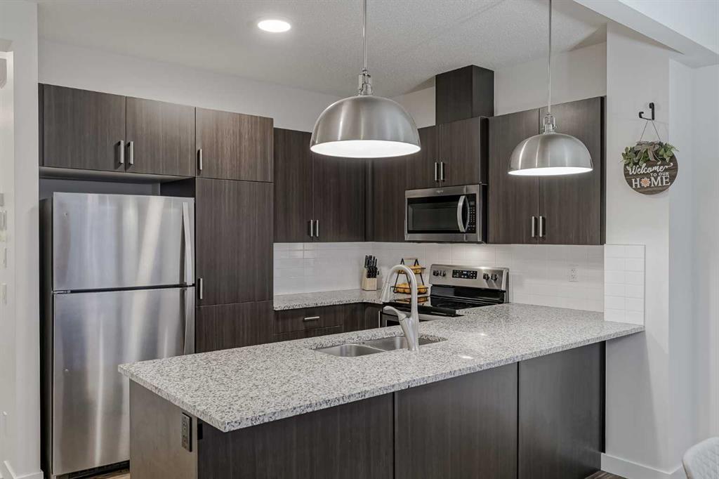 This beautifully designed townhome stands out from the rest — offering true main-floor living where your kitchen, dining, and living areas are all on the same level you enter from the garage. No stairs to climb just to reach your main living space! Step inside to discover an inviting open-concept layout featuring 9-foot ceilings, stylish lighting, and a seamless blend of tile and laminate flooring. The modern kitchen shines with stainless steel appliances, granite countertops, subway tile backsplash, and a convenient breakfast bar — perfect for morning coffee or casual dining. The adjoining living and dining areas flow effortlessly to a sunny, south-facing patio, ideal for relaxing or entertaining. A guest powder room and direct garage access complete this thoughtfully designed main level. Upstairs, you’ll find two exceptionally spacious bedrooms, each featuring its own private ensuite bathroom and walk-in closet — perfect for guests, roommates, or a dual-owner setup. The laundry area is conveniently located on this level for everyday ease. The fully finished basement adds even more living space with a large recreation or family room — perfect for movie nights, a home gym, or office setup. With quick access to Stoney Trail, Macleod Trail, and nearby communities like Walden, Legacy, and Shawnessy, you’re just minutes from shopping, dining, schools, and all major amenities. This is one of the few townhomes that truly offers main-floor living — blending modern comfort, functionality, and a low-maintenance lifestyle all in one.