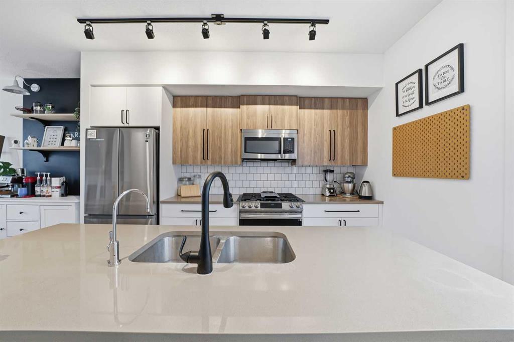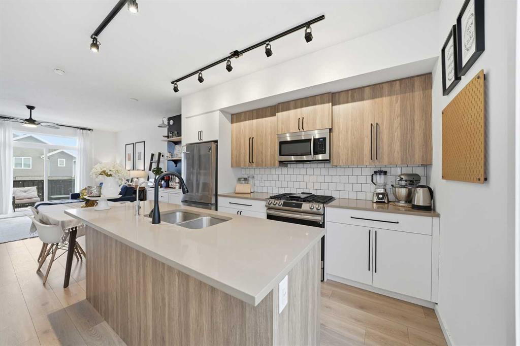 Welcome to this charming, meticulously maintained Walden townhome! Offering 2 bedrooms, 2.5 bathrooms, and single garage with driveway. Step inside to 9-foot knockdown ceilings that create a bright, spacious main floor. The open-concept layout seamlessly connects the living, dining, and kitchen areas, with large windows bathing the space in natural light and showcasing high-quality finishes. The chef-inspired kitchen boasts quartz countertops, stainless steel appliances, ample cabinetry, and a breakfast bar—perfect for casual dining or entertaining. Upstairs, you’ll find generously sized bedrooms, including a primary suite with a large closet and ensuite featuring modern fixtures and dual vanities. Located in the vibrant community of Walden, close to picturesque surroundings and essential amenities, this move-in-ready townhome combines modern style with functional comfort. Don’t miss your chance to experience the best of Walden living—schedule your viewing today!