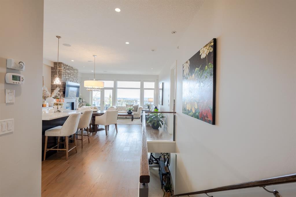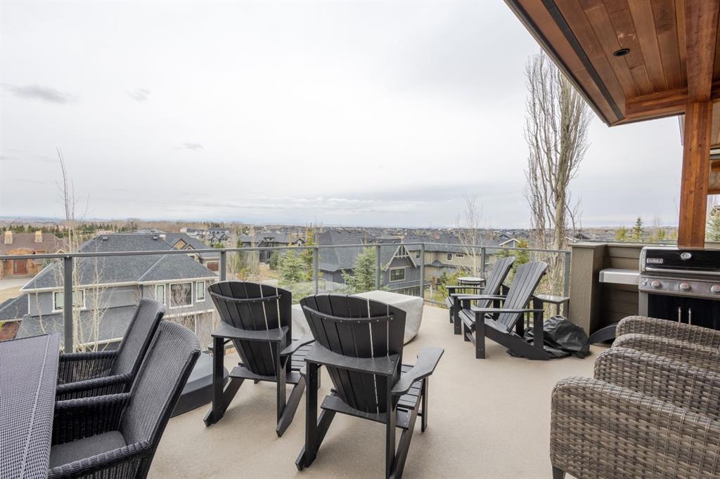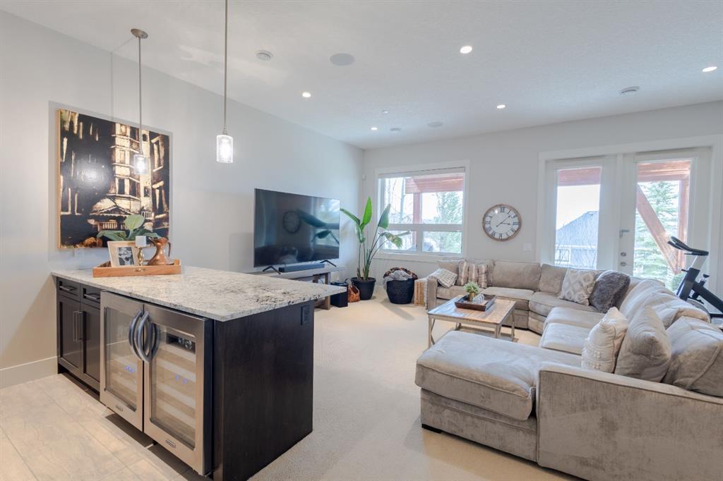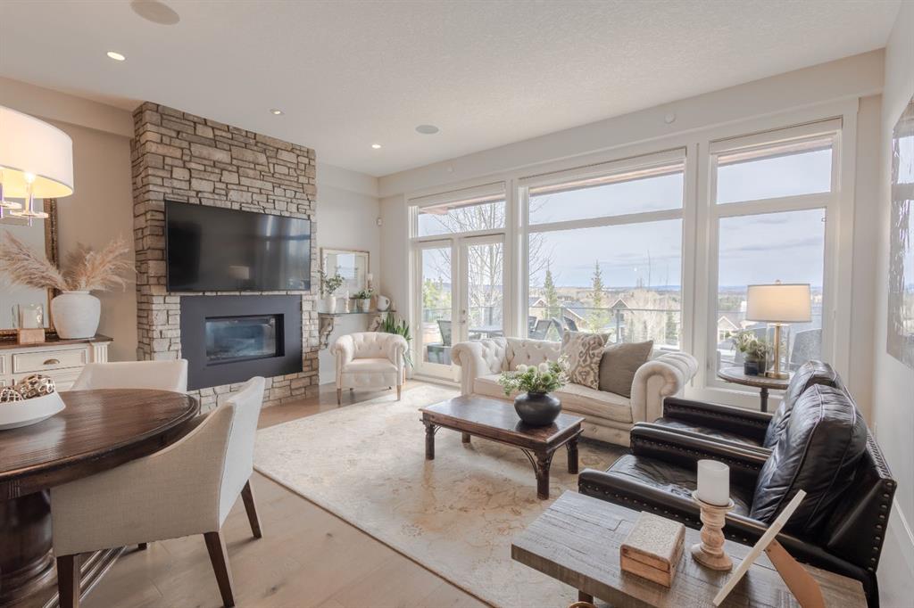 Step into upscale villa-style living with this exceptional 3-bedroom, 2.5-bath home showcasing sweeping panoramic mountain views. Inside, soaring 10-foot ceilings span both the main and lower levels. Expansive windows flood the space with natural light, creating an airy, open feel throughout. The chef-inspired kitchen features stainless steel appliances, a gas cooktop, a subway tile backsplash, quartz countertops, and a large island with breakfast bar seating—plus plenty of cabinetry for storage. The open-concept layout flows seamlessly into the dining area and living room, making it ideal for entertaining while enjoying the stunning scenery from every angle. The living room is anchored by a striking gas fireplace with a full-height stone surround and wood mantle, and it offers direct access to a spacious rear deck overlooking breathtaking views. The primary suite serves as a peaceful retreat, complete with a generous walk-in closet with custom built-ins and a luxurious 5-piece ensuite featuring a dual vanity, standalone shower, soaking tub, and private water closet. The main level also includes a well-equipped laundry room with a sink and storage, a 2-piece powder room, and entry to the heated double attached garage, which features epoxy flooring, high ceilings, and extensive shelving. Downstairs, in-floor heating adds comfort throughout the lower level, which includes two spacious bedrooms and a 4-piece bathroom with a double vanity and a large shower. A secondary family and entertainment area features a stylish wet bar with seating, a dishwasher, a sink, ample cabinetry, and dual beverage fridges. This area also has walkout access to the lower patio. Additional highlights include a Kinetico water system with a softener and reverse osmosis, a Sonos sound system, a phantom screen door, blackout blinds in the primary suite, a newer tankless hot water system with a backup tank, and central vacuum. Ideally located near shopping, amenities, and Lynx Ridge Golf Course, this home is also just steps from the community clubhouse and an extensive network of scenic walking paths. This beautifully designed walkout bungalow offers the perfect blend of comfort, style, and natural beauty—ready to welcome you home.