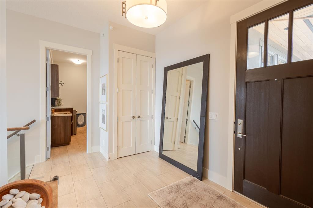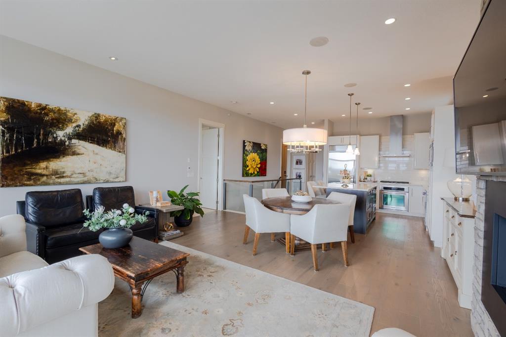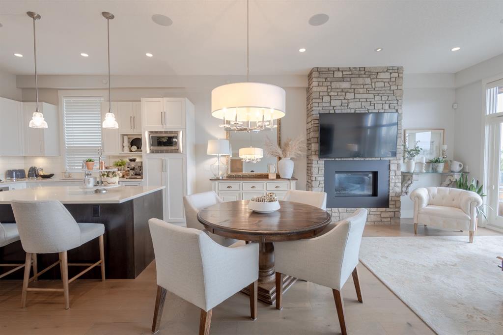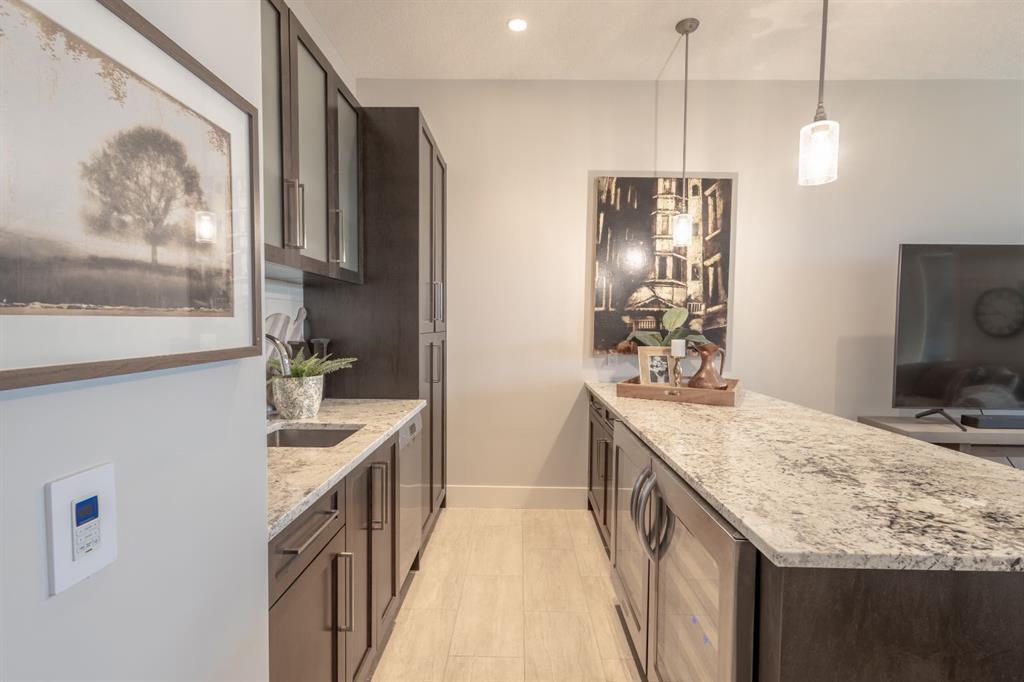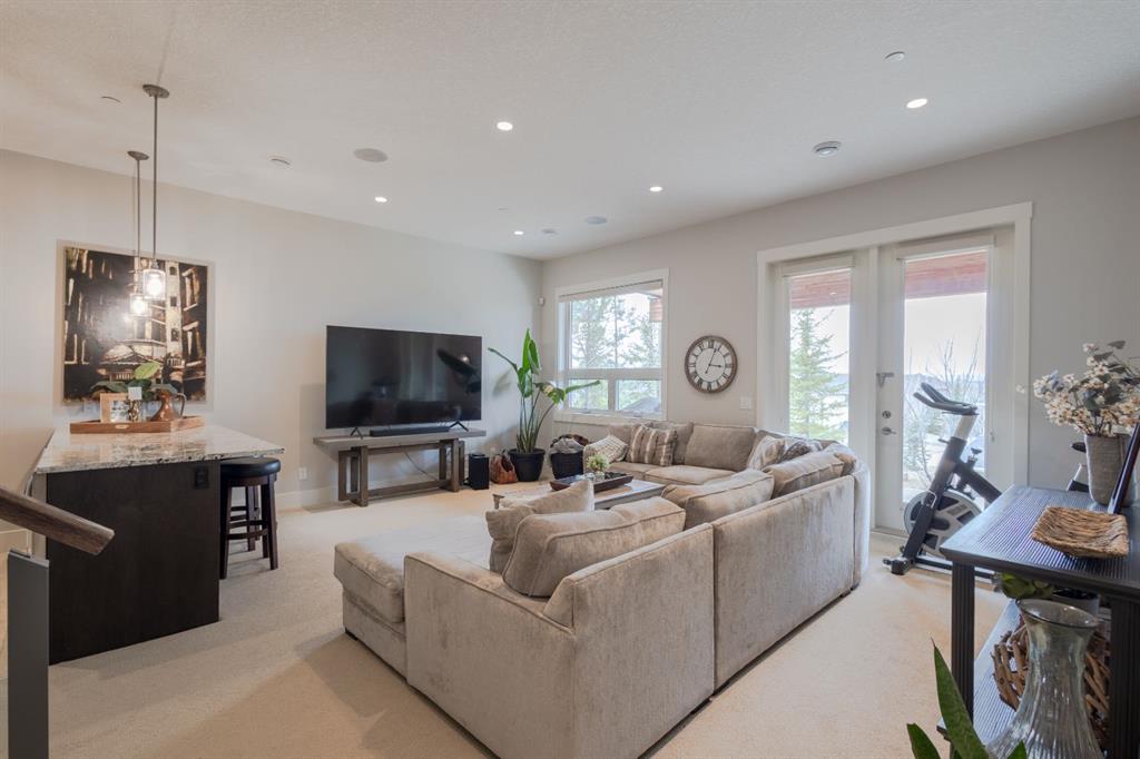 Step into upscale villa-style living with this exceptional 3-bedroom, 2.5-bath home showcasing sweeping panoramic mountain views. Inside, soaring 10-foot ceilings span both the main and lower levels. Expansive windows flood the space with natural light, creating an airy, open feel throughout. The chef-inspired kitchen features stainless steel appliances, a gas cooktop, a subway tile backsplash, quartz countertops, and a large island with breakfast bar seating—plus plenty of cabinetry for storage. The open-concept layout flows seamlessly into the dining area and living room, making it ideal for entertaining while enjoying the stunning scenery from every angle. The living room is anchored by a striking gas fireplace with a full-height stone surround and wood mantle, and it offers direct access to a spacious rear deck overlooking breathtaking views. The primary suite serves as a peaceful retreat, complete with a generous walk-in closet with custom built-ins and a luxurious 5-piece ensuite featuring a dual vanity, standalone shower, soaking tub, and private water closet. The main level also includes a well-equipped laundry room with a sink and storage, a 2-piece powder room, and entry to the heated double attached garage, which features epoxy flooring, high ceilings, and extensive shelving. Downstairs, in-floor heating adds comfort throughout the lower level, which includes two spacious bedrooms and a 4-piece bathroom with a double vanity and a large shower. A secondary family and entertainment area features a stylish wet bar with seating, a dishwasher, a sink, ample cabinetry, and dual beverage fridges. This area also has walkout access to the lower patio. Additional highlights include a Kinetico water system with a softener and reverse osmosis, a Sonos sound system, a phantom screen door, blackout blinds in the primary suite, a newer tankless hot water system with a backup tank, and central vacuum. Ideally located near shopping, amenities, and Lynx Ridge Golf Course, this home is also just steps from the community clubhouse and an extensive network of scenic walking paths. This beautifully designed walkout bungalow offers the perfect blend of comfort, style, and natural beauty—ready to welcome you home.