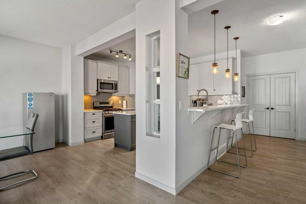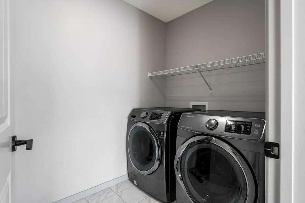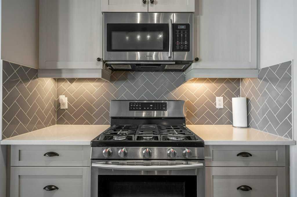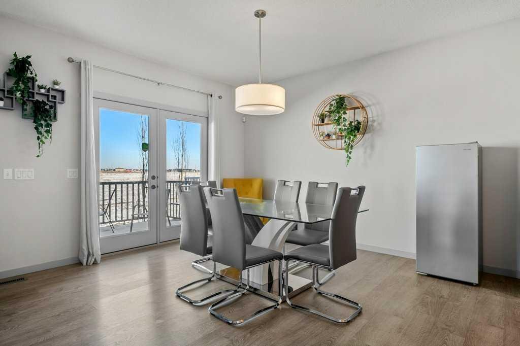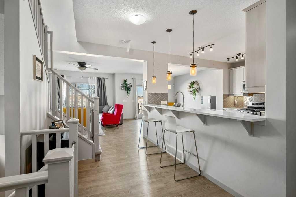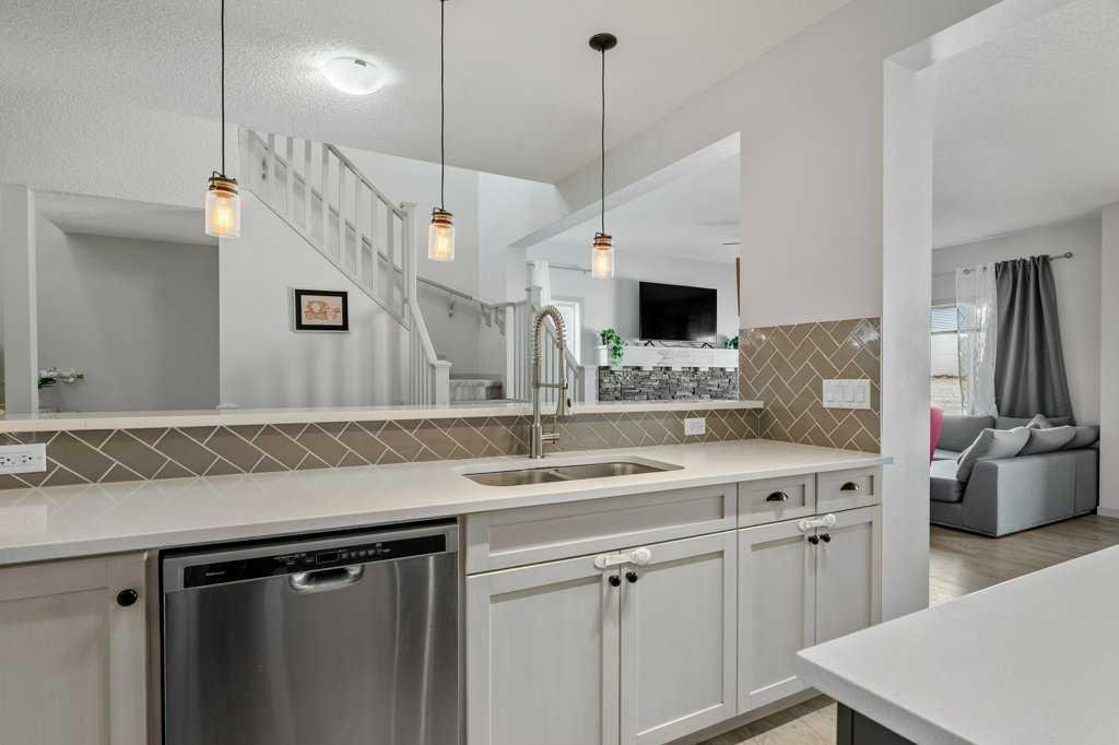 Step inside to 9’ ceilings and neutral tones throughout, creating a bright and welcoming atmosphere. A convenient side mudroom with a 2-piece bathroom sits just off the entry, while the back of the home opens into an entertainment-style layout designed for modern living. The kitchen features a full appliance package including a gas stove, extended cabinetry, quartz countertops, prep island, walk-through pantry, herring bone backsplash—anchored by a massive eating bar overlooking the spacious family-size dining area with access via the sliding doors to the upper vinyl deck wrapped in railing.