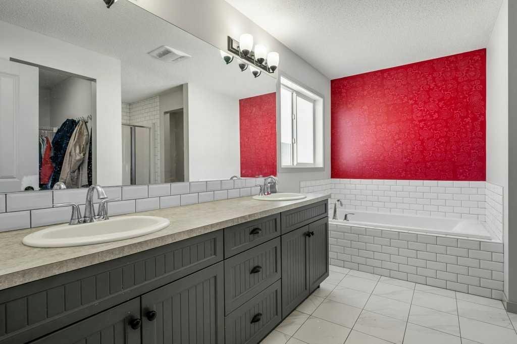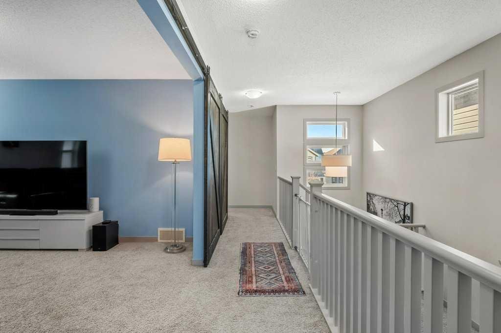 The rear family room is warmed by a focal gas fireplace with upper mantle and lower hearth, perfectly positioned to capture brilliant east-facing morning light. Open railings and transom windows lead upstairs to a thoughtfully designed upper level, highlighted by a central bonus room with barn door closure. Two front children’s bedrooms share a tiled 4-piece bathroom accented with subway tile, while an upper laundry room adds everyday convenience. The rear primary retreat easily accommodates a king-size bed and includes a walk-in closet and spa-inspired 5-piece ensuite featuring tiled floors, dual sinks, a deep soaker tub wrapped in tile accents, and an oversized walk-in shower.