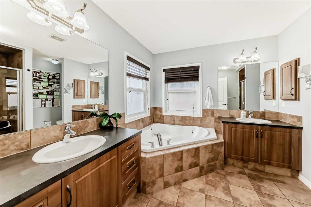 Upstairs, retreat to the spacious primary suite boasting a large ensuite with dual sinks, a soaking tub, and a standalone shower, plus a generous walk-in closet. Two additional bedrooms and a 4pc bath offer plenty of space for family or guests. The full, unfinished basement (with laundry) includes sturdy wooden shelving and is ready for your creative touch. With Central AC, a large parking pad, and a quiet, friendly street, this home is move-in ready!