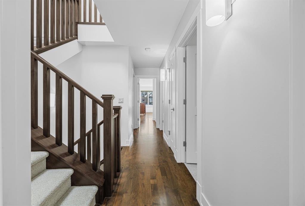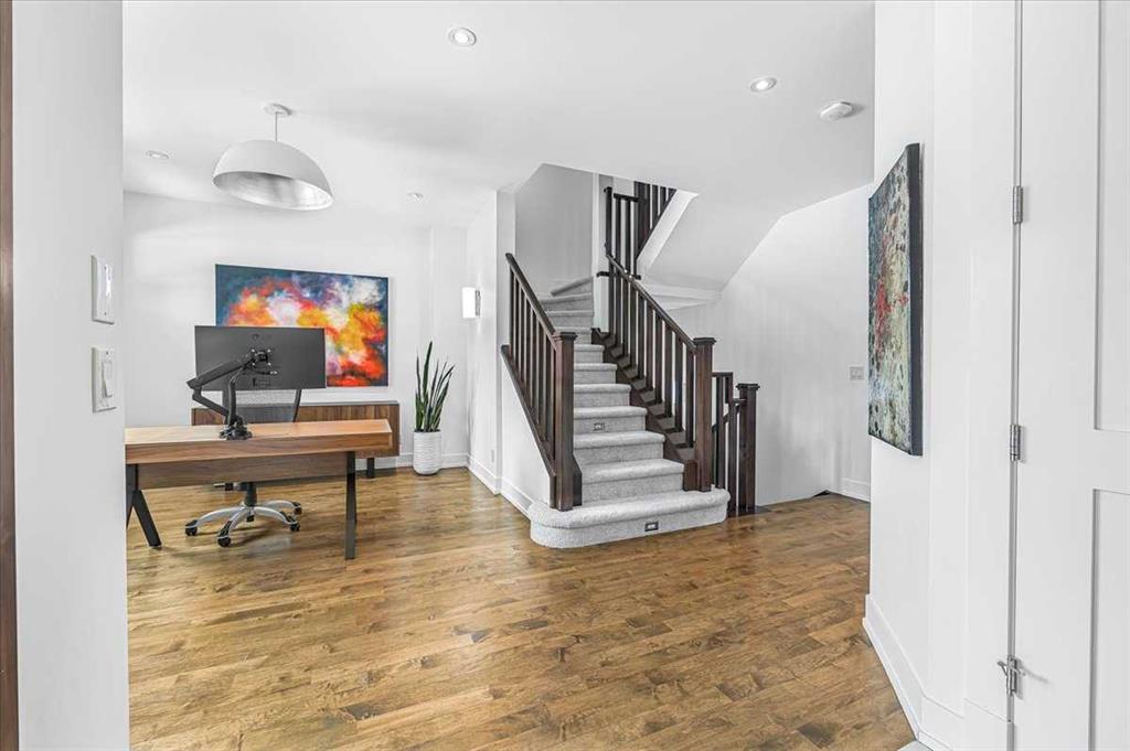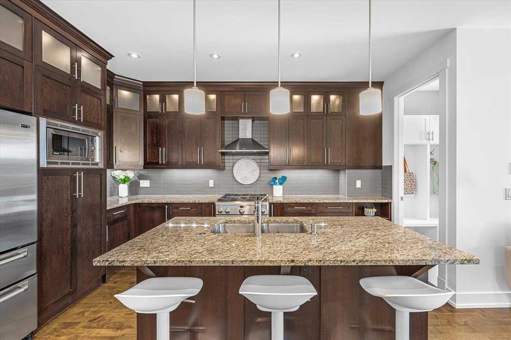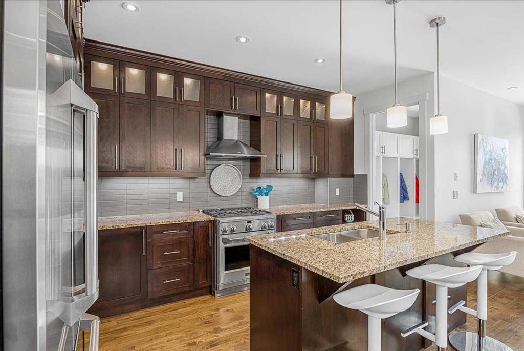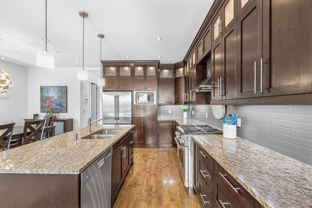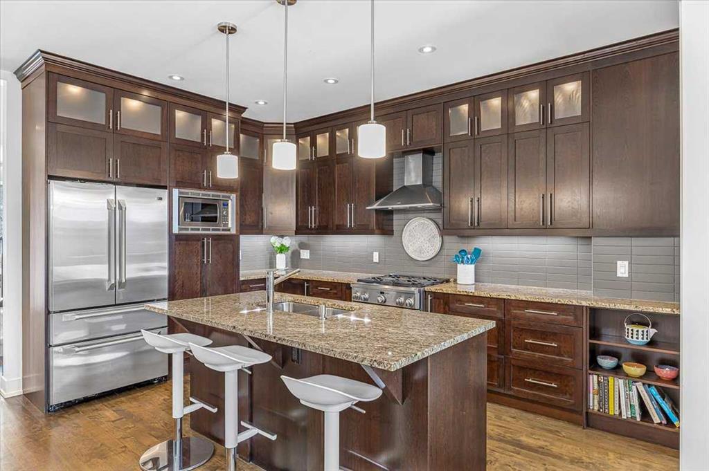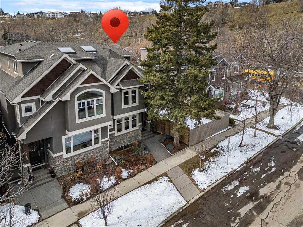 Welcome to elevated living in one of Calgary’s most coveted inner-city neighbourhoods – Sunnyside. This stunning thoughtfully designed three storey semi-detached executive home delivers luxury finishes and an unbeatable lifestyle in the heart of Calgary. Featuring 4 bedrooms and 5 bathrooms, on a quiet street – nestled near McHugh’s Bluff. Over 2500 sq ft above ground on three levels and a fully finished basement. The main level has an open floor plan, kitchen, dining and living area adjacent to each other – ideal for family life or entertaining. The kitchen includes quartz counter tops, full height cabinetry, 6 burner gas range, a breakfast bar and plenty of space to prepare meals and store items. The spacious back door mudroom has built in cabinetry to store your seasonal items & clothing – offering easy entry & exit.. Ascend to the second level to a spacious master bedroom with spa-inspired en-suite complete with dual vanities, heated floors, steam shower, jet soaker tub and a water closet. Rounding out the second level is 2 more bedrooms, a 4 pc bath and separate laundry room. The third level has a generous flex space, 2 pc bathroom and storage closet – perfect for home office, play/hobby room or guest suite. Descend to the lower level where you can unwind in the home gym, entertain at the sophisticated wet bar or relax while watching movies or having a game night. Step outside to the deck and enjoy a meal you’ve prepared with your gas BBQ while taking in the resort like tranquil pond feature & professionally landscaped grounds. Or cozy up to the firepit area for evening gatherings. A poured aggregate walkway leads from front door all the way to the double garage and patio area. The home is situated directly across the street from a park – offering a rare view of green space and has a walking/bike path connecting you to Calgary’s pathway network with ease. A 15 minute walk takes you to downtown Calgary or to Kensington where if offers – boutique shops, acclaimed restaurants and a vibrant community life. This home is built for modern executives & families alike. View this gorgeous home today – where luxury meets nature and urban convenience – perfectly balanced!