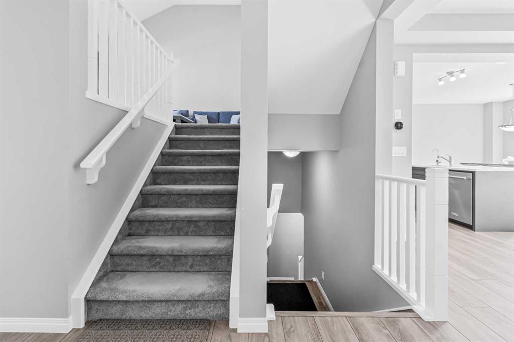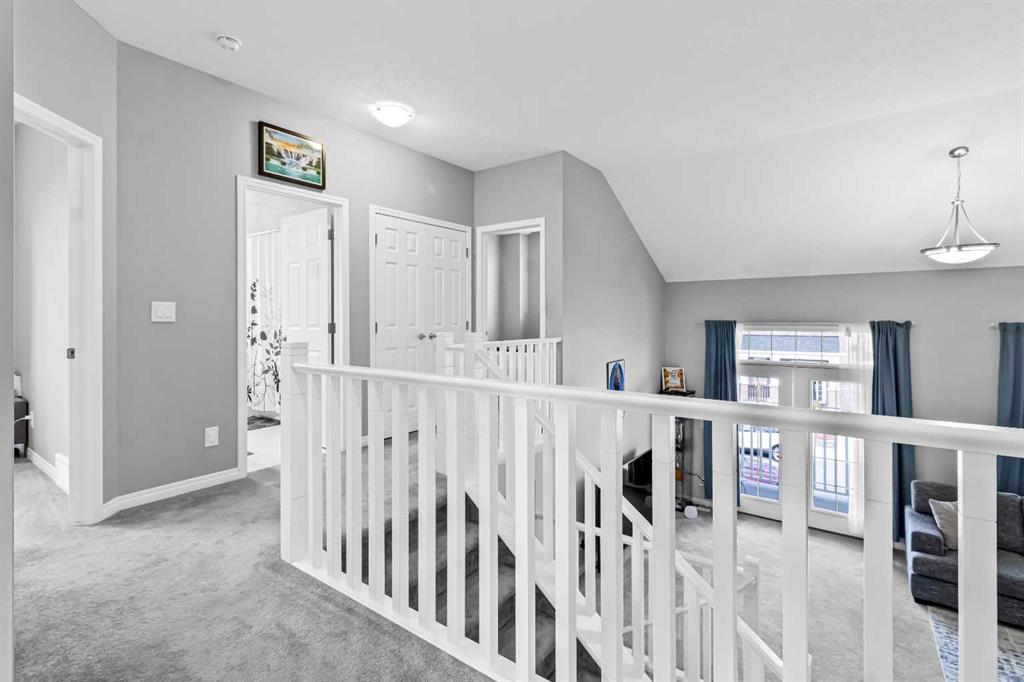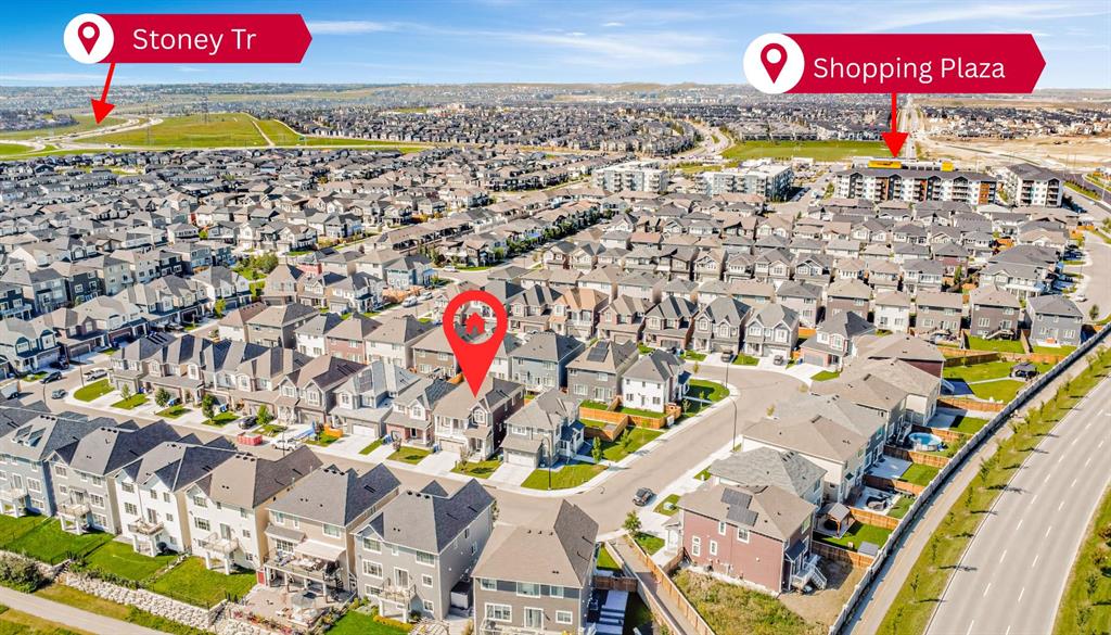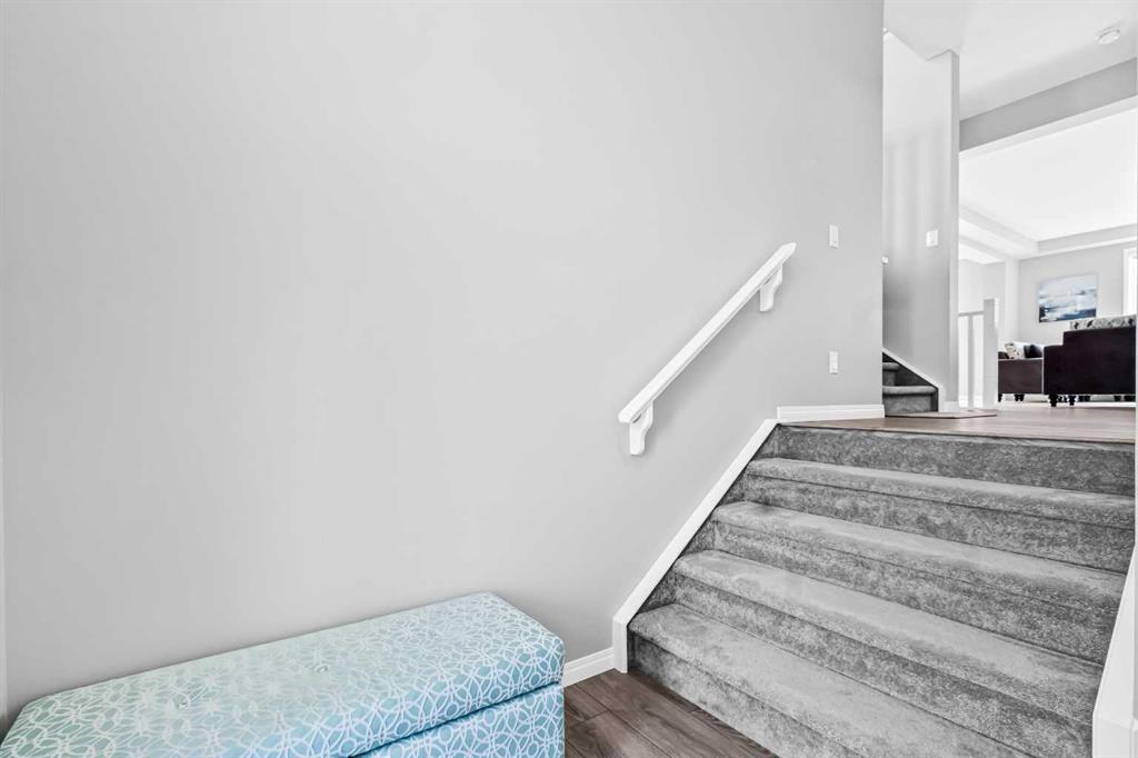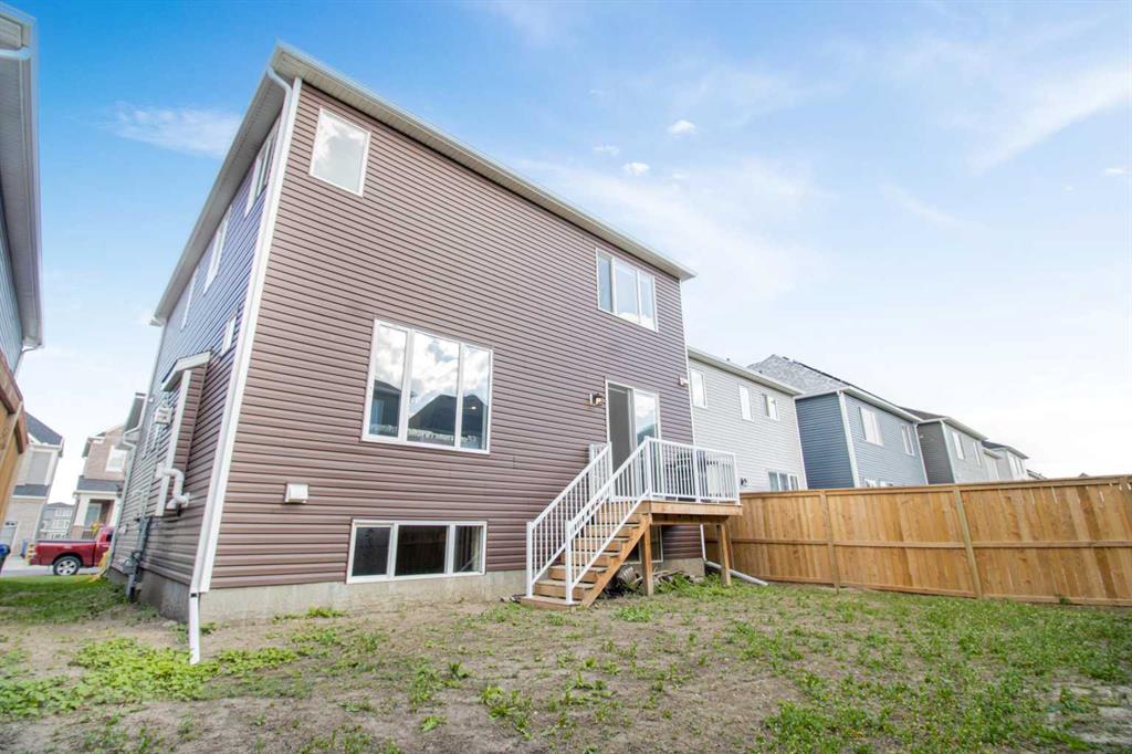 Offering 2,380+ SQFT of modern living space, this beautifully designed 2-storey home, built in 2020, is perfect for a growing family. Step inside to a grand 12-foot foyer that sets the tone for the open-concept main floor. With 9-foot ceilings and luxury vinyl flooring, the layout seamlessly blends style and functionality. The living room features a sleek gas fireplace, creating a warm and inviting atmosphere for relaxing or entertaining. The chef-inspired kitchen is equipped with quartz countertops, a central island, a walk-in pantry, and stainless steel appliances including a gas stove. Just off the kitchen, the dining nook offers the ideal setting for family meals and gatherings. A stylish half bath and a convenient laundry room complete this level. Upstairs, you’ll find a bonus room with soaring 14-foot vaulted ceilings and oversized windows that fill the space with natural light. Step out onto the private front balcony to enjoy sunrises and peaceful mornings. The primary suite is a true retreat, featuring a spacious walk-in closet and a spa-like 5-piece ensuite with a soaker tub, oversized glass shower, and dual vanity. Two additional bedrooms and a full 4-piece bath provide comfort and flexibility for family or guests. The full unfinished basement is ready for your personal touch, complete with rough-in plumbing for a future bathroom—ideal for a home gym, media lounge, or extra living space. Additional highlights include a double attached garage, a Virtuo Fresh Air System for optimal indoor air quality, and a fenced backyard— perfect for gardening, pets, or summer BBQs. Located close to parks, pathways, Carrington Plaza, and with easy access to Stoney Trail and the future Green Line LRT, this home truly has it all.