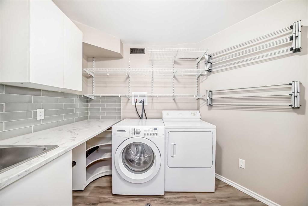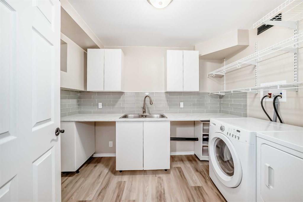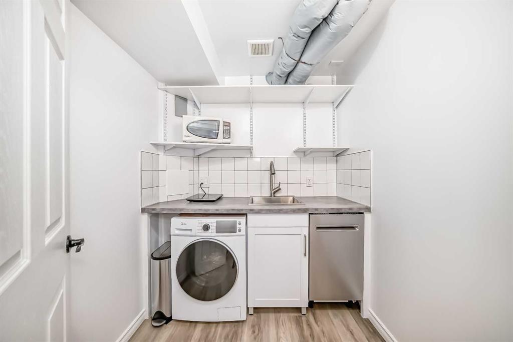 The flexible use basement development was completed with permits. There is a large rec room or 4th bedroom plus an adjacent 4-pce bathroom with newer vanity, and a big laundry room with a sink and roughed-in for a dishwasher or fridge. Separately, an illegal mother-in-law suite, previously rented for $1400, has vinyl plank floor in the 2 bedrooms, a kitchenette with a dishwasher, sink, fridge, high efficiency washer/dryer combo, new bathroom with tile floor, and custom pocket shelf auto light hallway feature. Newer egress windows in the basement, all new PEX plumbing and manifold, plus understair storage.