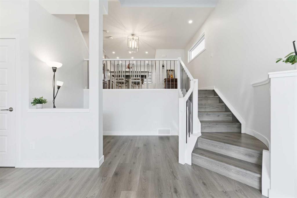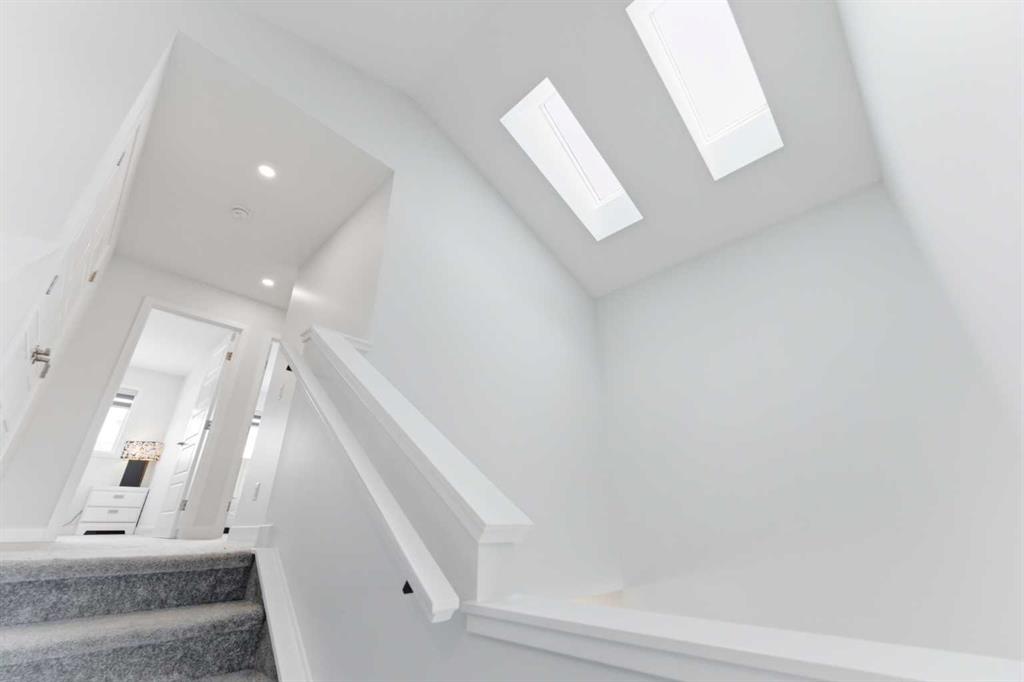 Step inside to a bright and dramatic open-to-below main living area, enhanced by skylights and massive windows that flood the space with natural light. The main floor is finished with durable waterproof laminate flooring throughout, creating a seamless and modern look. The inviting living room showcases a sleek electric fireplace, perfectly complementing the stylish kitchen.