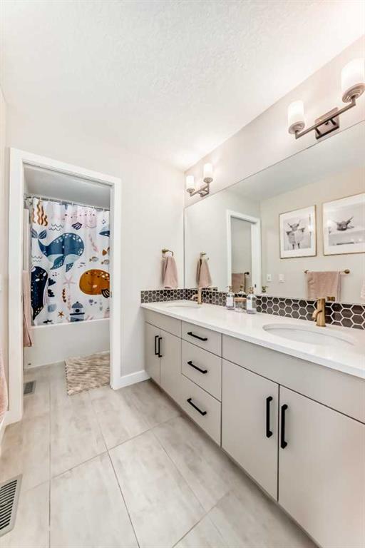 Upstairs is where this home really delivers for families. A central bonus room creates a flexible hangout space, the laundry is exactly where you want it—upstairs—and the three bedrooms are well separated for privacy. The primary bedroom includes a walk-in closet and a spacious ensuite with dual sinks, a deep soaker tub, and a separate shower.