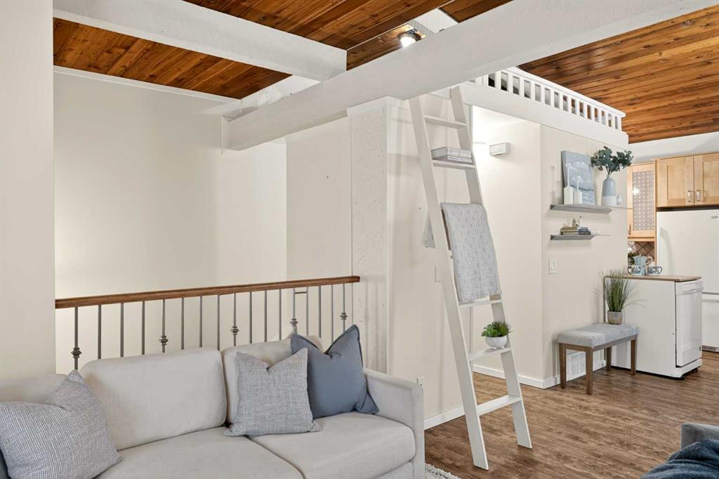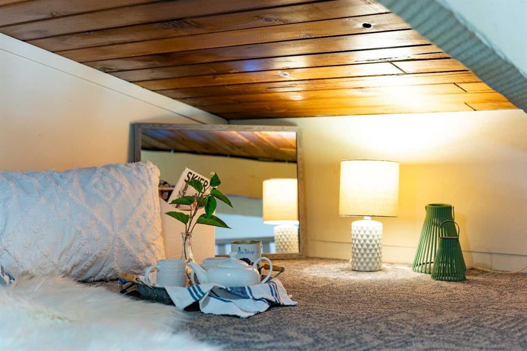 Upstairs, WOOD-BEAMED VAULTED CEILINGS wrap the main living space in warmth and character, creating a cozy, open setting where the living, dining, and kitchen gather naturally under one inviting roofline. It’s intimate without feeling tight — perfect for slow mornings with coffee, easy dinners with friends, and unhurried evenings curled up by the fireplace. The charmingly RENOVATED KITCHEN feels collected rather than cookie-cutter, blending thoughtful updates with cottage personality. And tucked above it all, a SWEET HIDEAWAY LOFT offers that rare bonus space — a secret nook for streaming, reading, overnight guests, or simply disappearing for a quiet moment.
