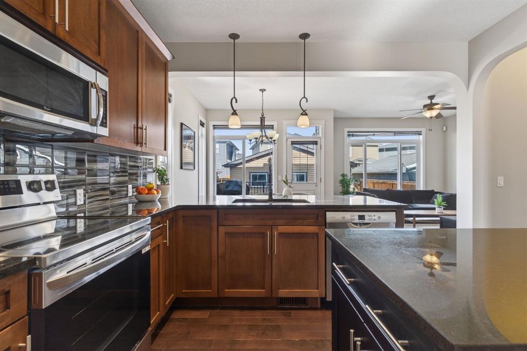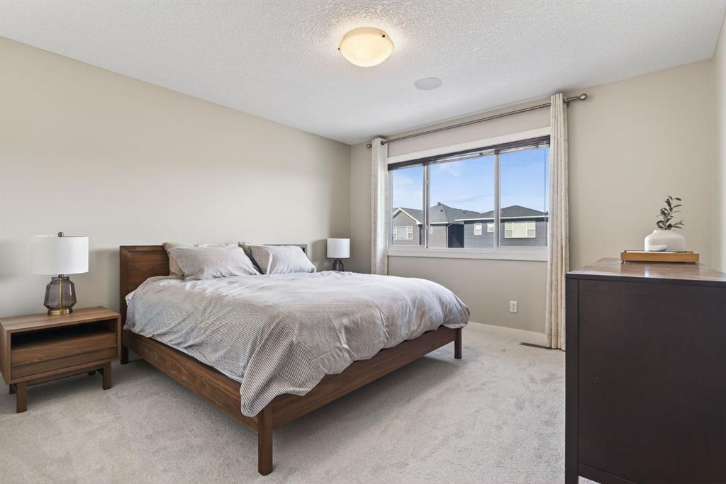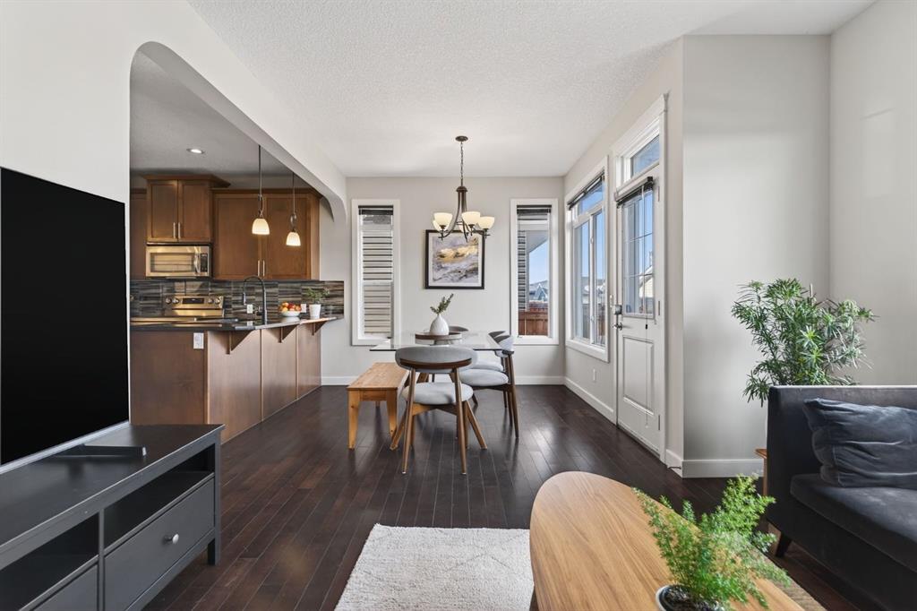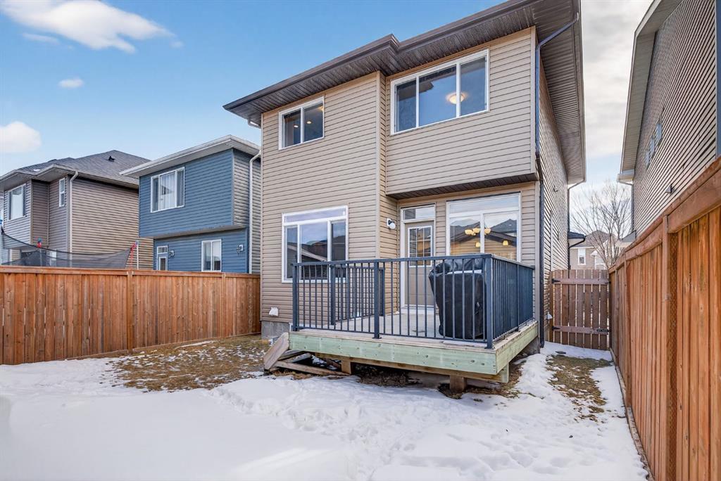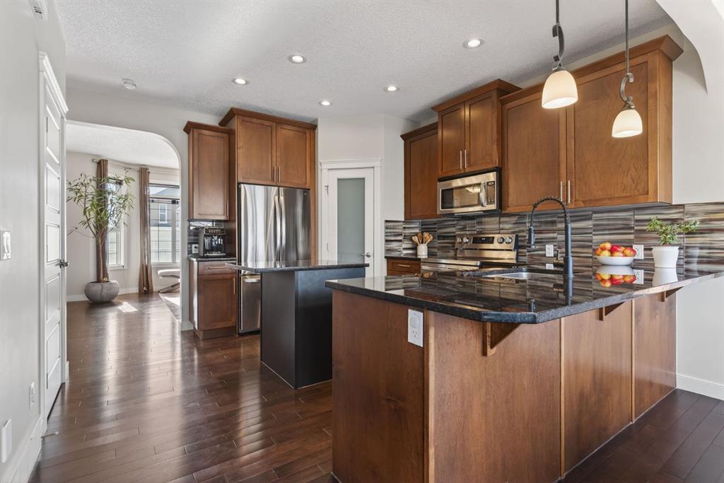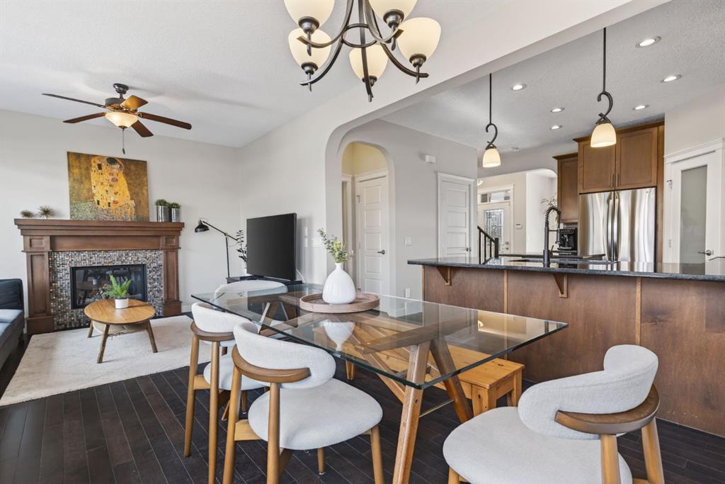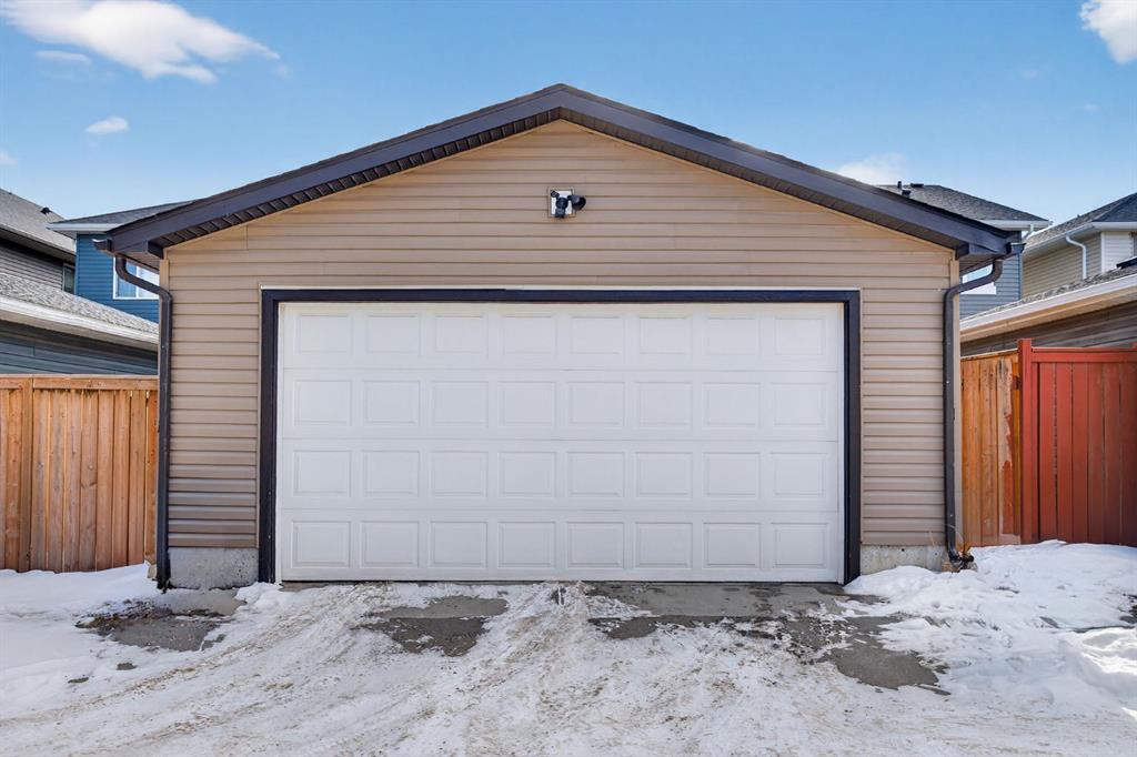 Welcome to this beautifully maintained former showhome in the heart of Evanston — offering timeless style, thoughtful upgrades, and over 2,300 sq ft of fully developed living space designed for both connection and comfort. Built in 2011, this 2-storey home stands out with its subtle midcentury modern influence, warm maple cabinetry, rounded architectural arches, and a layout that feels open yet intentional. The main floor seamlessly blends the kitchen, dining, and living spaces — creating an ideal environment for everyday living and effortless entertaining. The kitchen features granite countertops, stainless steel appliances, a central island, and a walk-in pantry, all anchored by rich cabinetry and classic finishes that feel elevated without feeling trendy. The adjacent living room is warm and inviting with a gas fireplace, while large windows fill the space with natural light. Upstairs, you’ll find three spacious bedrooms including a generous primary retreat complete with a 5-piece ensuite featuring a double vanity, soaking tub, separate shower, and walk-in closet. A full 4-piece bathroom and convenient upper laundry room complete this level — adding everyday functionality for busy households. The fully finished basement expands your living space with a large recreation and entertainment area, an additional bedroom, full bathroom, and a built-in wet bar — creating the ultimate movie night, game day, or hosting space. As a former showhome, this property is exceptionally well-appointed with air conditioning, built-in speakers throughout the top two floors, granite countertops, maple cabinetry, and carefully selected finishings throughout. Outside, enjoy a private fenced backyard and a detached oversized double garage with ample room for storage and larger vehicles — a rare and valuable feature. Located in the family-friendly community of Evanston, close to parks, schools, pathways, shopping, and major routes for easy commuting, this home offers the perfect blend of design, functionality, and lifestyle.