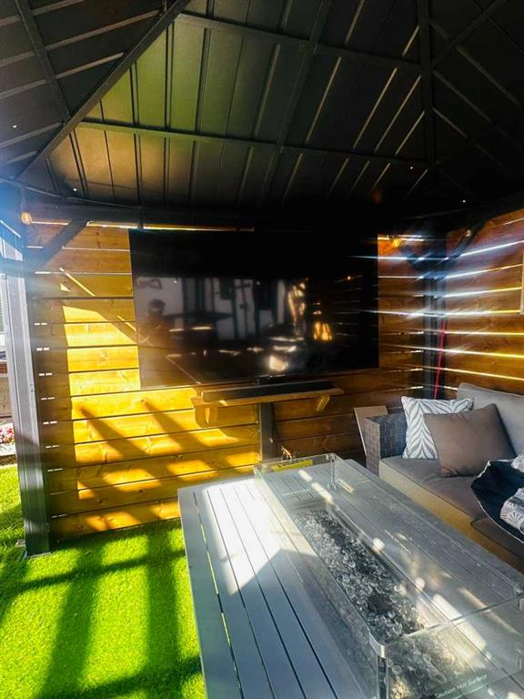 Lot Size: 50 x 49 Lot has 30-amp power 8×7 Resin Shed 8ft tall 30 x 20 Composite deck. 12x 10 Gazebo with custom wood interior 70″ High Definition TV for sports nights inside Fire table and Patio furniture,Summer Roll up/down shades, winter canvas on all 4 sides rear walk up bar