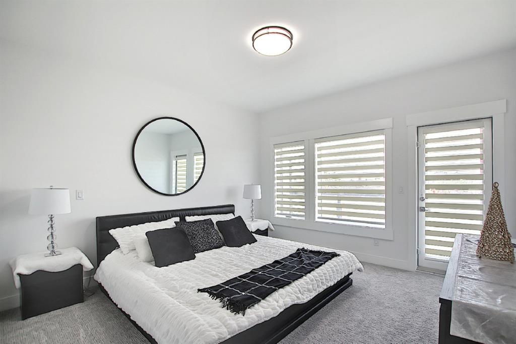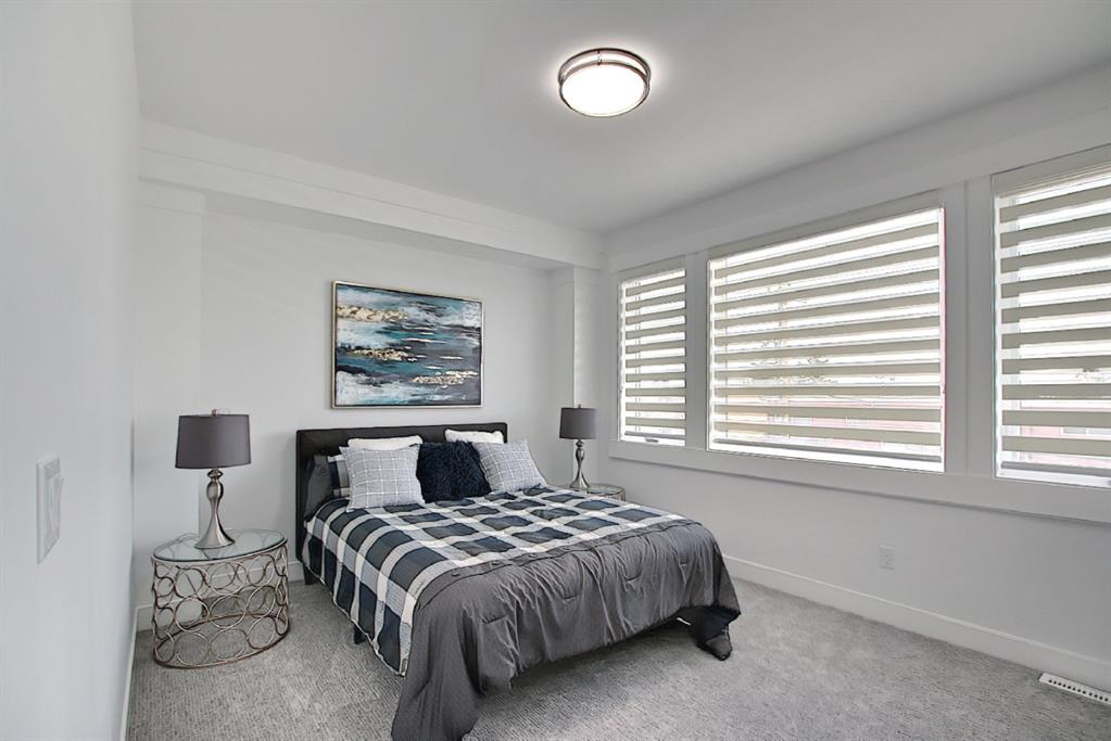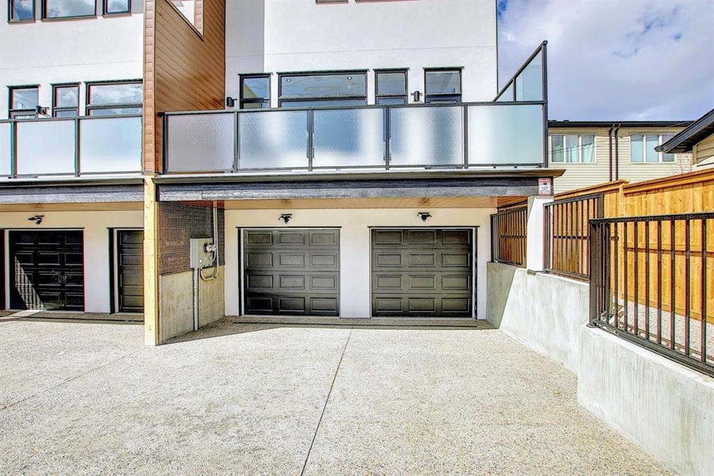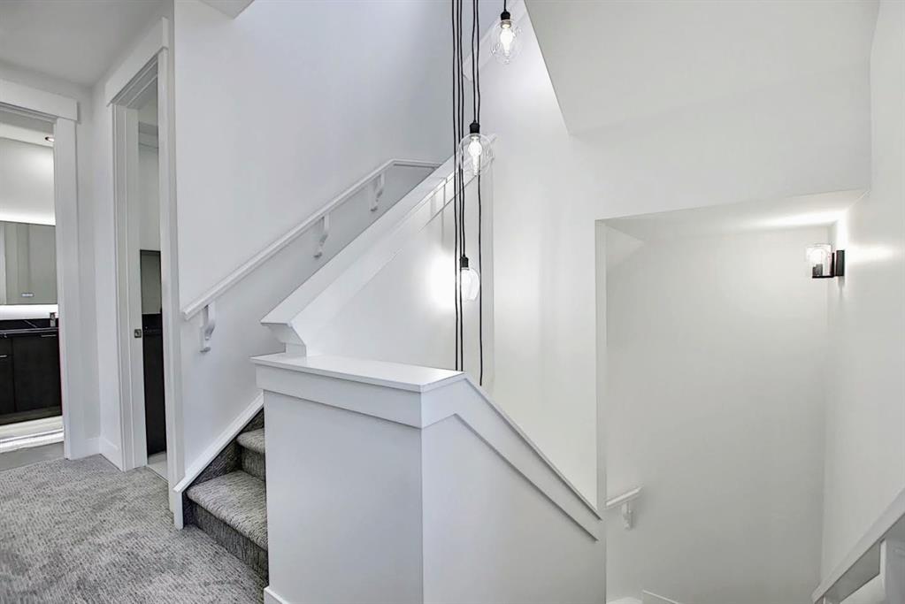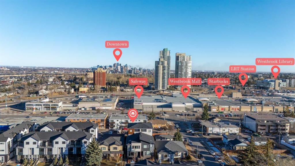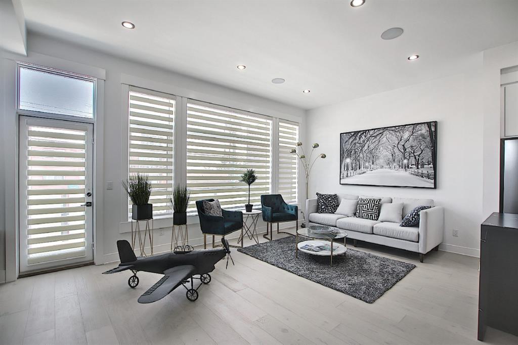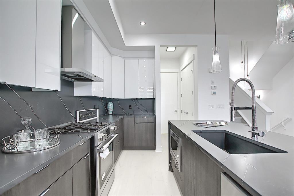 This upscale 3-storey dream home is centrally located on the Westside of Calgary in the inner-city community of Rosscarrock. The unit is located on the back Northside of the building, offering 2125 sqft of developed living space with both views of the community as well as downtown Calgary. It’s M-C2 zoning make it uniquely suited for home-based businesses or a work from home lifestyle. Main floor features a spacious open concept layout with 10-foot ceilings, large windows draw in natural light and stunning engineered oak hardwood floors. Gourmet kitchen is equipped with a European Blomberg appliance package, premium quartz countertops/backsplash, and a large island with a double waterfall feature. The living area is centered around a gas fireplace with marble tile surround, leading to a large deck with a gas BBQ hookup. Luxurious finishes throughout include heated tile floors & sound-enabled backlit LED mirrors in bathrooms, solid 8′ doors and a built in Bluetooth speaker system. Second and third levels offer double primary suites and a third-floor flex room with its own wet bar and a private deck overlooking the community. The second-floor primary suite offers a large walk-in closet and spa-inspired ensuite (jetted tub, shower, double vanities). A second large bedroom and laundry room can also be found on this level. The third-floor primary suite features a private deck with downtown views and a gorgeous ensuite. Building is professionally managed, reasonable condo fees – move in and enjoy a maintenance-free lifestyle. Single attached garage is roughed in with an Electric Vehicle charging station + another parking spot on your driveway. No permits are required for additional street parking. High efficiency furnace, tankless hot water system, central A/C + humidifier. Impressive curb appeal with high-end modern exterior finishes & architectural design. This incredible home is located within a few minutes commute to downtown Calgary, steps from major amenities including Westbrook Mall, Starbucks, Safeway & Walmart. Steps to Westbrook Mall LRT Station and major transit routes. Located within proximity to a Nicholls Family Public Library, Shaganappi Point Golf Course, an aquatics center, bike & walking paths, schools and local shops and restaurants.